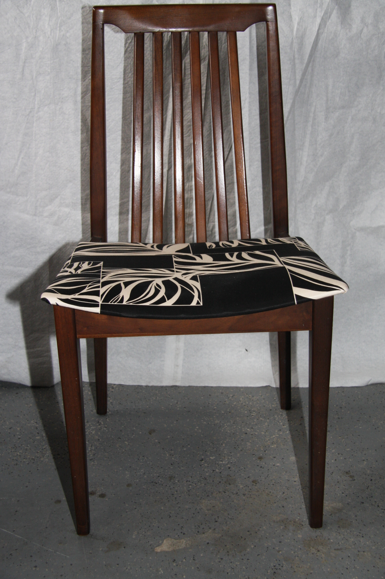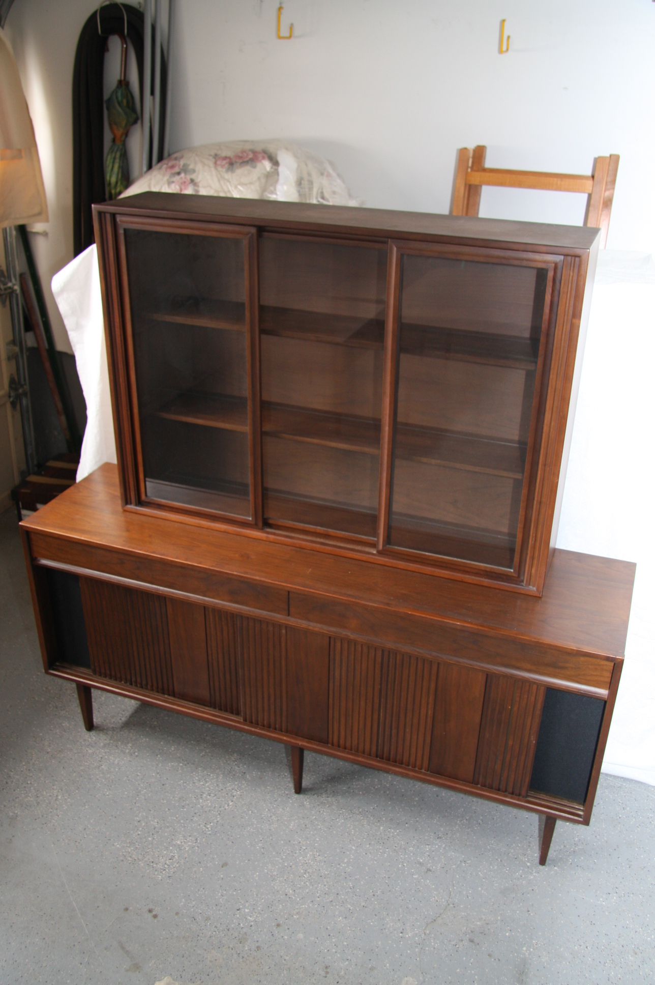 Made by Honderich Manufacturing in 1960; Each piece stamped with Mfg. name and numbers. Appears to be Mahogany with Cherry or "Danish" finish. Minor scratches as might be expected but condition is excellent. Table can seat 4 or when expanded can seat up to 10; comes with 6 chairs. Two inserts of 17 1/2 inches each, can be put into the table together or individually. Sliding glass doors on the hutch cabinet, grooves in the cabinet shelves for standing dishes upright. Sliding doors in the lower hutch - two original door panels were missing as a result of an earlier move, the space at each end of the lower cabinet have been replaced with a wooden panel upholserted in black speaker fabric. The lower hutch unit has two drawers for silverware etc.