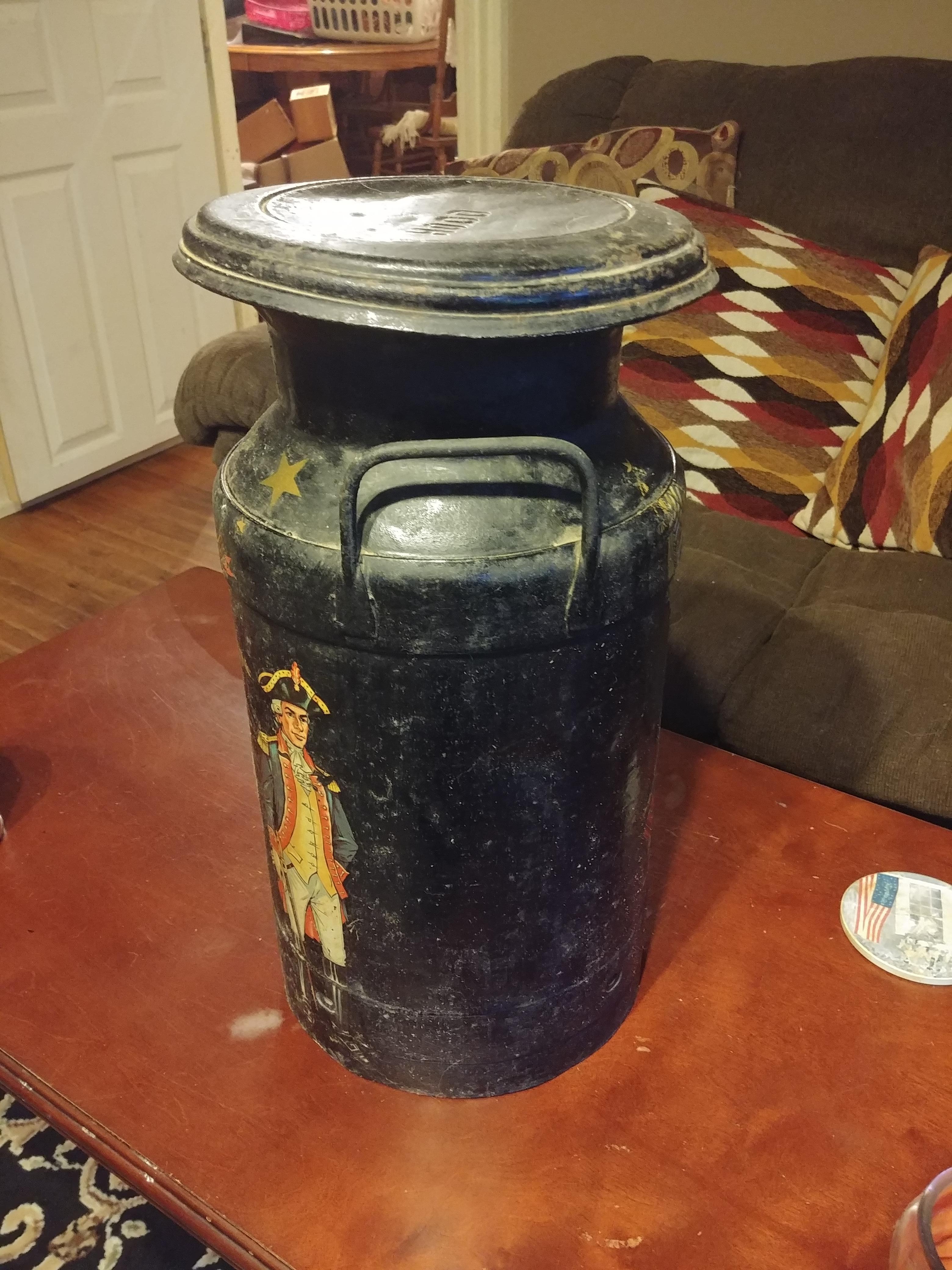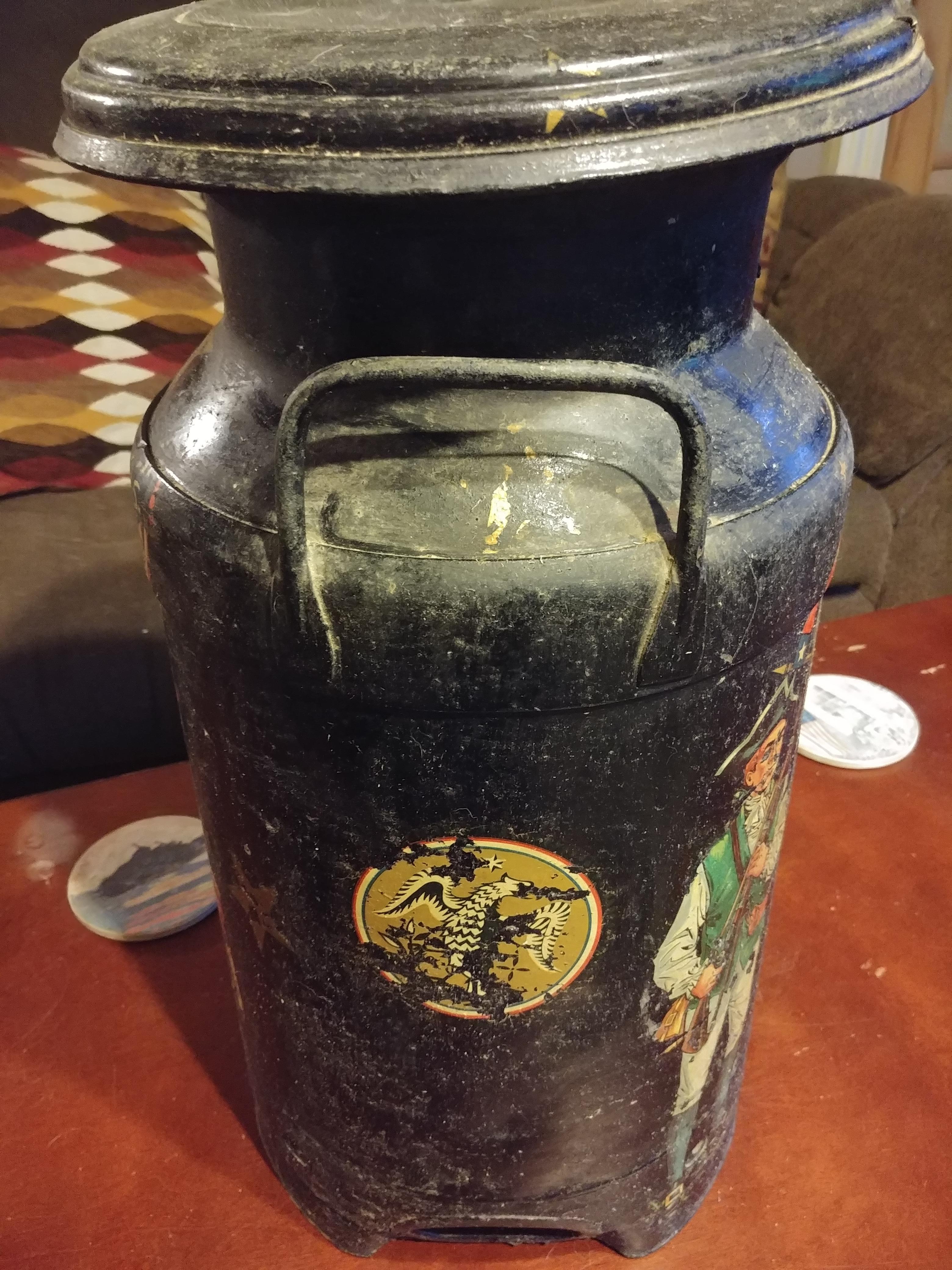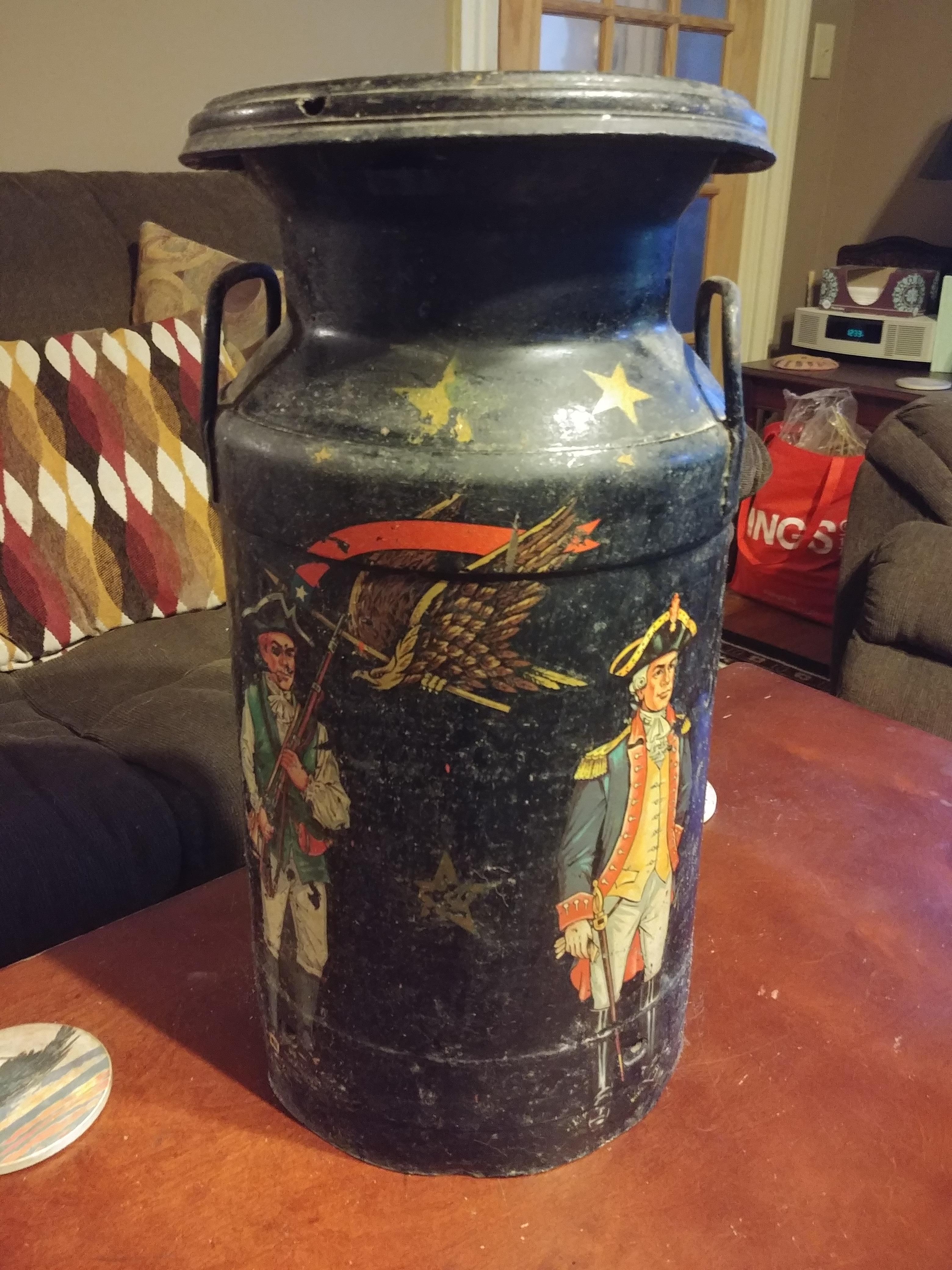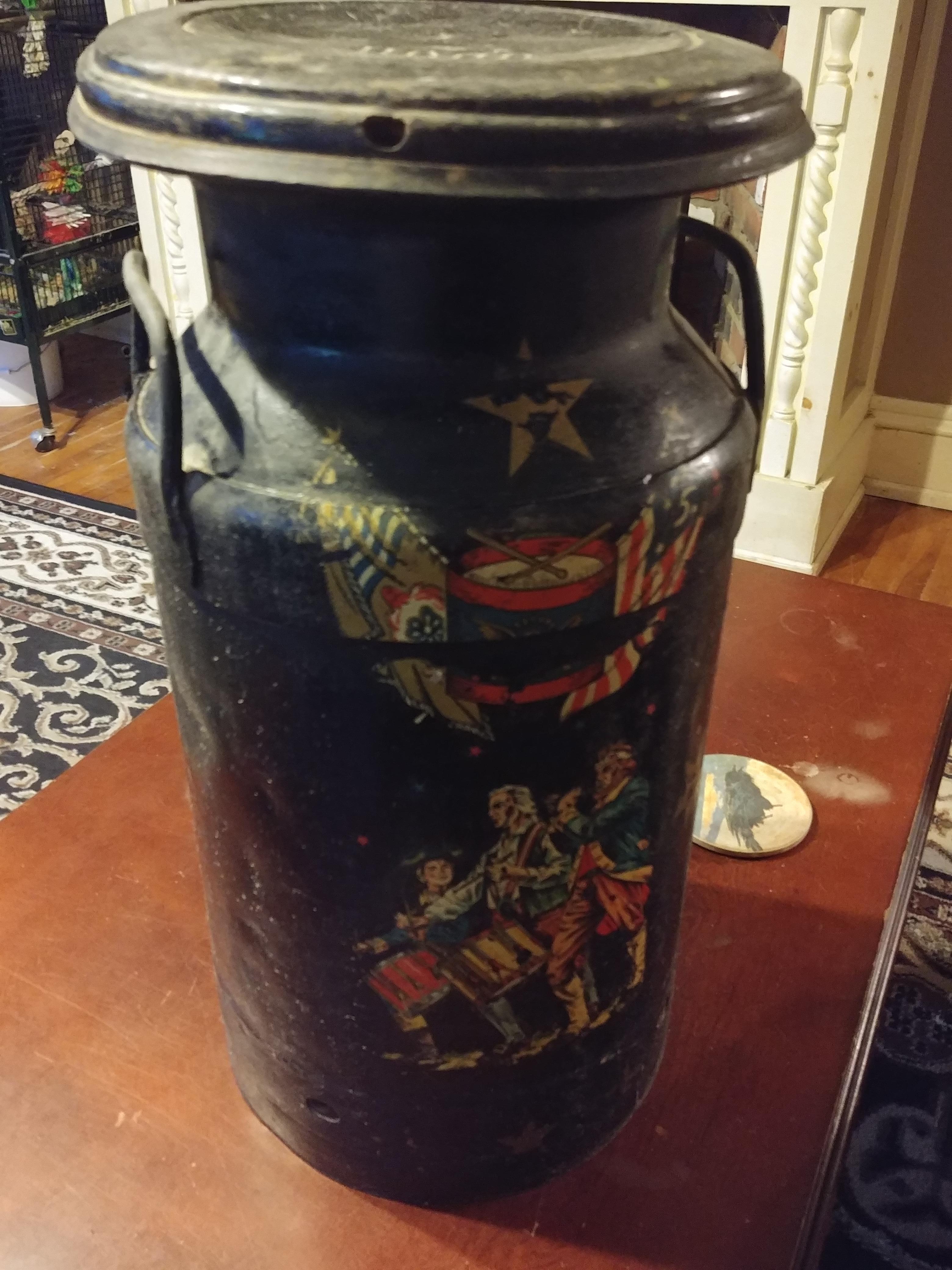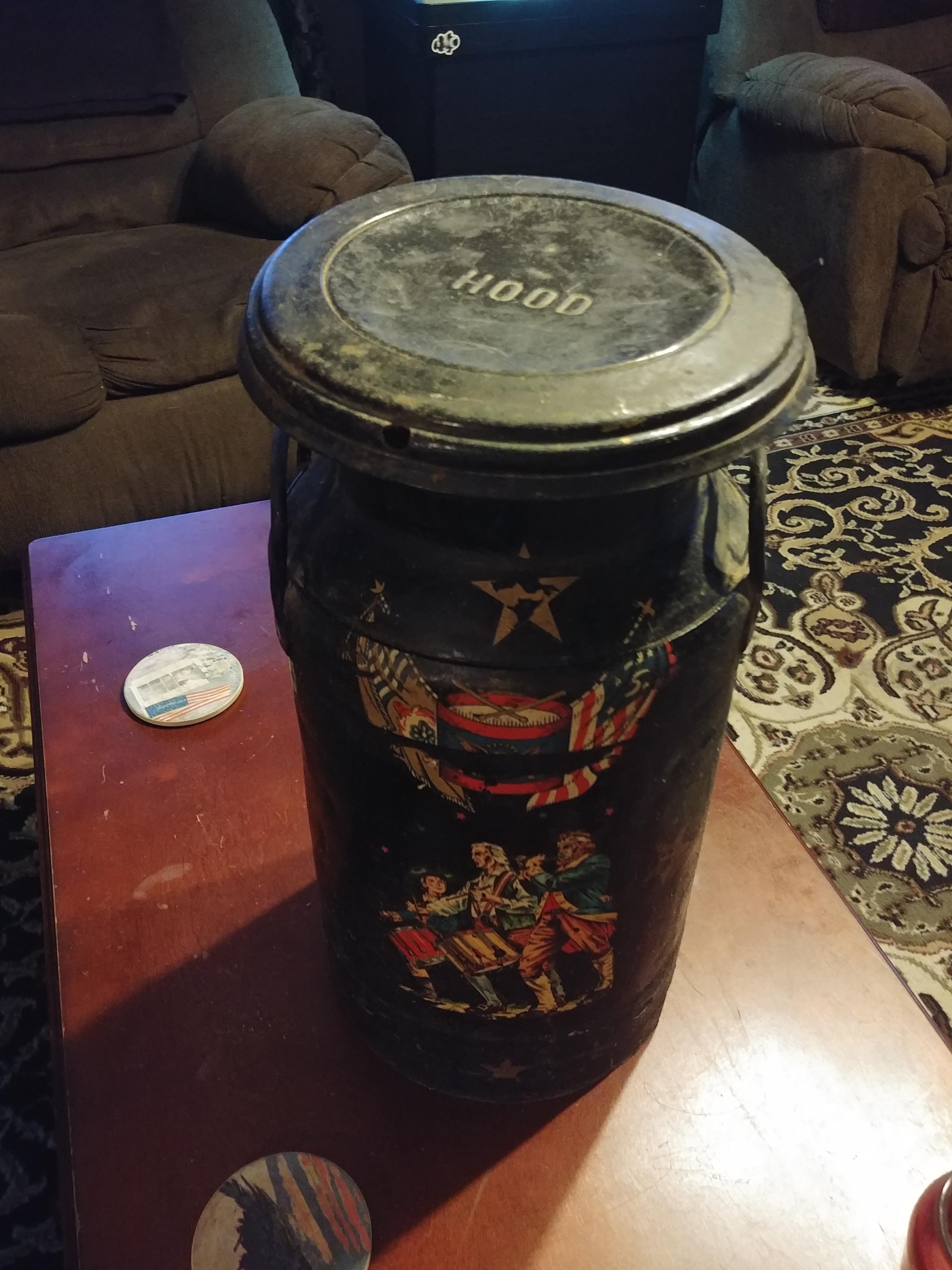 Hood metal milk can. Painted with soldiers, eagle and stars