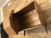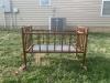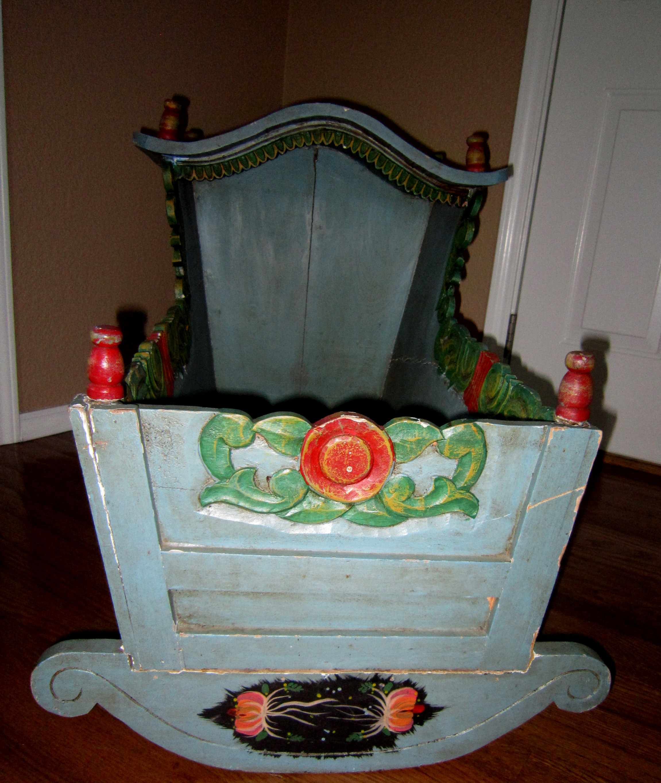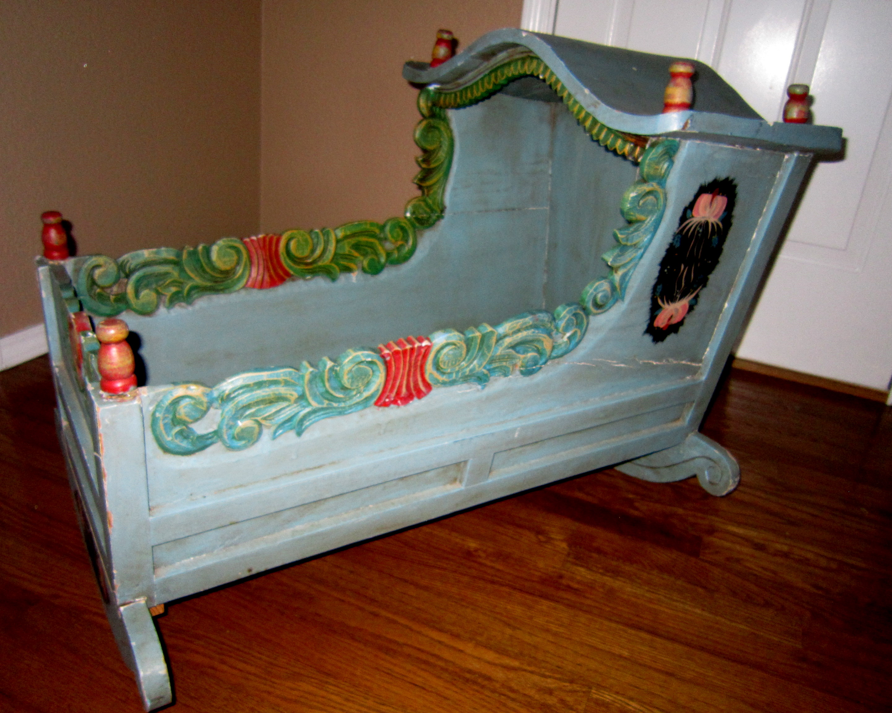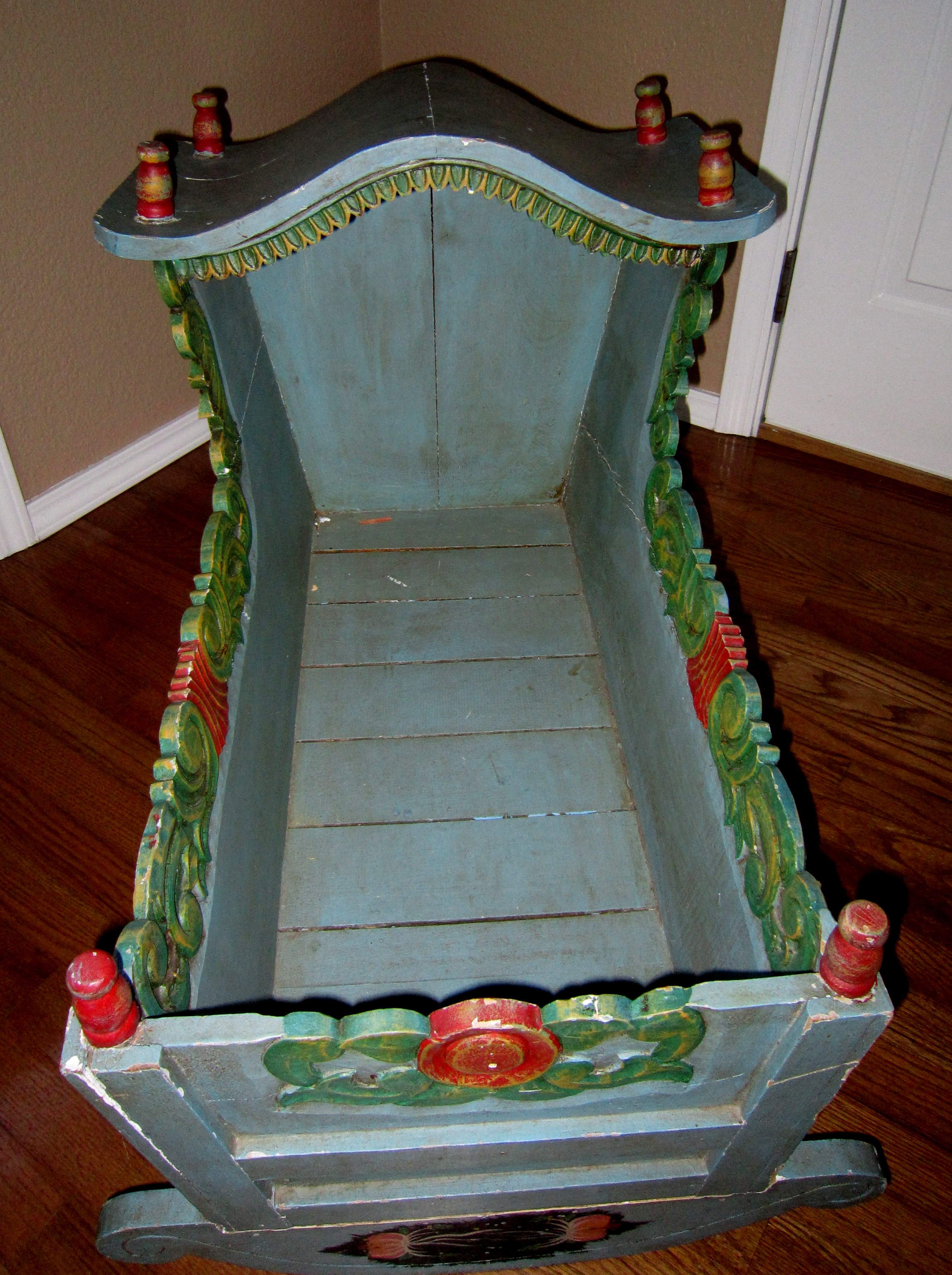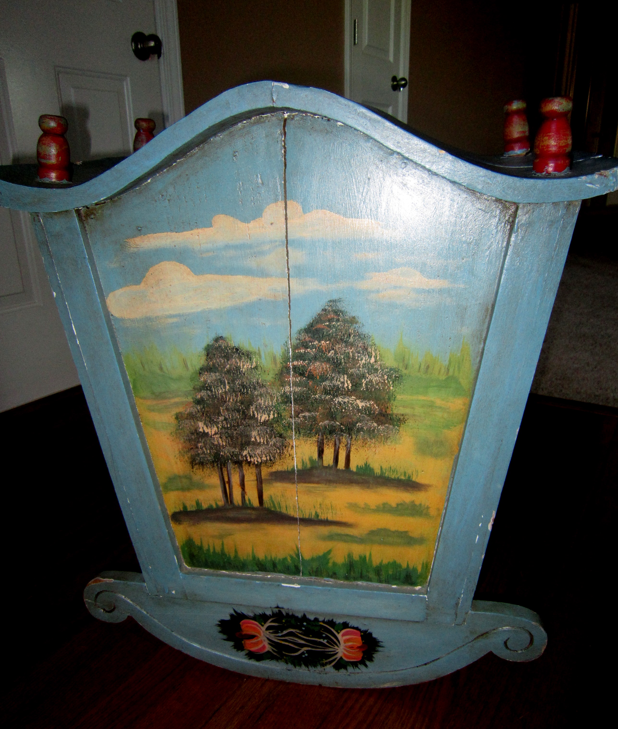 Blue painted cradle with hood, on rockers, carved on sides and top with a mural of trees in a field on backside.