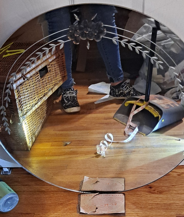 24" diameter round murror with floral etching across the top, no cracks or chips. Backing and mounting hardware missing