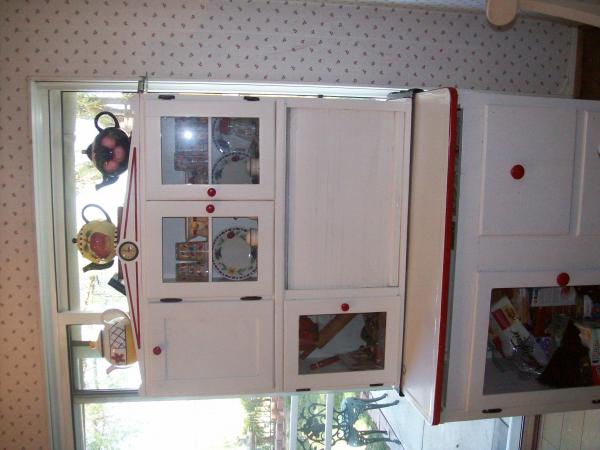 Red and white hoosier. with vegetable drawer, pie keep, flour sifter, enamel top is in very good condition.