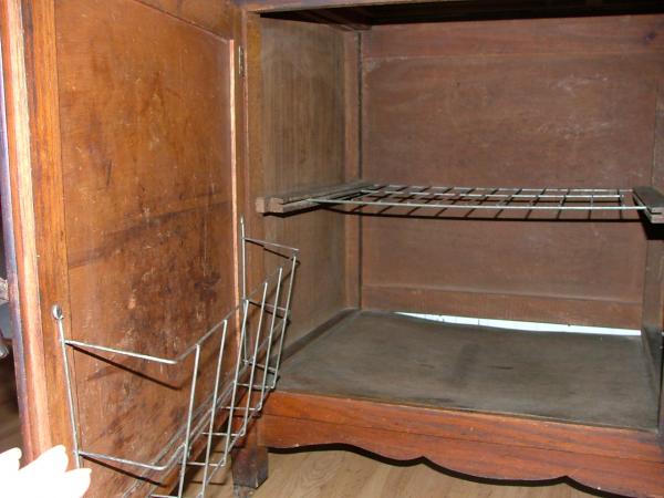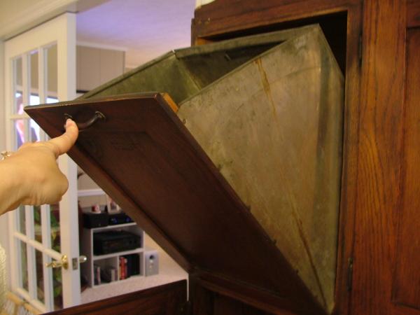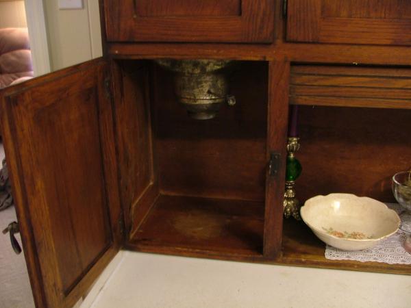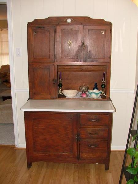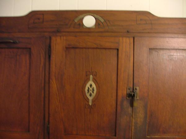 Notice the detail painting on the top of hte cabinet and the decorative trim piece across the top. Item still has original finish and hardware, no damage to the item. The finish is wore in some places, but wood is in great shape. The porcelain top slide in an out easily, but it does show signs of wear. In my opinion, the character of this piece is wonderful.