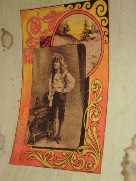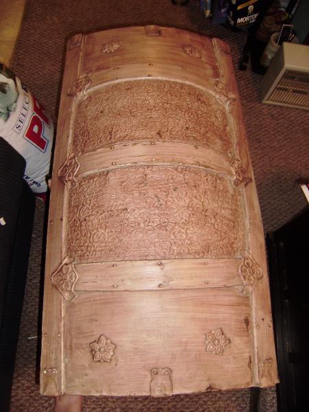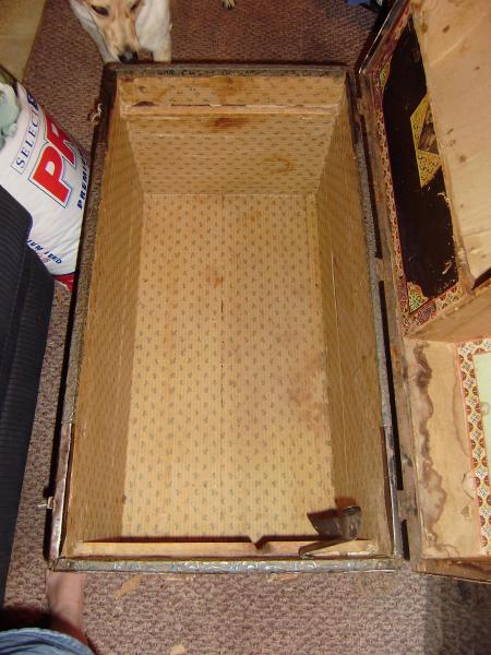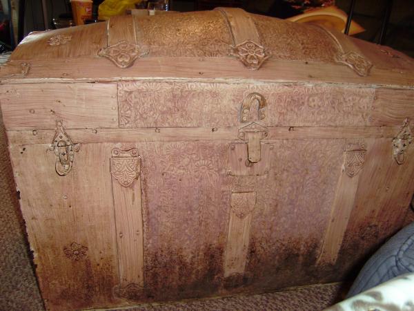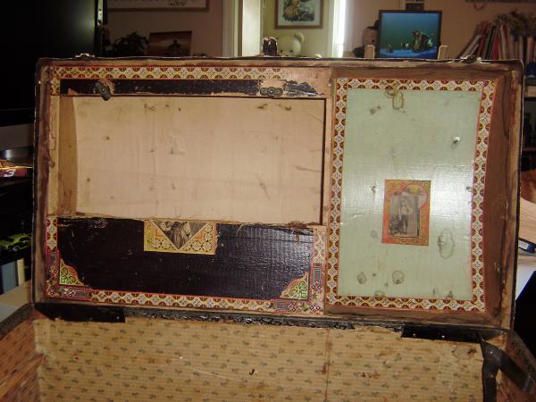 Old wooden trunk.Inside has white paper with blue flowers. Lid contains pictures and what looks to be a place cut out for a mirror. Leather straps on outside of trunk missing. Front contains three locks, broken. Very detailed work on lid and sides. I picked it up at a farmer's market in LaGrange, Kentucky for $25. I don't know the history nor the age. Would be interested in learning more about the trunk and its appraisal.