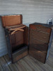 This is a black trunk constructed of "wood veneer throughout for strength and service" according to the tag inside. The tag also says "Horn Luggage manufactured by Rice-Stix - St. Louis, MO. The trunk has 1 removable divided tray that sits at the top of the inside area. The latches are in good shape also. The handles seem to be made of leather and are quite sturdy.
