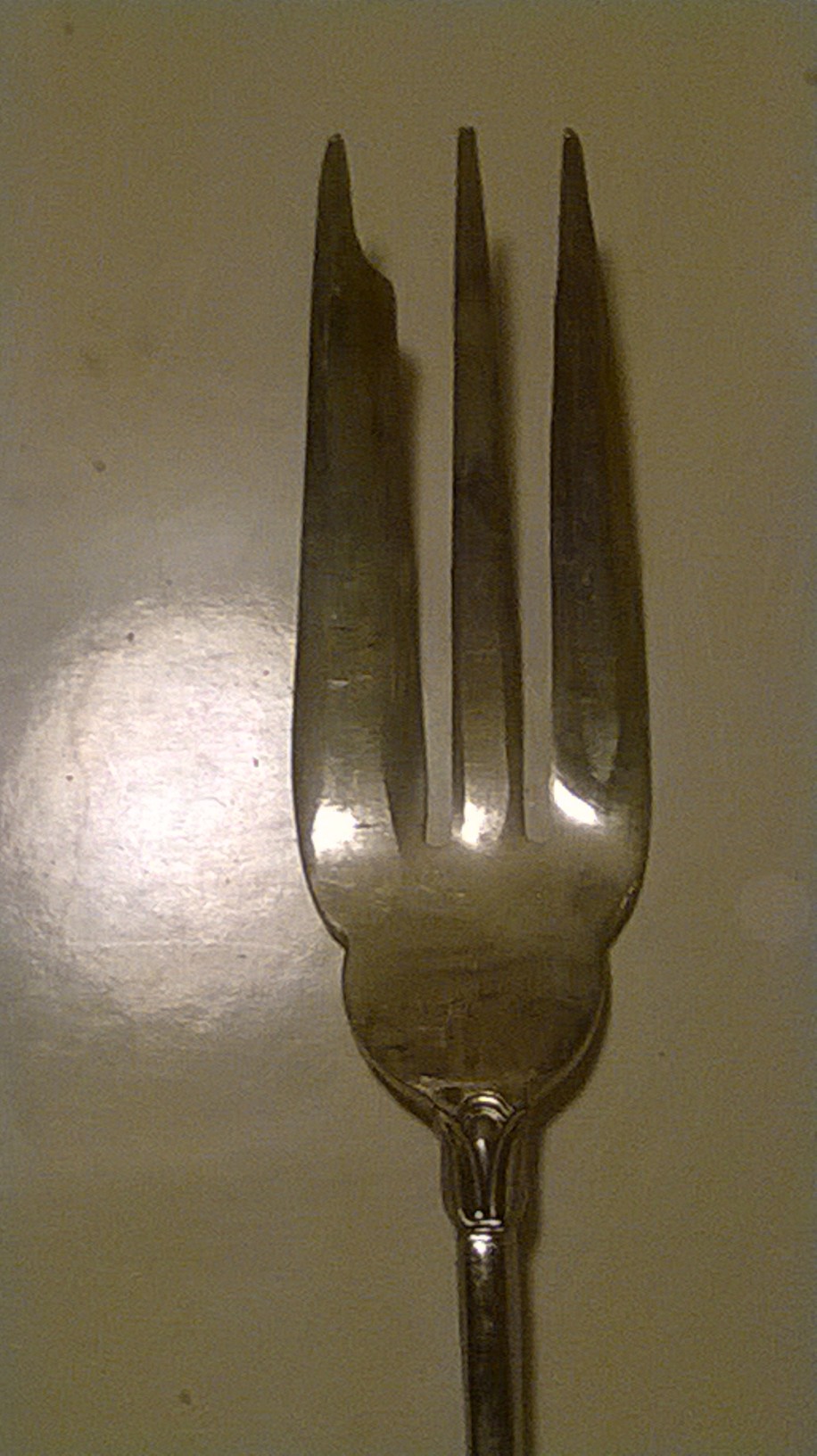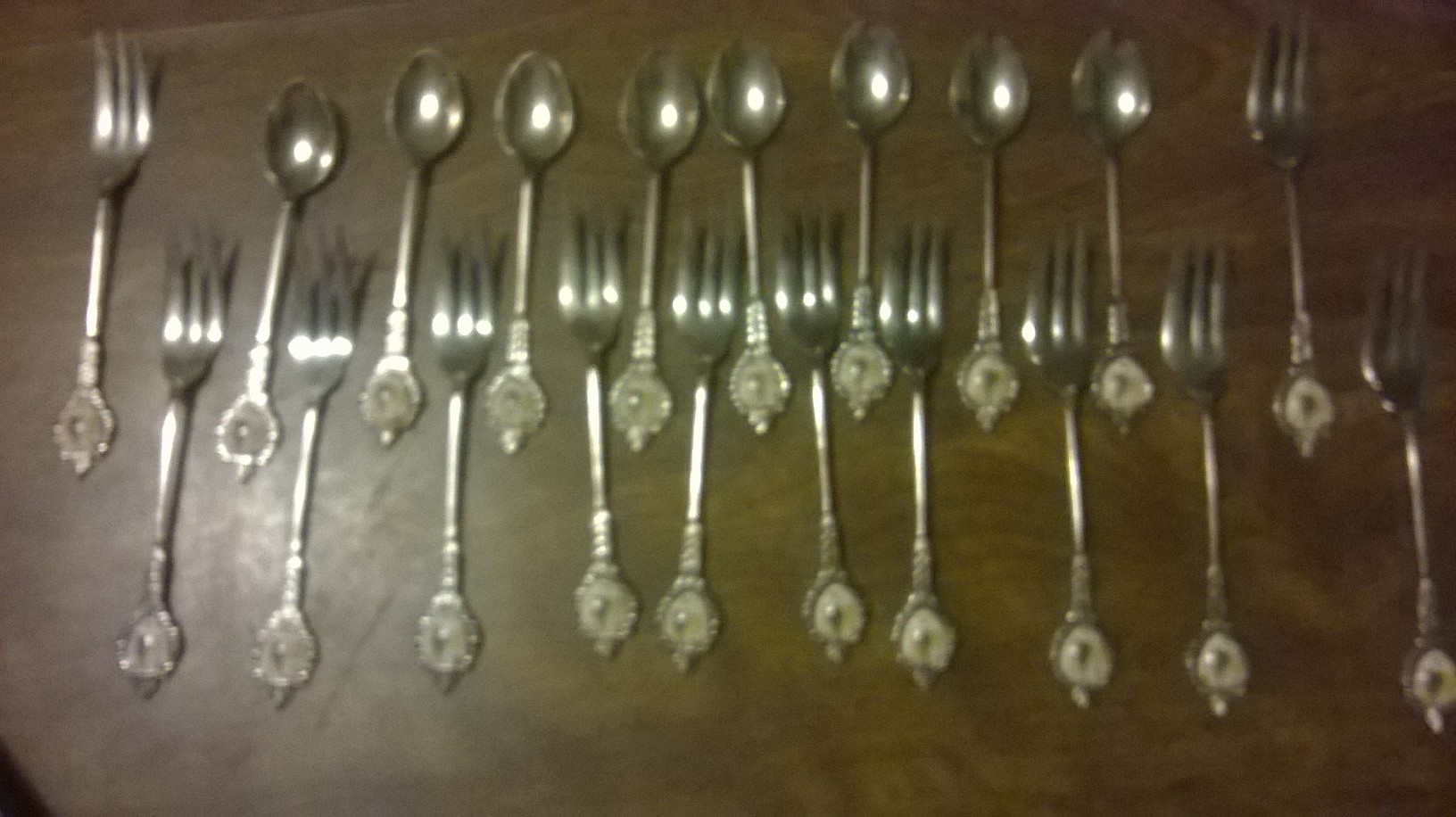 The forks are 3 pronged with the left prong having kind of an indenture in it.  I have 20 pieces in all, with 8 spoons and 12 forks.