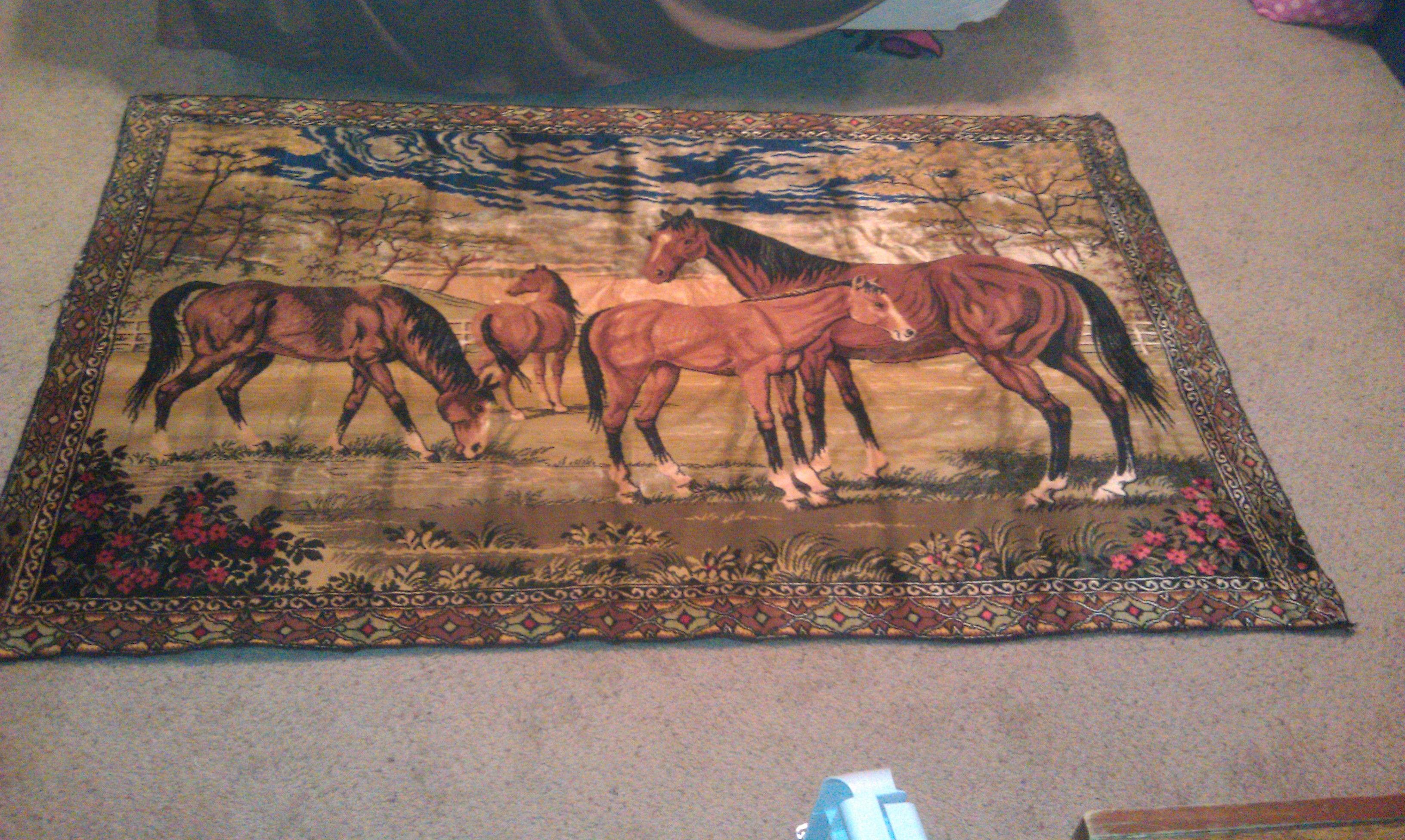 This tapestry hung on my parents wall all my life until they gave it to me. I will be 30 years old in October 2011 and this item is older than I am. I am not sure its exact age. I have found several replicas online although none match the exact markings of this one. The major difference between this one and the ones I've found online is the border around the edge of the tapestry.