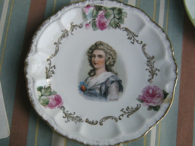 8 inch plate with Hortense picture in center (name printed by figure), three pink roses surrounding, connected by gold filigree design. Gold trim on edge of plate. Back signature is RM surrounded by wreath and topped by a crown, "Bavaria"