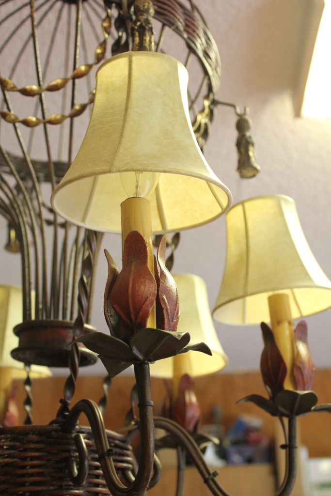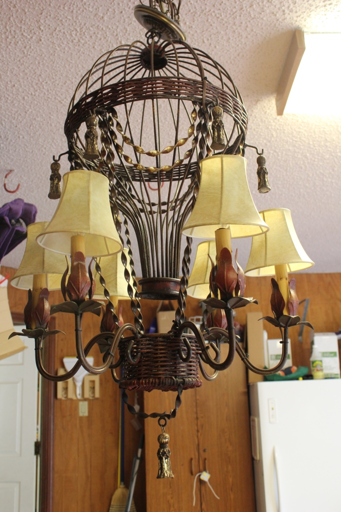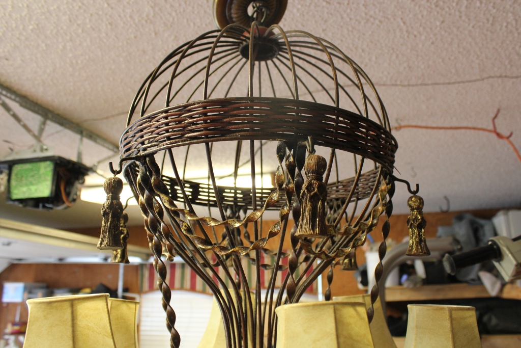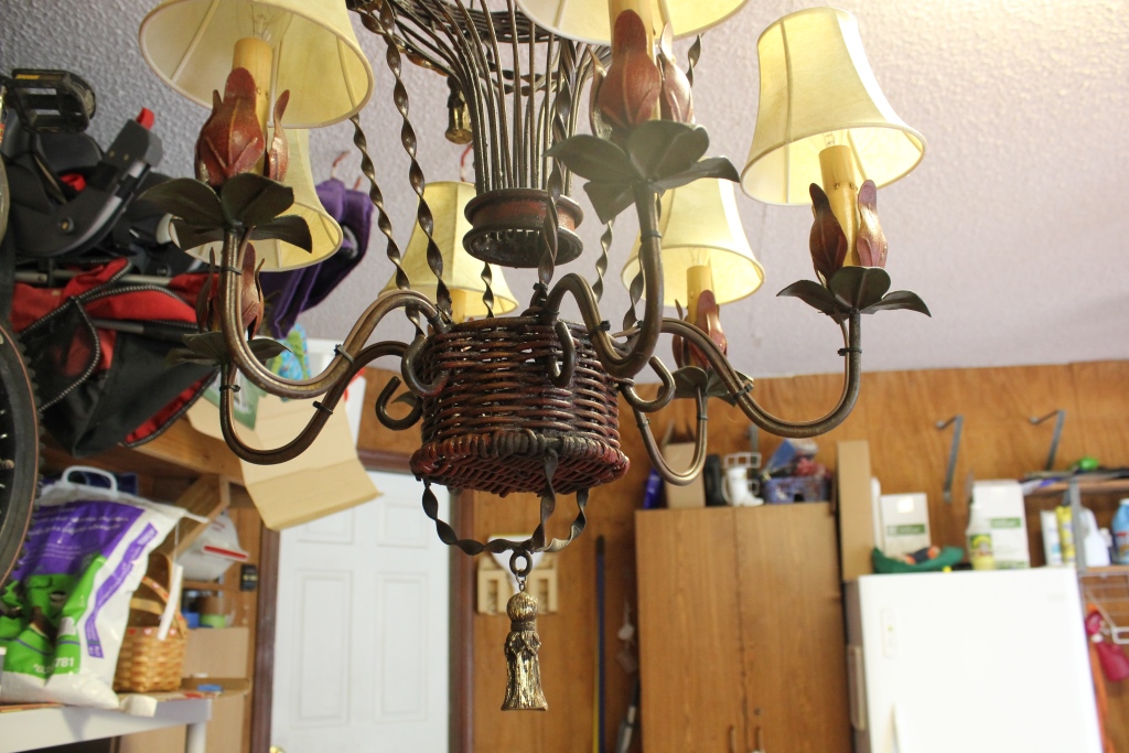 Hi, someone was giving this away because they really disliked it,I though it was adorable so they gave it to me for free. Came home did a little research and cannot find one like this anywhere on internet only ones similar. Not really looking to sell, but would love to know if it has any value and from what time period would it be from. Not sure if it is vintage or not, but it is in really good shape, has been rewired or is a replica of an older one because the wiring that is on it is not from a vintage time. The shades are not paper as I would guess an older one would have, but more of a vinyl type material. May or may not have been repainted, I do not know. No markings to identify. All tassels are there. It appears to be a mixture of wicker, iron, and not sure what the tassels are made of. They are very light almost like plastic, but I do not think that is what they are made of. Hope I provided enough information you are able to help. Oh, and it measures about 29" tall, not including tassel at bottom x 19" from tip of flower leaf to tip and about 13 pounds. Thank you, Christine