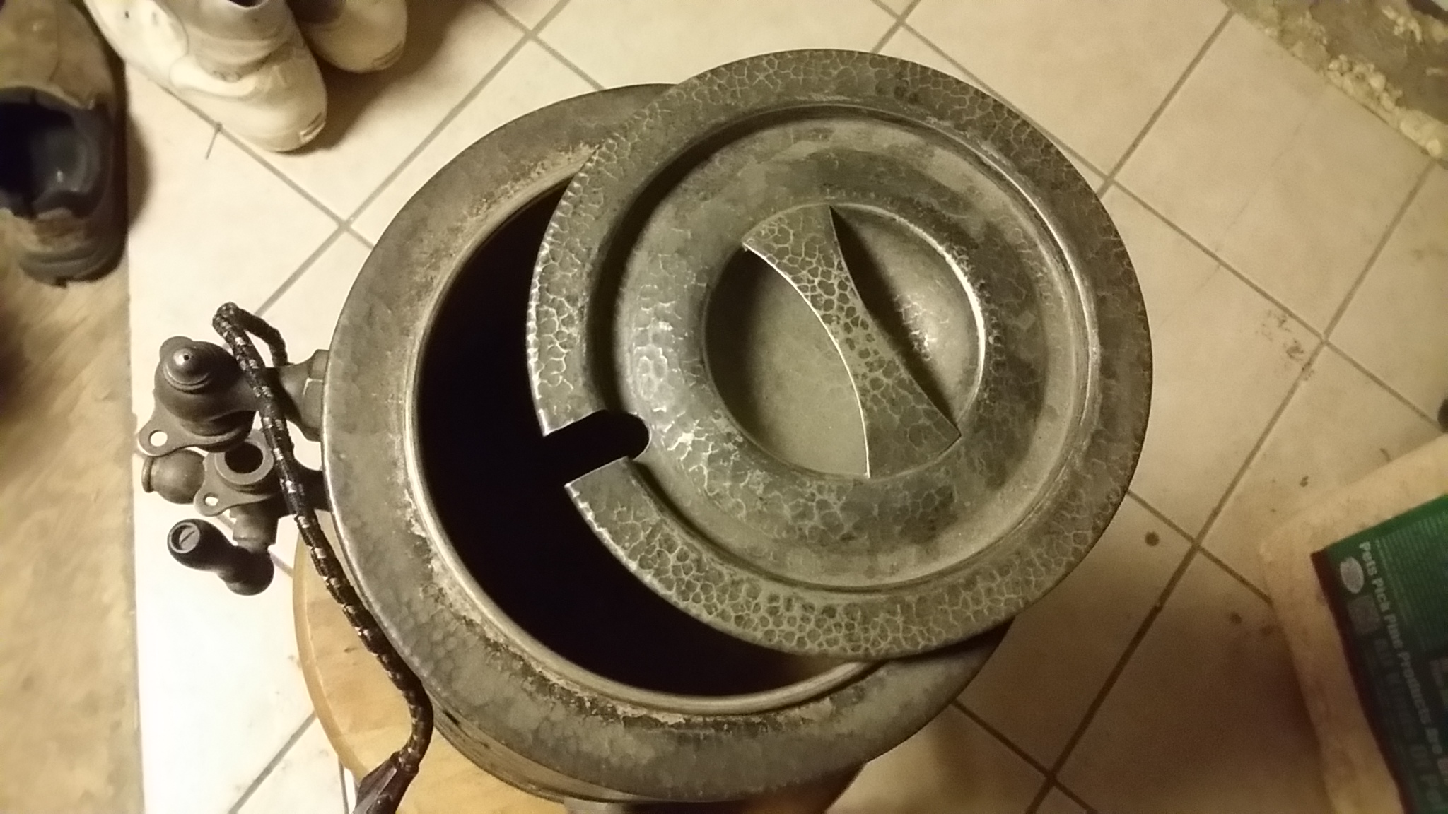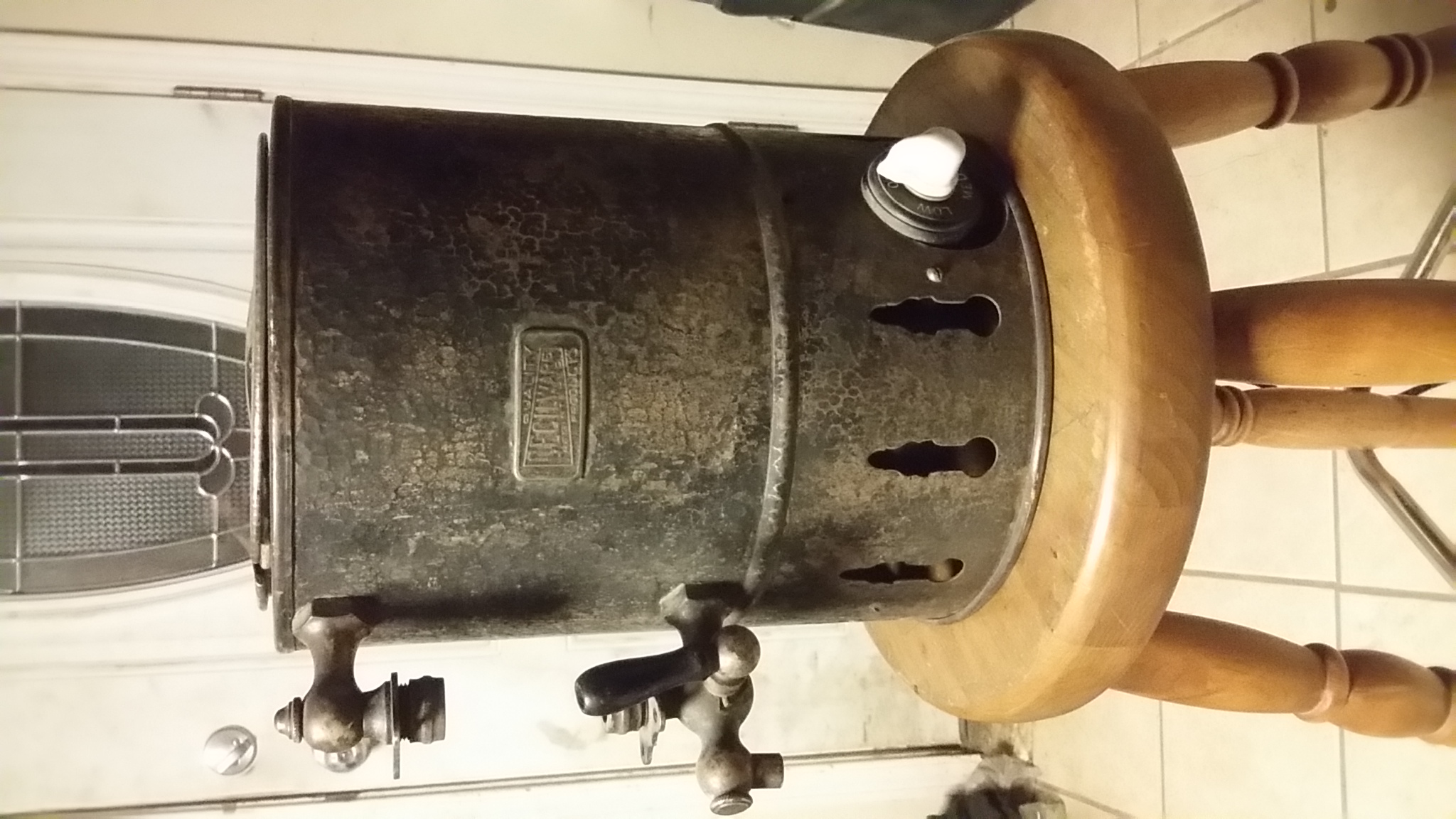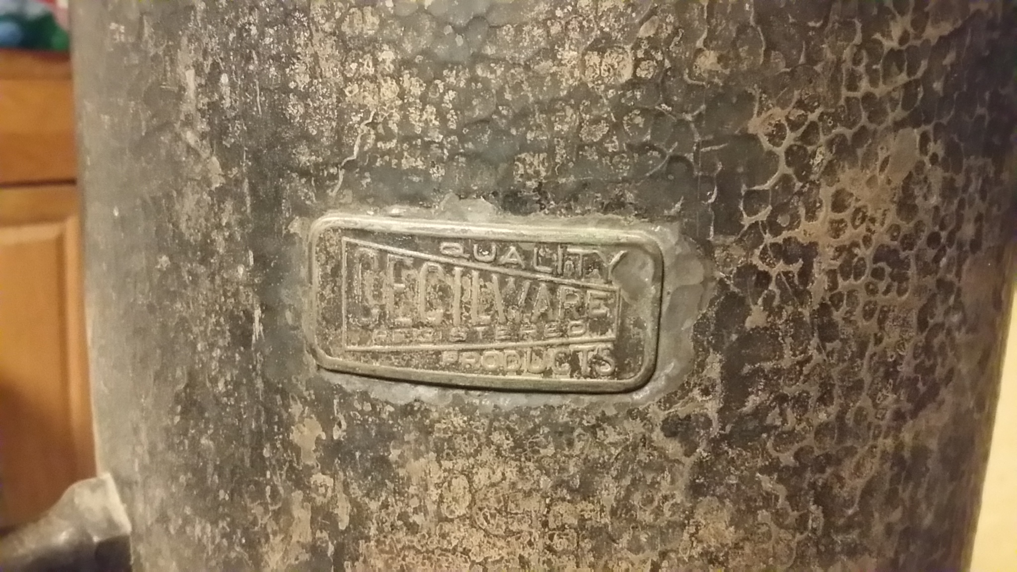 I am trying to identify this item.  I found a mug that had a similar appearance listed as Vintage Cecilware, Hand hammered silverplate?  Has an older 2 prong electric plug, stands 12 inches tall and has a 9 inch diameter.  The lid has a slot as if for a soup ladle.  Thanks and have a great day!