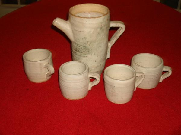 This is a tea set that I bought at a yard sale in Lancaster PA. The Hoyer signature matches the signature found on Hoyer dolls. The tea set consists of pitcher and 4 cups