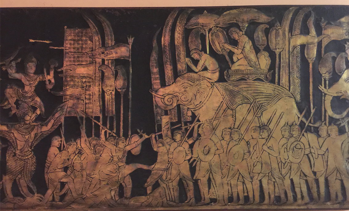Im not sure the hustory of this huge war scene it shows gods, and war elephants and archers, and is a beautiful war scene, the painting/etchin is huge, the gold figures are raised on a black background, the painting measures 9ft by 2ft 4inches, please let me know what it is and where its from, thanks