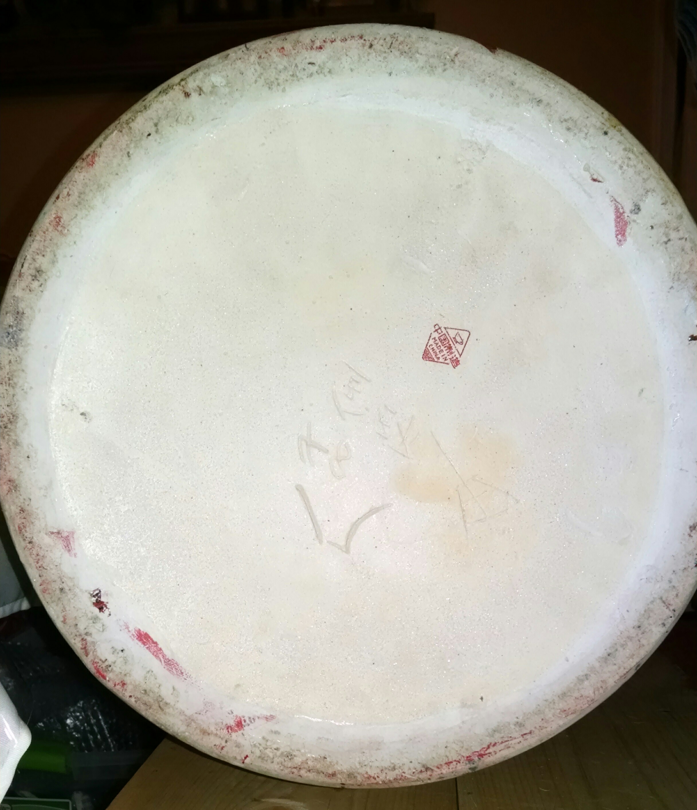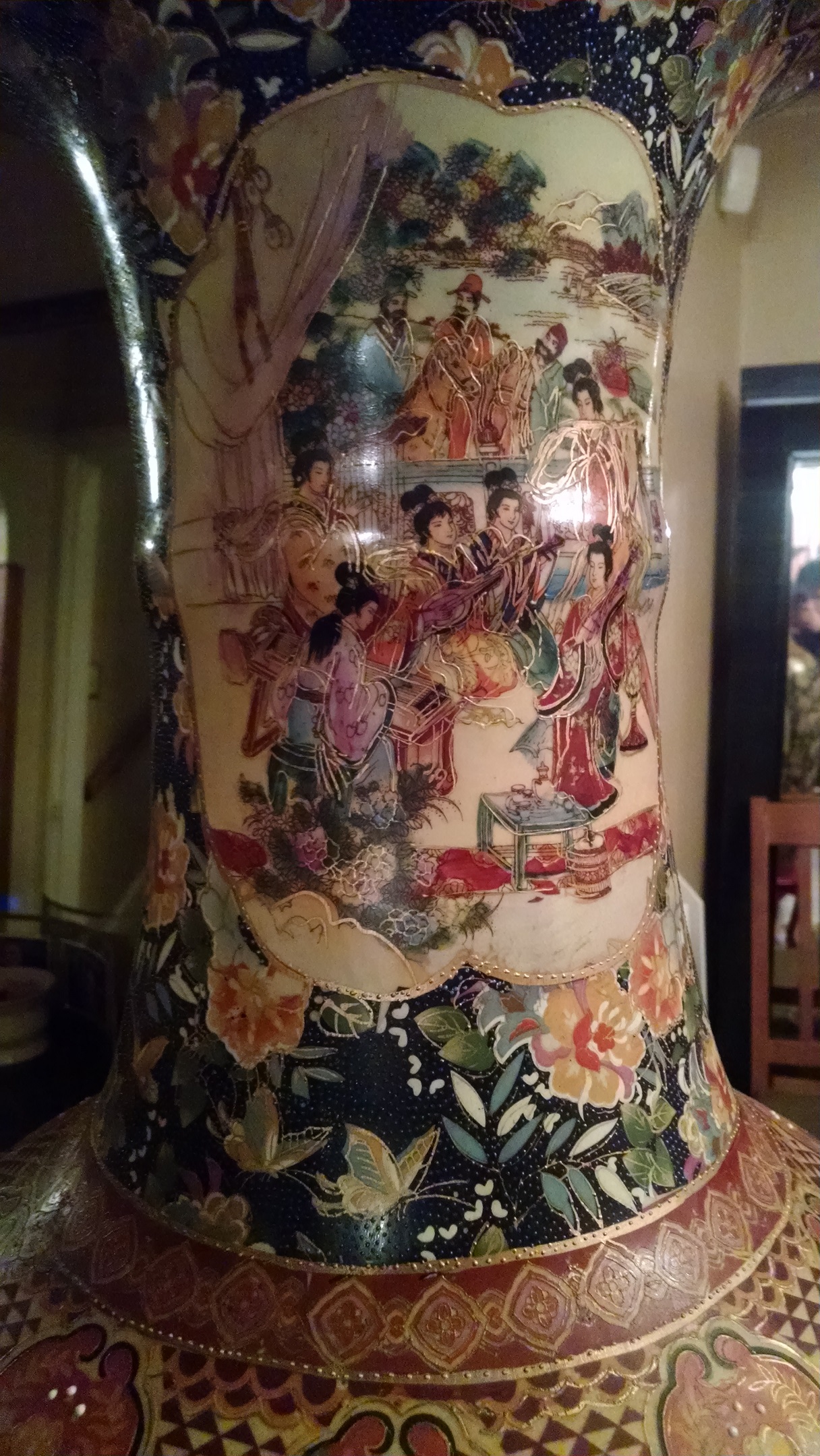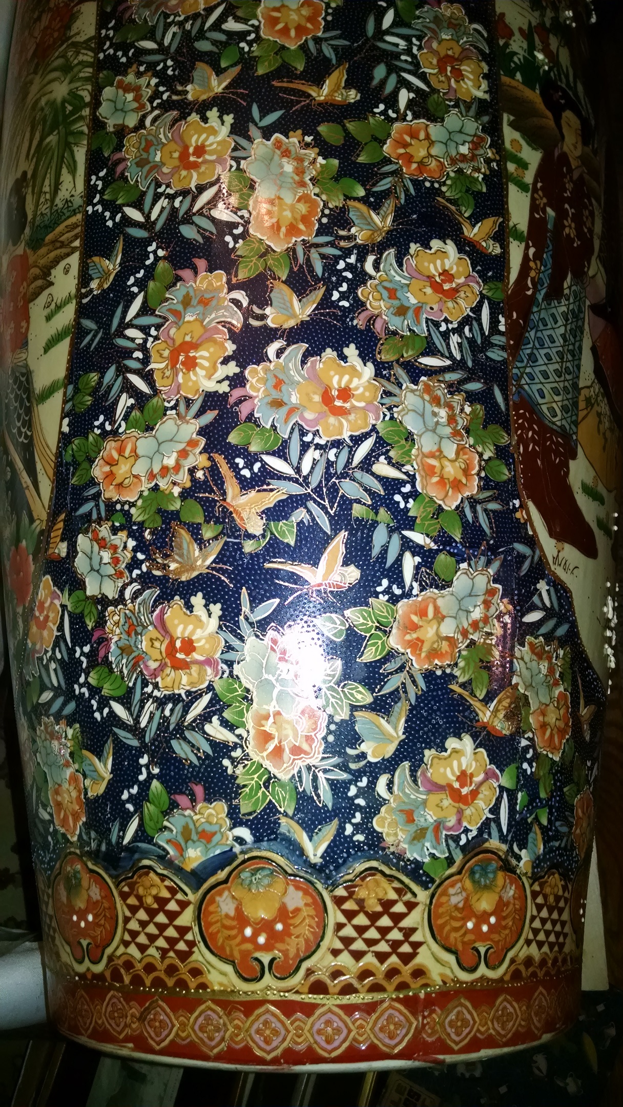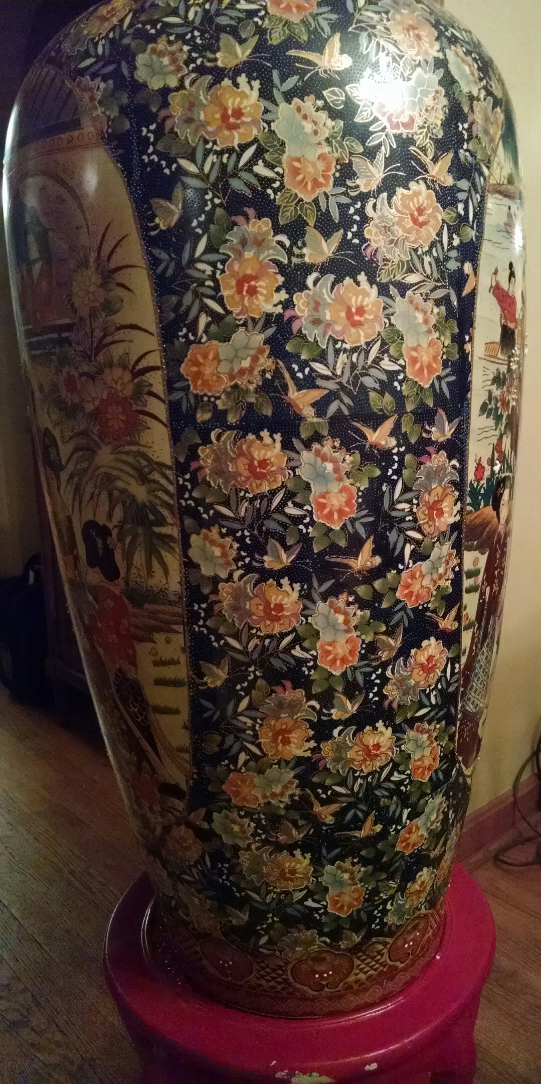 I have a very large Oriental Porcelain Palace Vase/Urn. It is 48" tall and is very heavy. The top rim is 12". The condition is very good with no issues. There is gold trim outlining many of the scenes. It has a stand that is made of wood and wicker. It is beautiful with extreme detail.