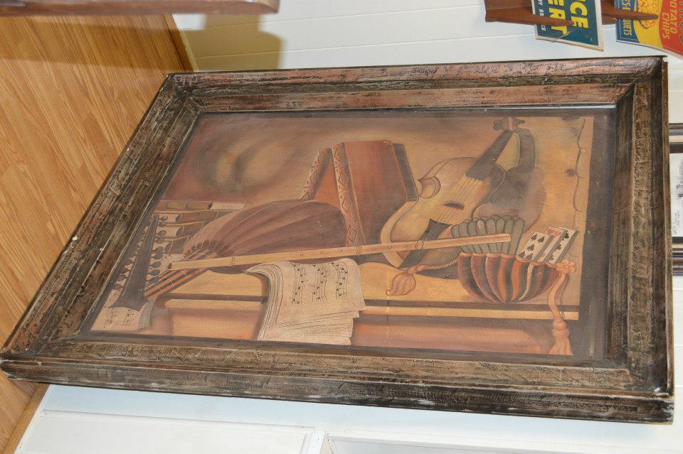 A huge painting that is a still life I guess and it has a violin, sheet music, 3 playing cards, a bunch of things on a table.  It has a bowl on the right corner with a tassel that is running off the picture.