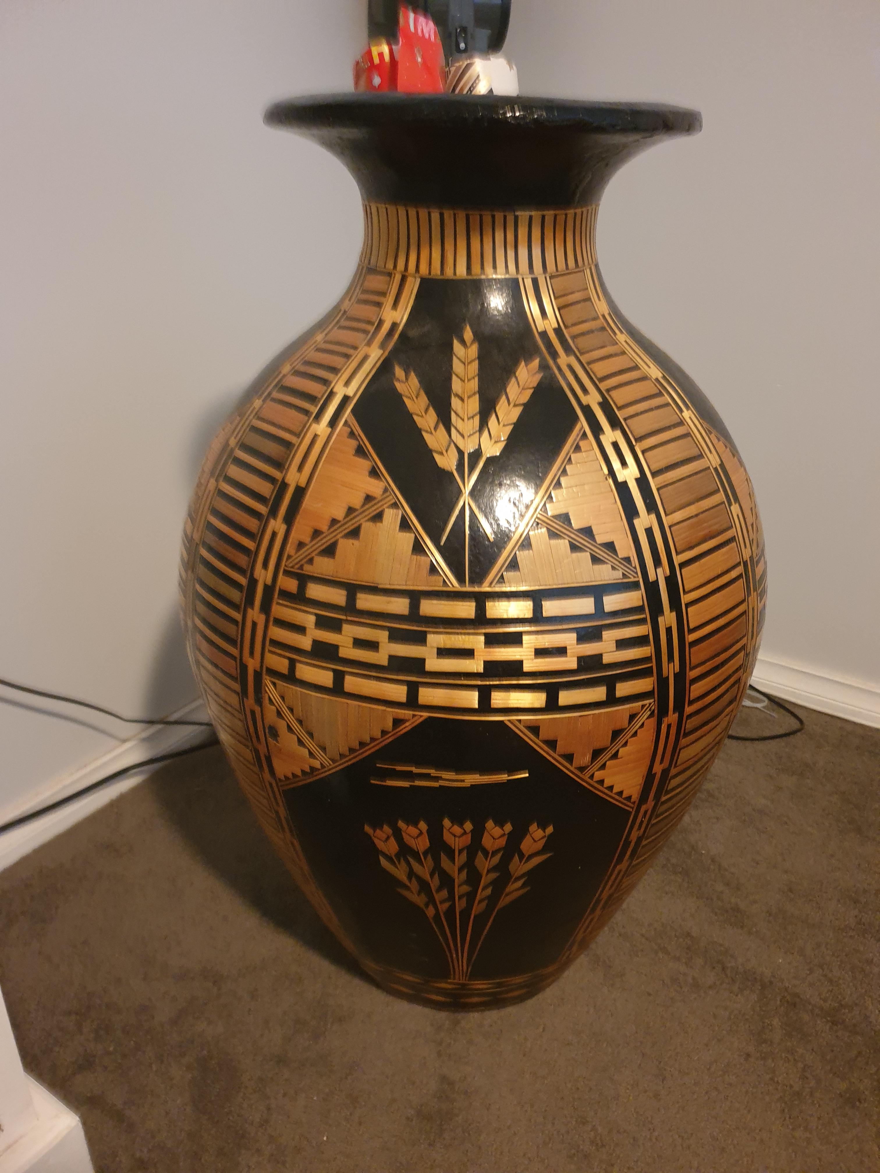 No idea what this is. Its jist always been in our family. Its like a big vase looking thing, very heavy. Intricate patterns. I remember my parents telling me when i was very little that the patterns were made with matchsticks. No idea worth or origin. Any ideas would be much appreciated.
