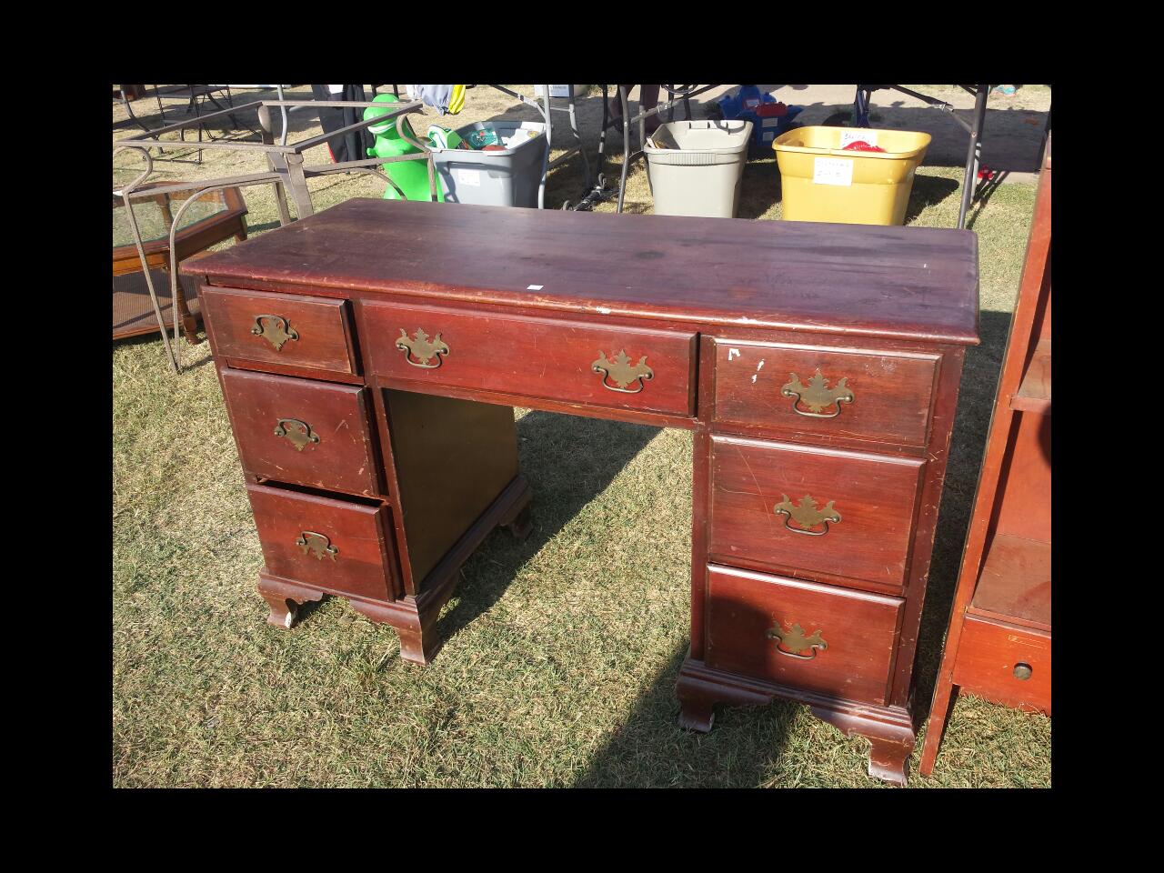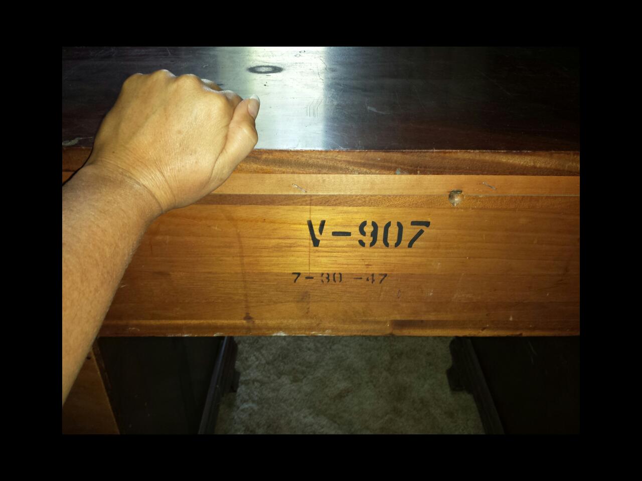 I have a solid mahogany desk with a date stamped on the back of 7-30-47. At least I think it is a date. Right above that, it has v-907. Inside the center drawer are tags, as shown in the photos. The brass hardware (drawer pulls) is all there in perfect condition. The desk is solid and sturdy. Unfortunately, it is badly scratched in areas and even has a couple names carved in the top. Also a spot that looks like a burn or something.