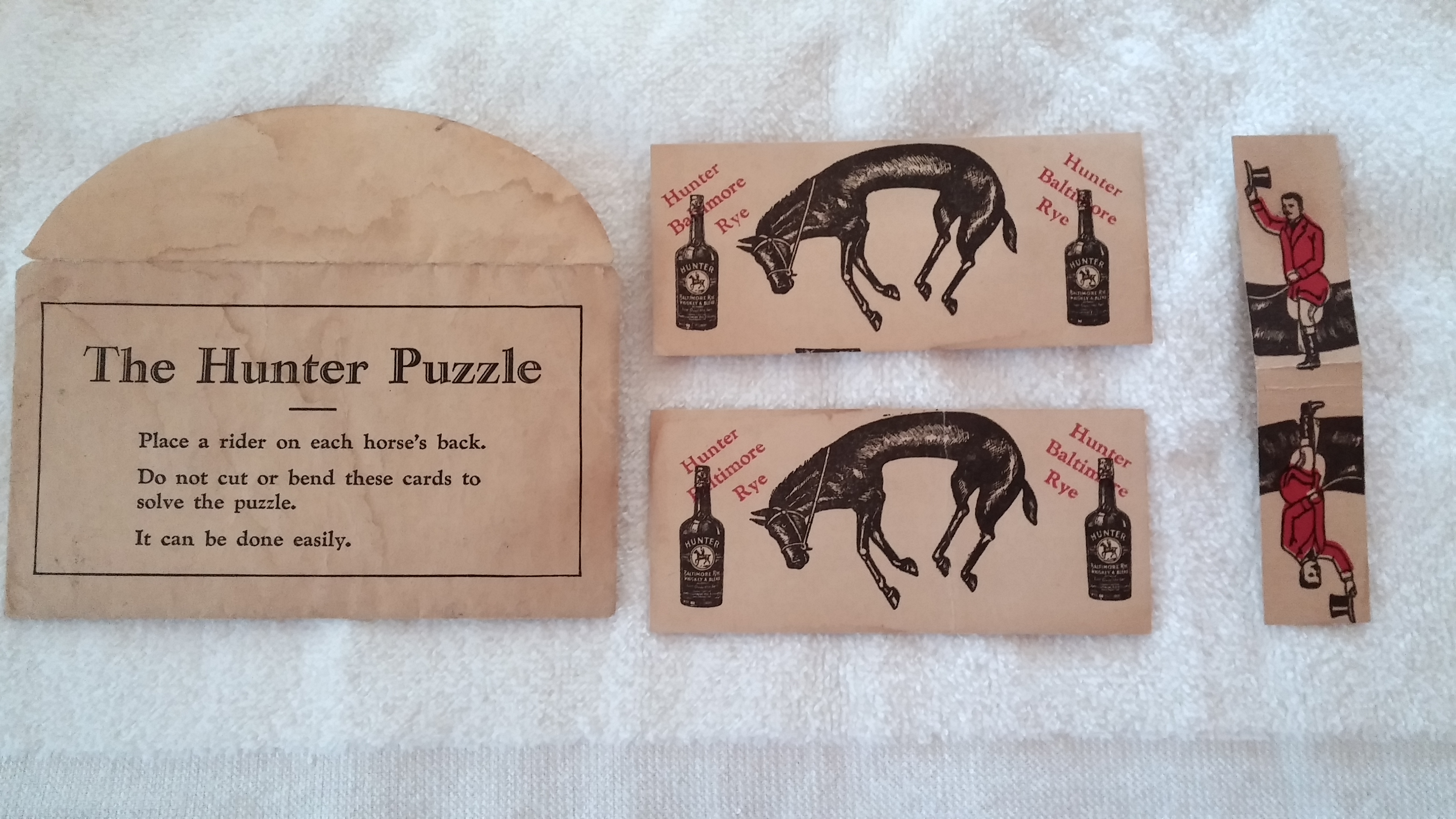 The envelope is 4-1/4 inces long and 2-1/2 inches high. The horse cards are 2-1/2 x 1-1/2. The rider card is 3-1/2 x 3/4. I have found a little info about the Hunter Baltimore Rye online, but I can't find anything about this item. I'm guessing it was for advertising purposes. I would be interested in it's value and possibly selling it, but would really like to know more about it first.