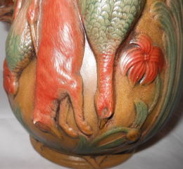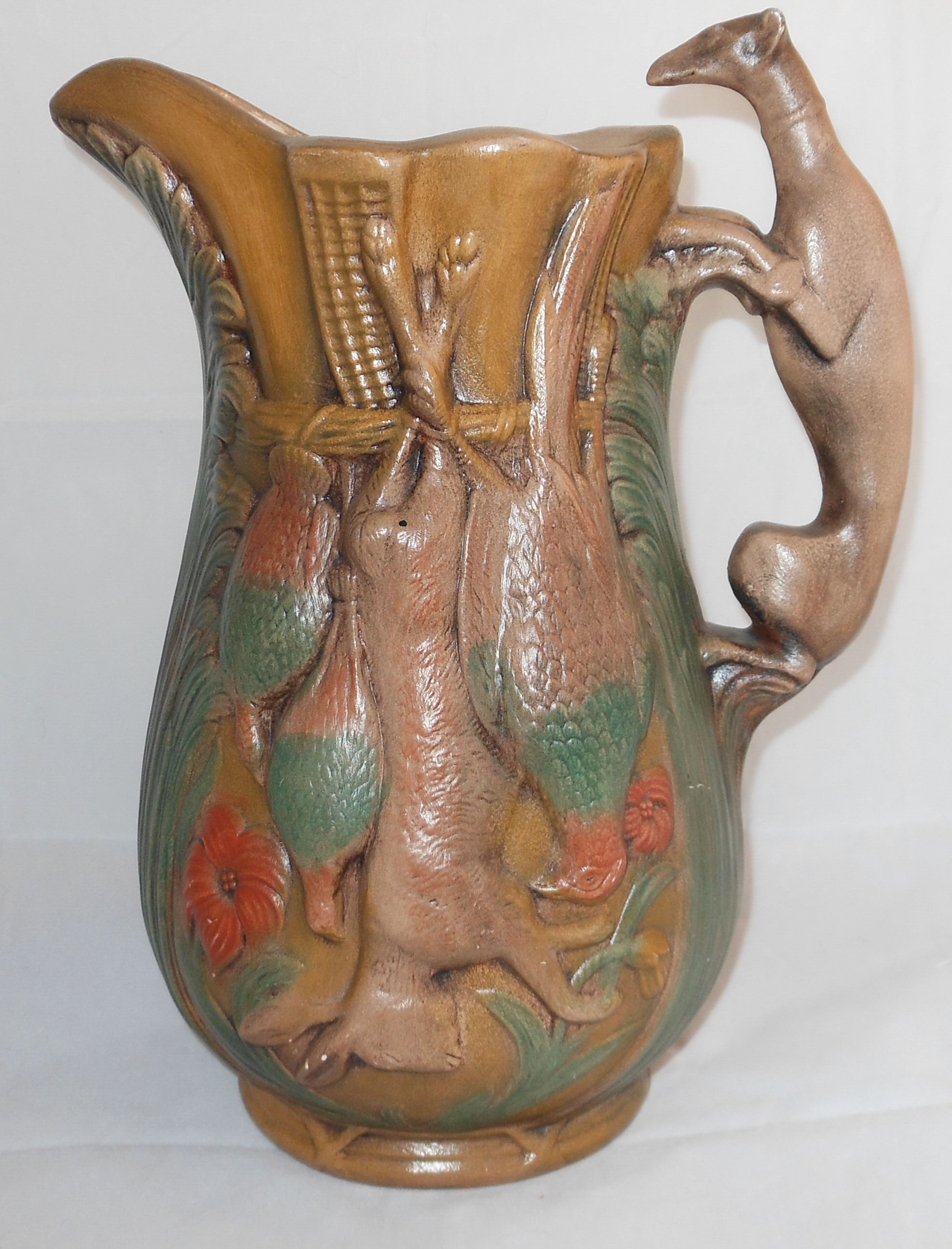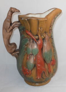This is a 9 1/2" pitcher, that appears to depict a" hunters kill". The handle is a Greyhound dog or Whippet. The body of the pitcher is hanging turkey, pheasants, rabbits and a fox among some flowers and leaves.