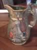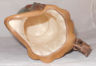This pitcher is done in brown dark green and red. The inside of the pitcher appears to be porcelain with some crazing. It is in very good condition with only a few minor blemishes in the paint..