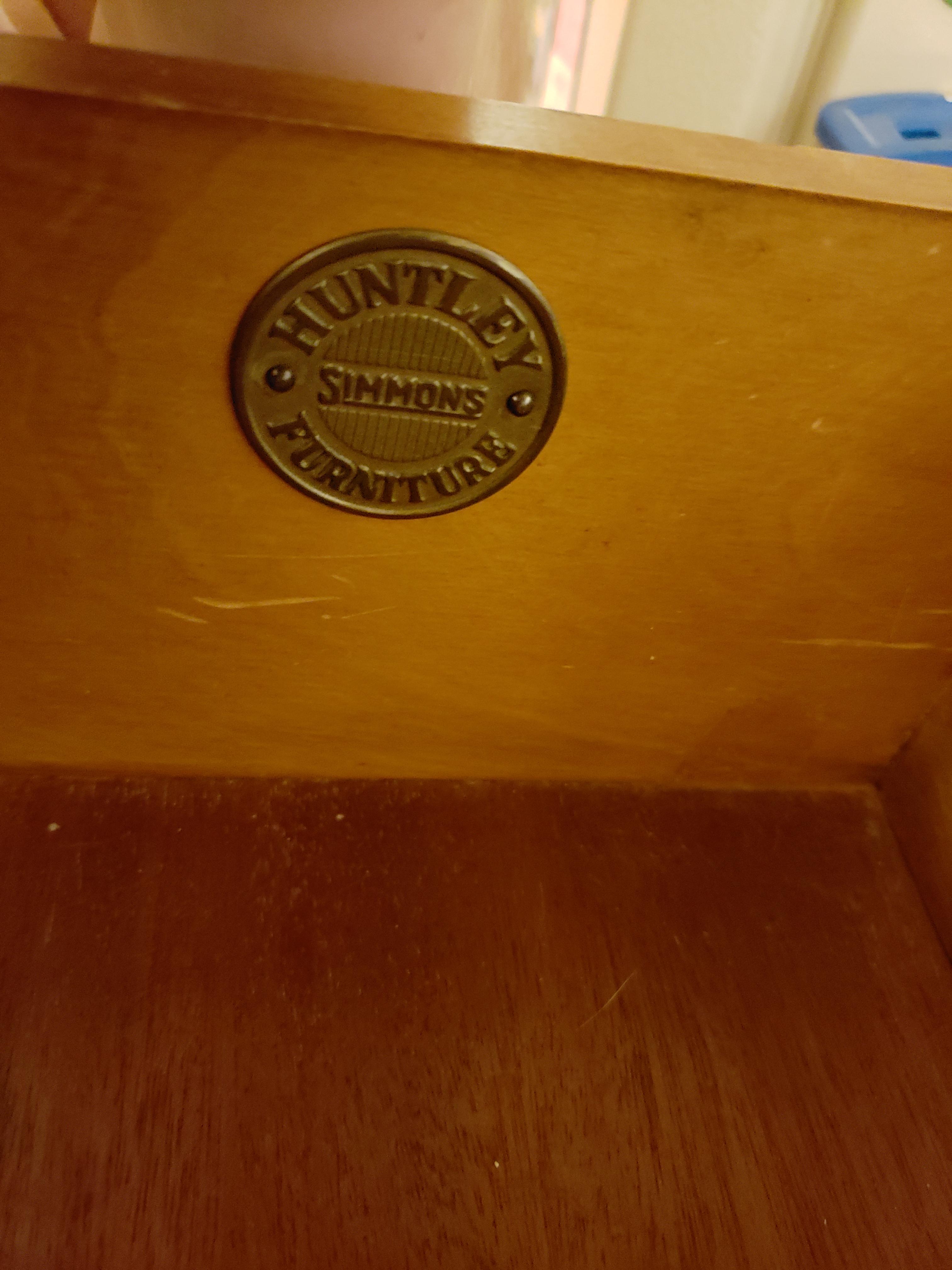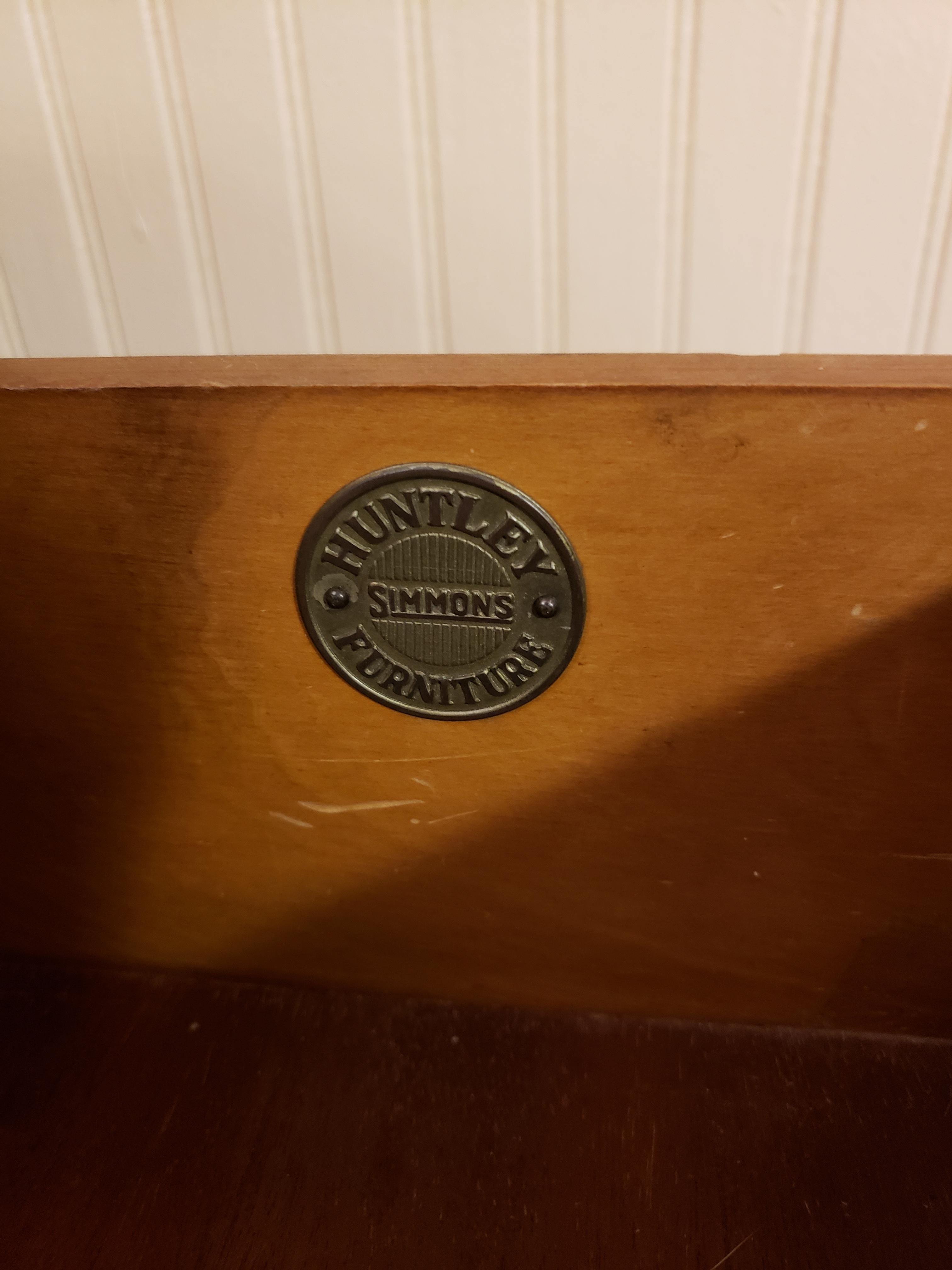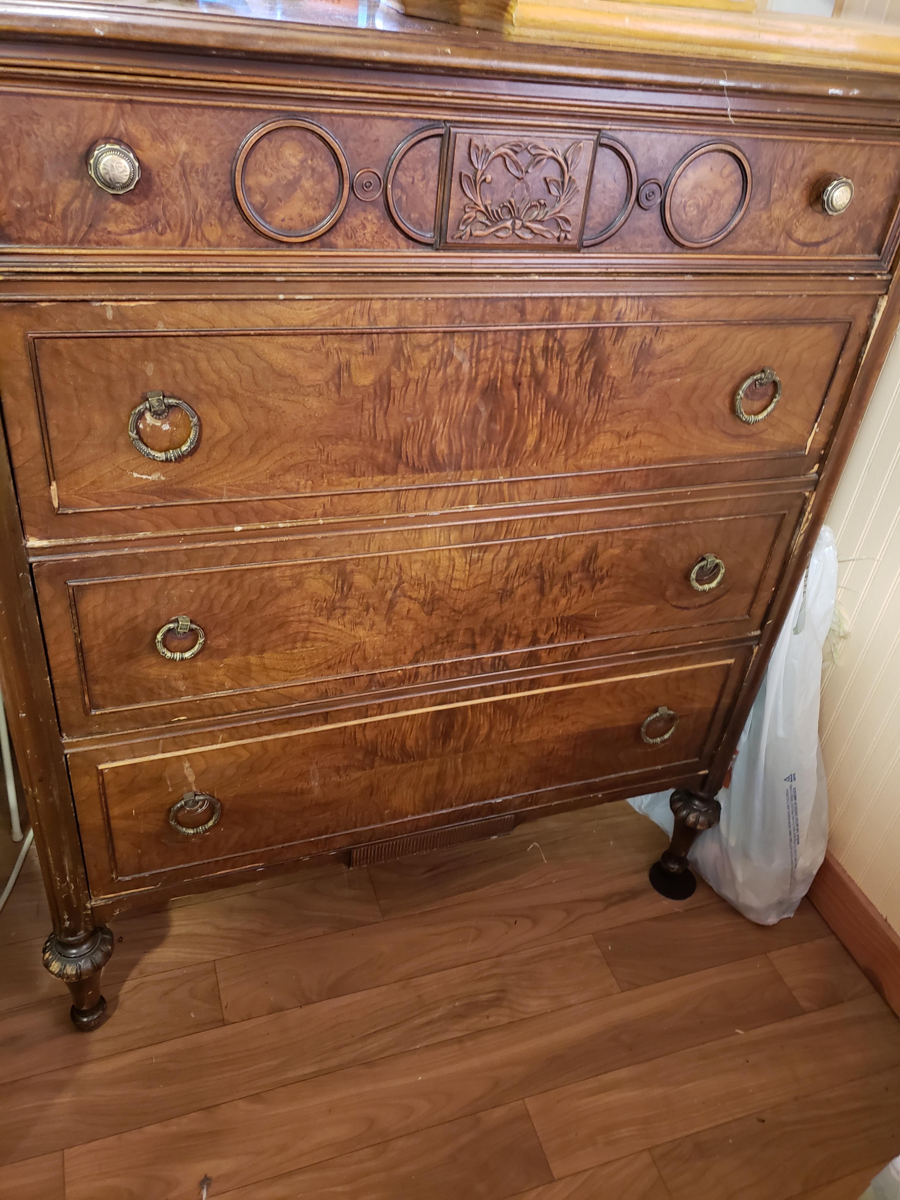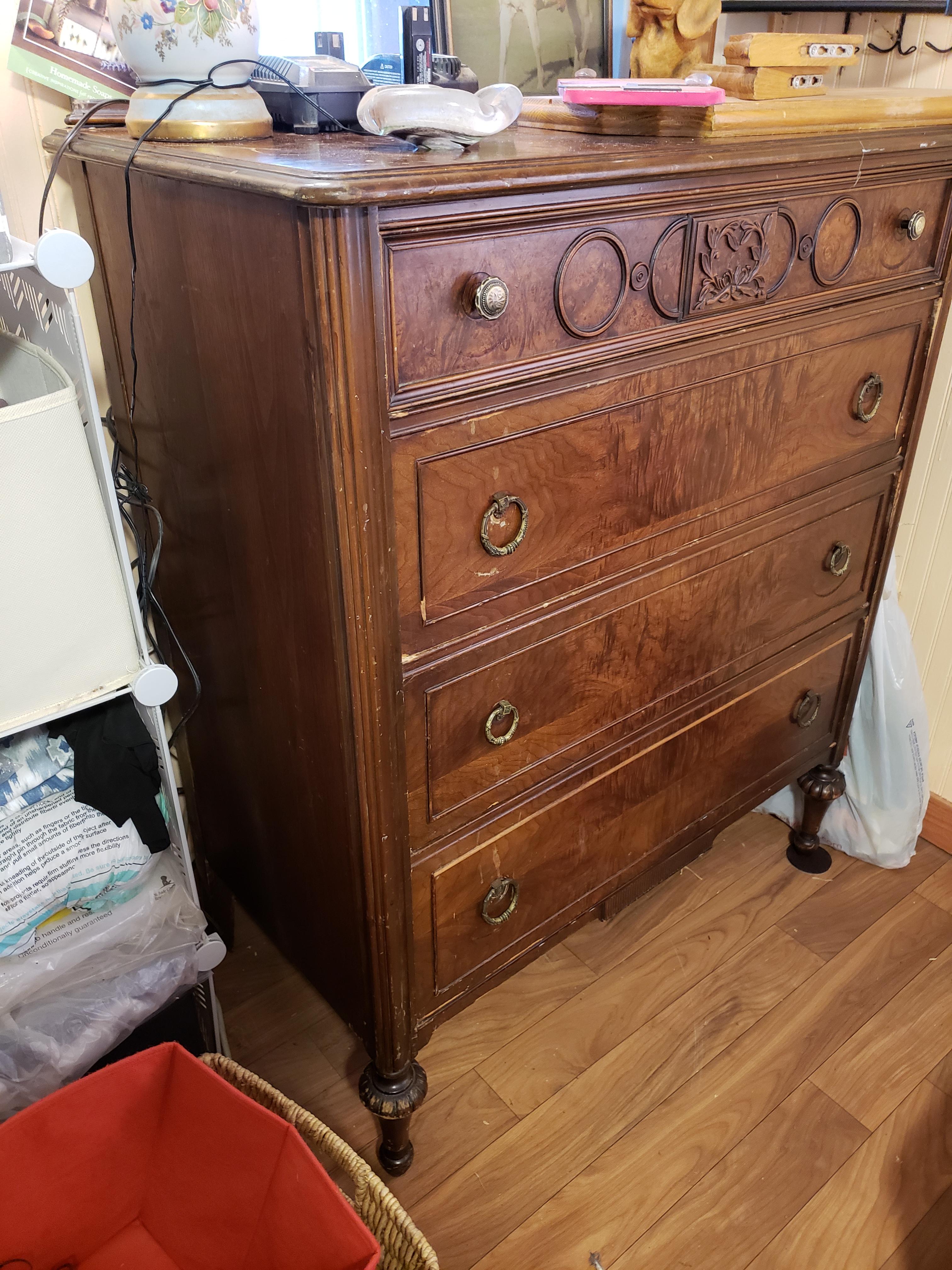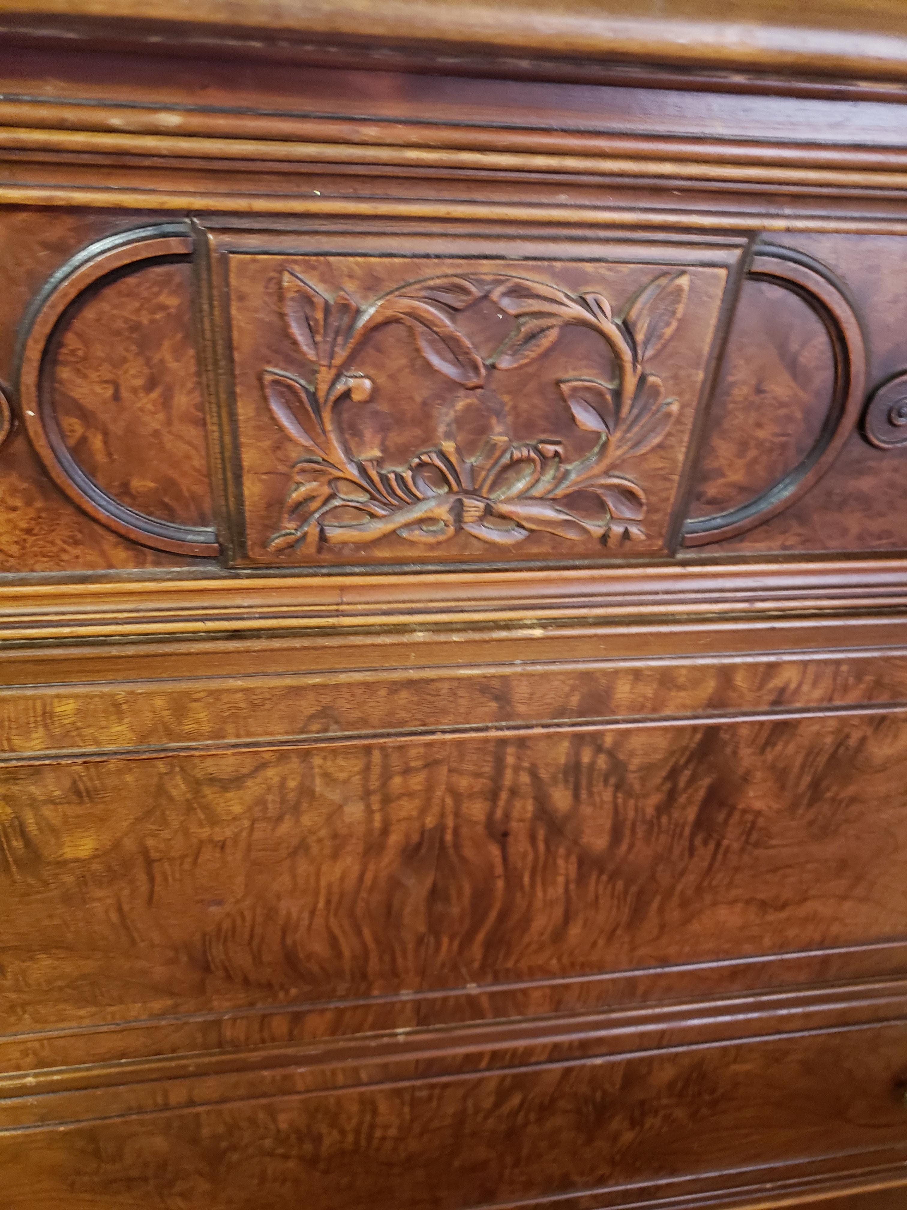 Huntley Simmons 4 drawer tall chest of drawers. Carvings on front of top drawer and on front feet