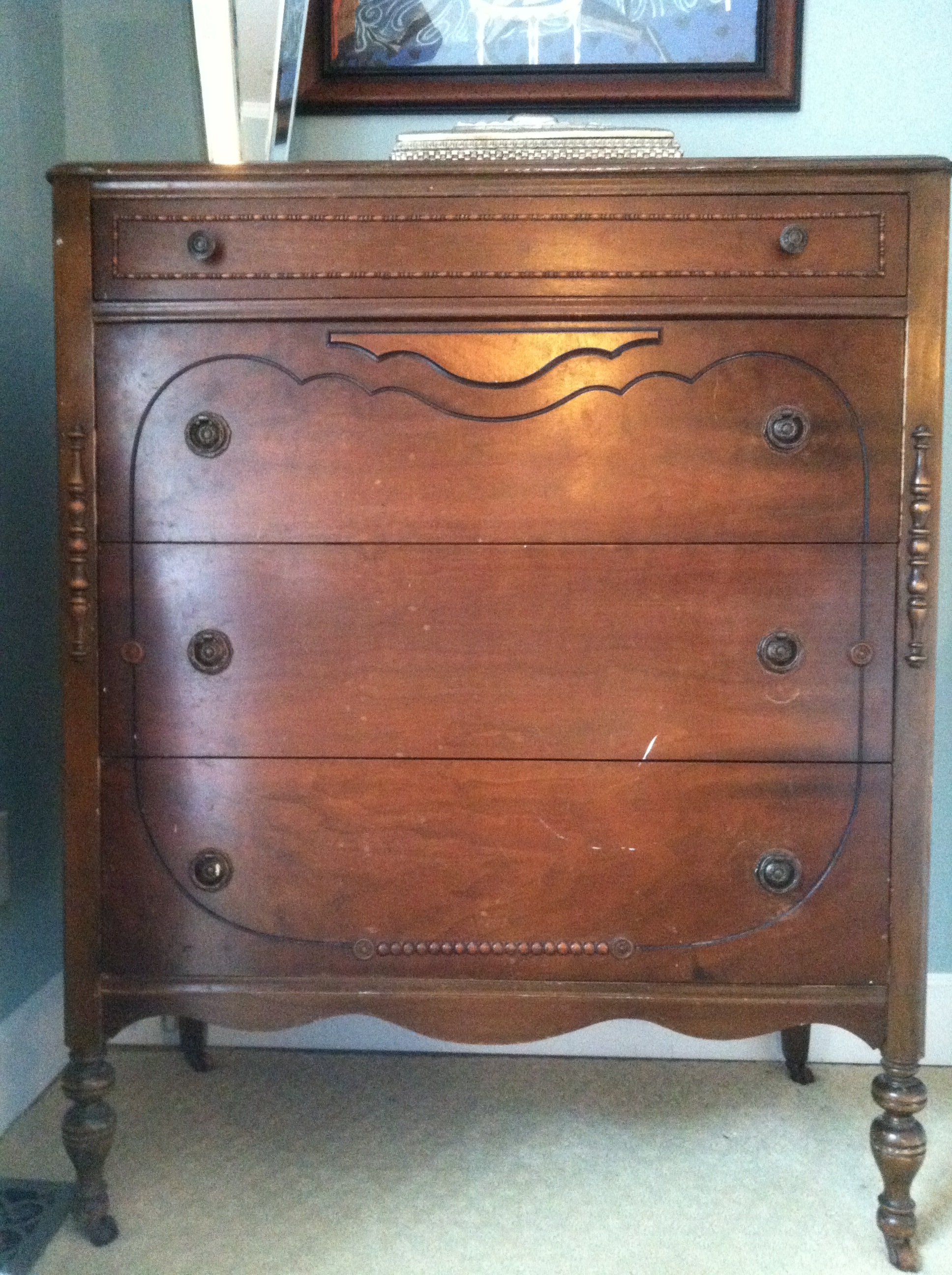 I have a tall boy dresser with 4 drawers. The top drawer is smaller and would be for underclothing, and the 4 others are of the same size. This has original hardware, the legs are on casters (original). The back of the dresser says in red (645 HI - LIGHT). All of the drawers have dove tails, and on the front of the dresser it has moldings to make a design with all of the drawers in the correct placement. Can you give me an idea if it is worth anything? Thank you, Julie