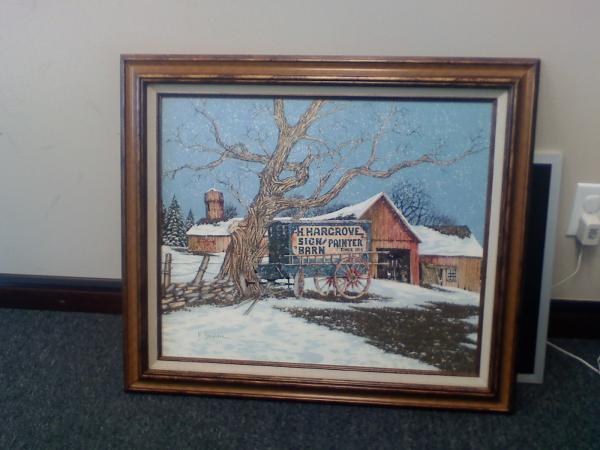 Winter scene - snow falling. Reddish/Brown Barn and Silo in background. 3 Pine trees on the left hand side of barn. Many bare treetops seen behind/above the barn. There is one twisted and bare tree at the forefront of the picture. Beside the tree there is a blue horse-drawn wagon (no horses are attached) that has red wheels. On the side of the wagon, it reads "H. Hargrove Sign and Painter Barn Since 1901". On the other side of the tree there is a small stone fence that is supporting log-like posts that are connected by barbed wire fencing. Some grass is seen coming out in between snow covered ground.