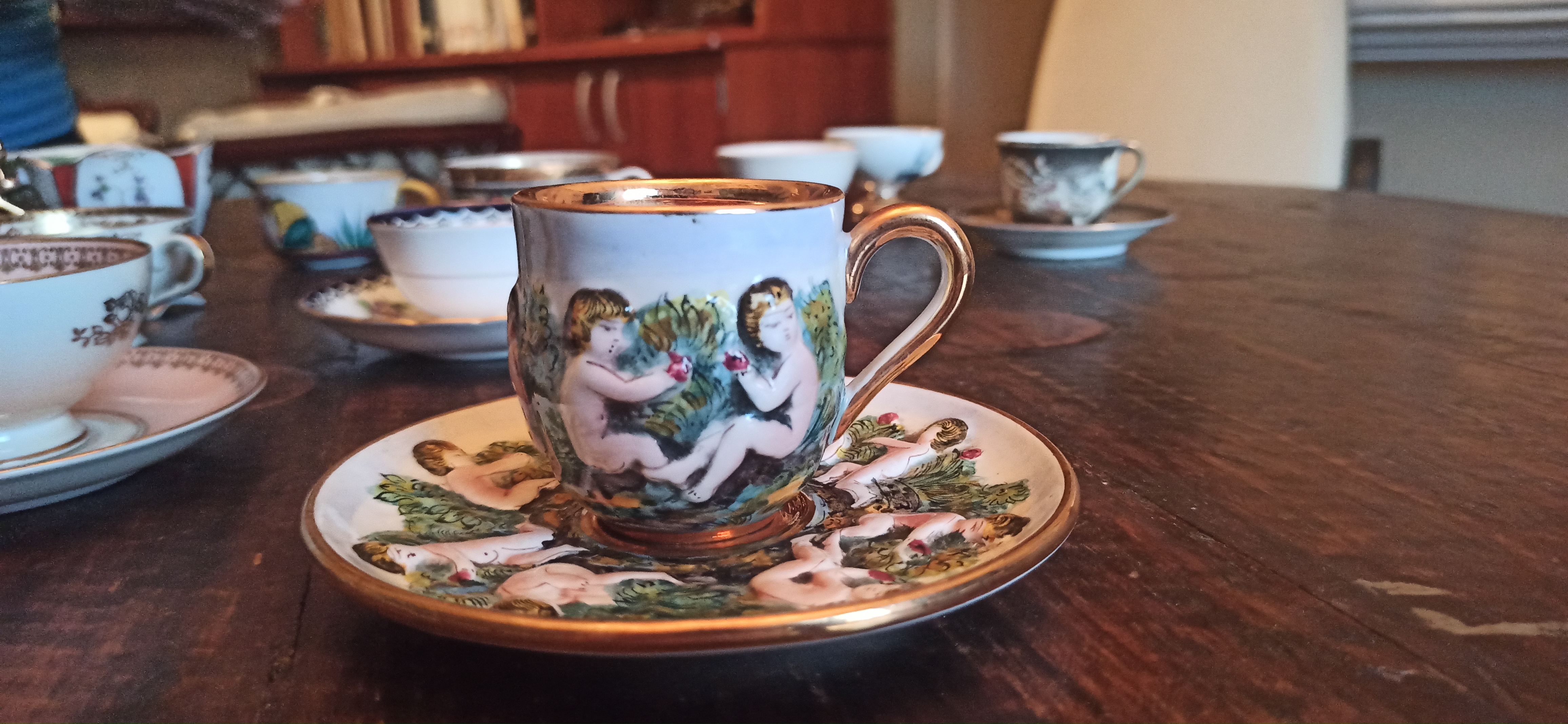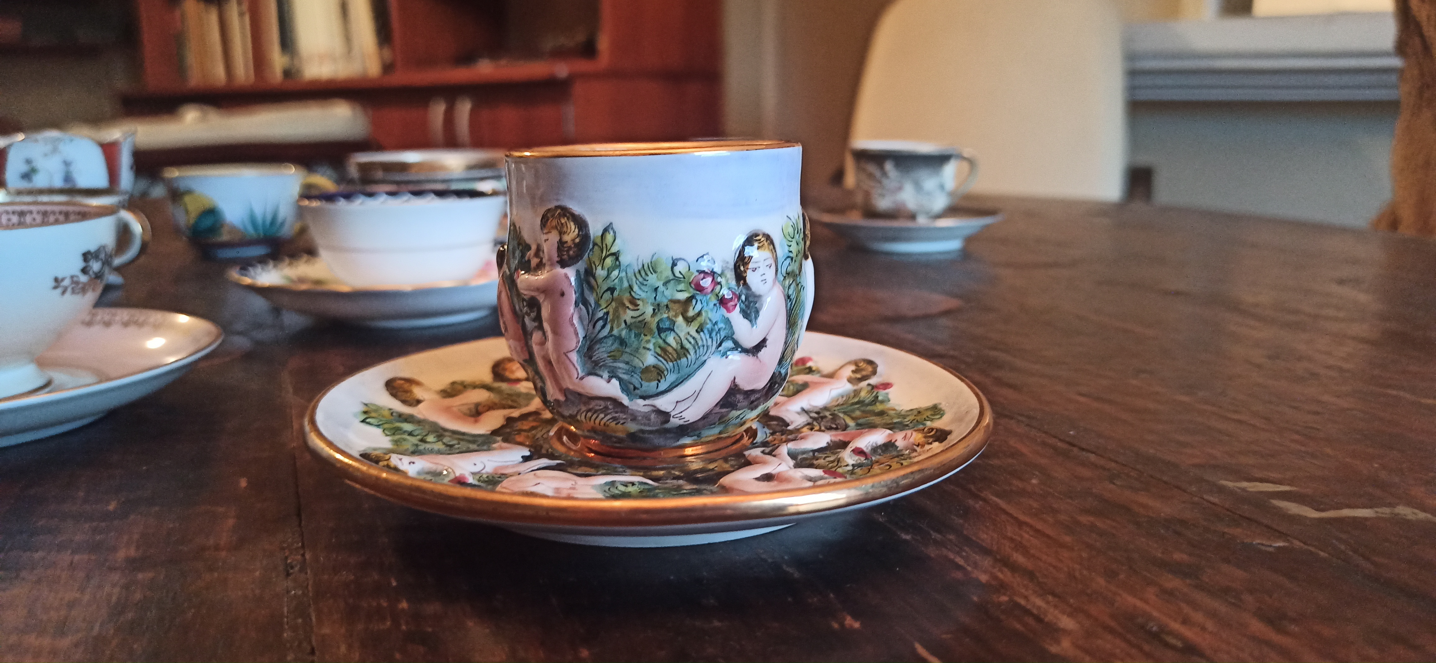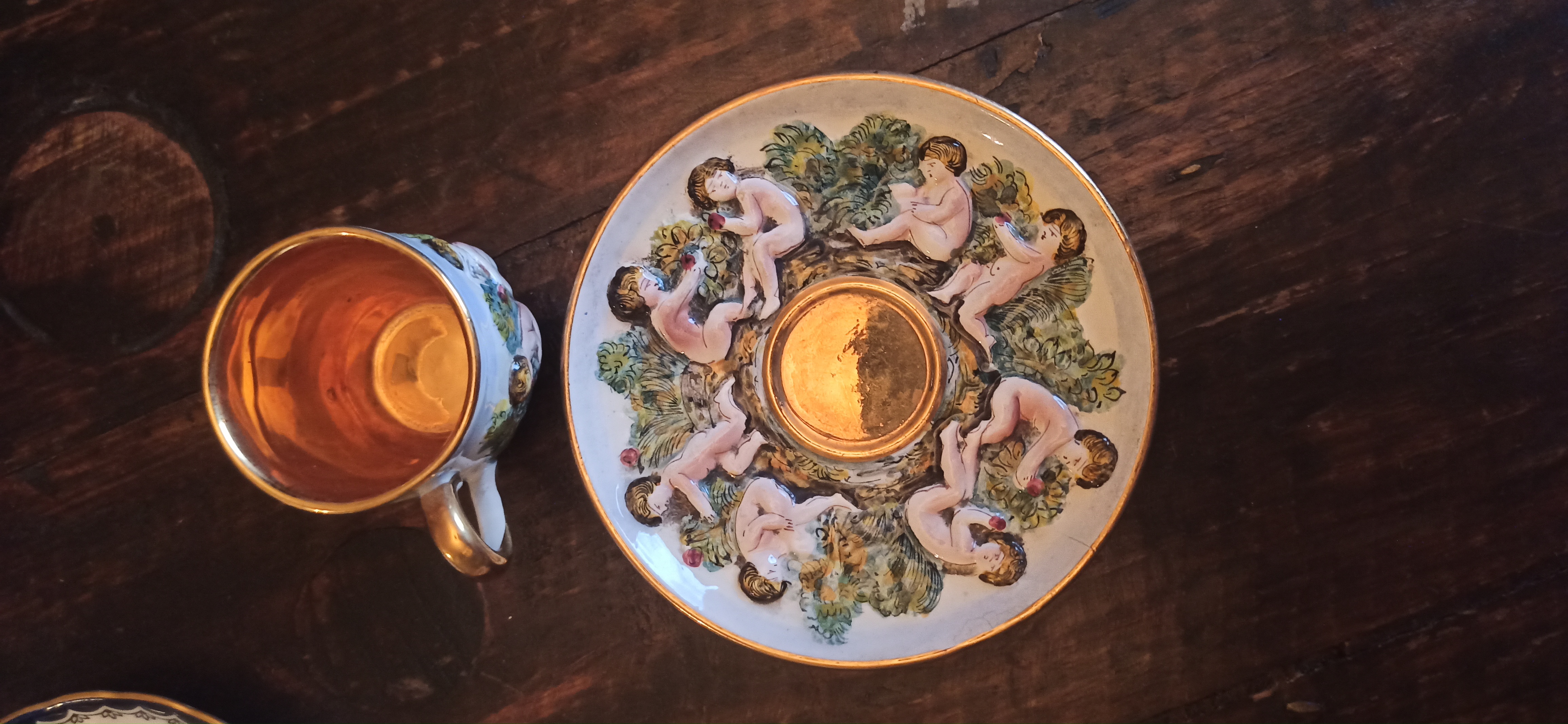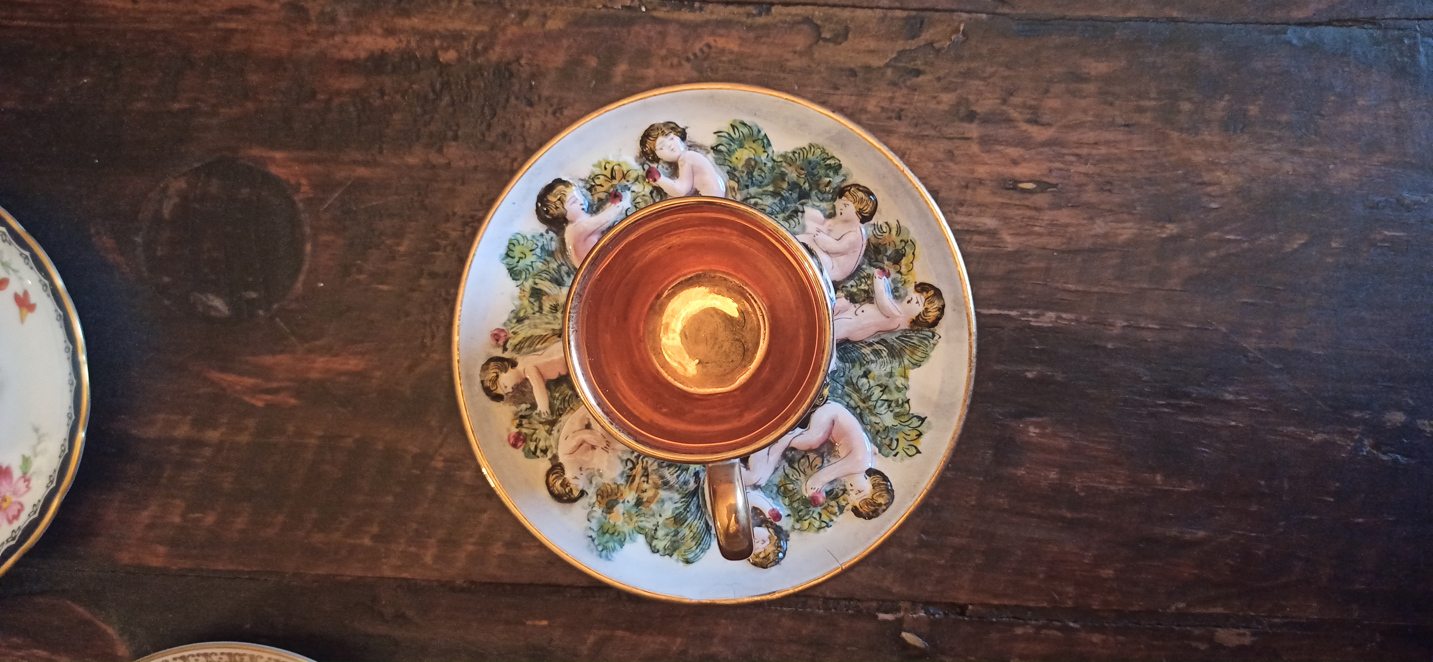 This set of cup and saucer belonged to my grandmother and was recently passed on to me. It is in fantastic condition, and the mark "Capodimonte, Italy" can be clearly read on the bottom of each individual piece, along with the number 738. The cup has a completely golden interior, and the handle also has the same colour. The outer wall of the cup is intricately decorated with hand-painted pictures of very young boys picking and holding apples. The whole piece is also textured, with the boys standing in relief against the background. The same pattern repeats in the saucer, with the centre being completely golden, and the edge decorated with the hand-painted boys in relief.
