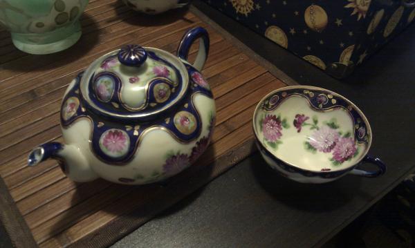 I need an ID on this set, i dont know if its from chine, UK, Japanese, American. it appears to be hand painted it is very fine, when held up to light you can see the light thru it. It also appears to have gold trim on the rim and painted on the sides as well. purchased at a yard sale from upstate NY around 1980.