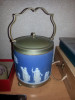 This is a cut glass or crystal ice bucket with tongs. The tongs are 'claws' and the tongs and handles of the bucket are some sort of tarnished metal.