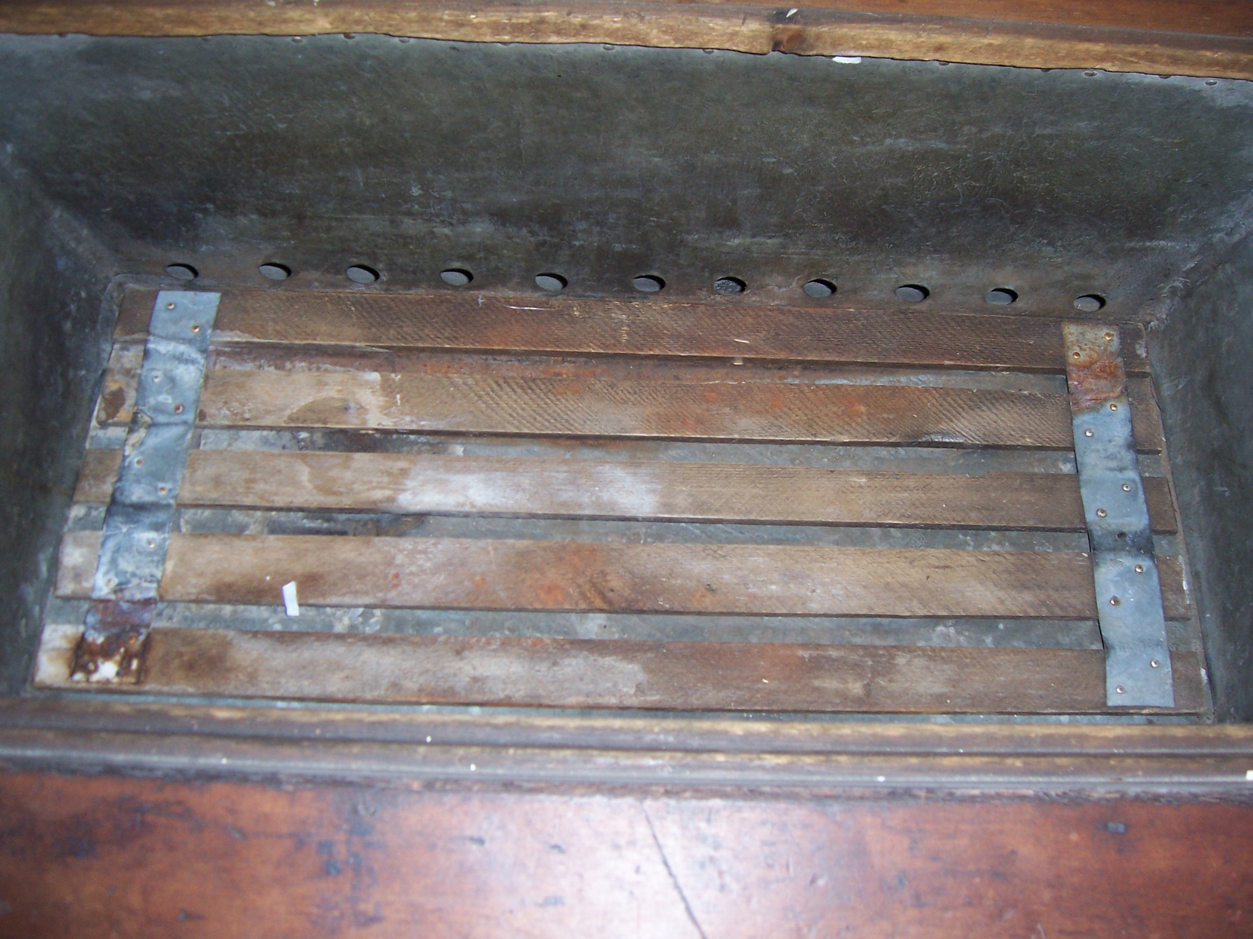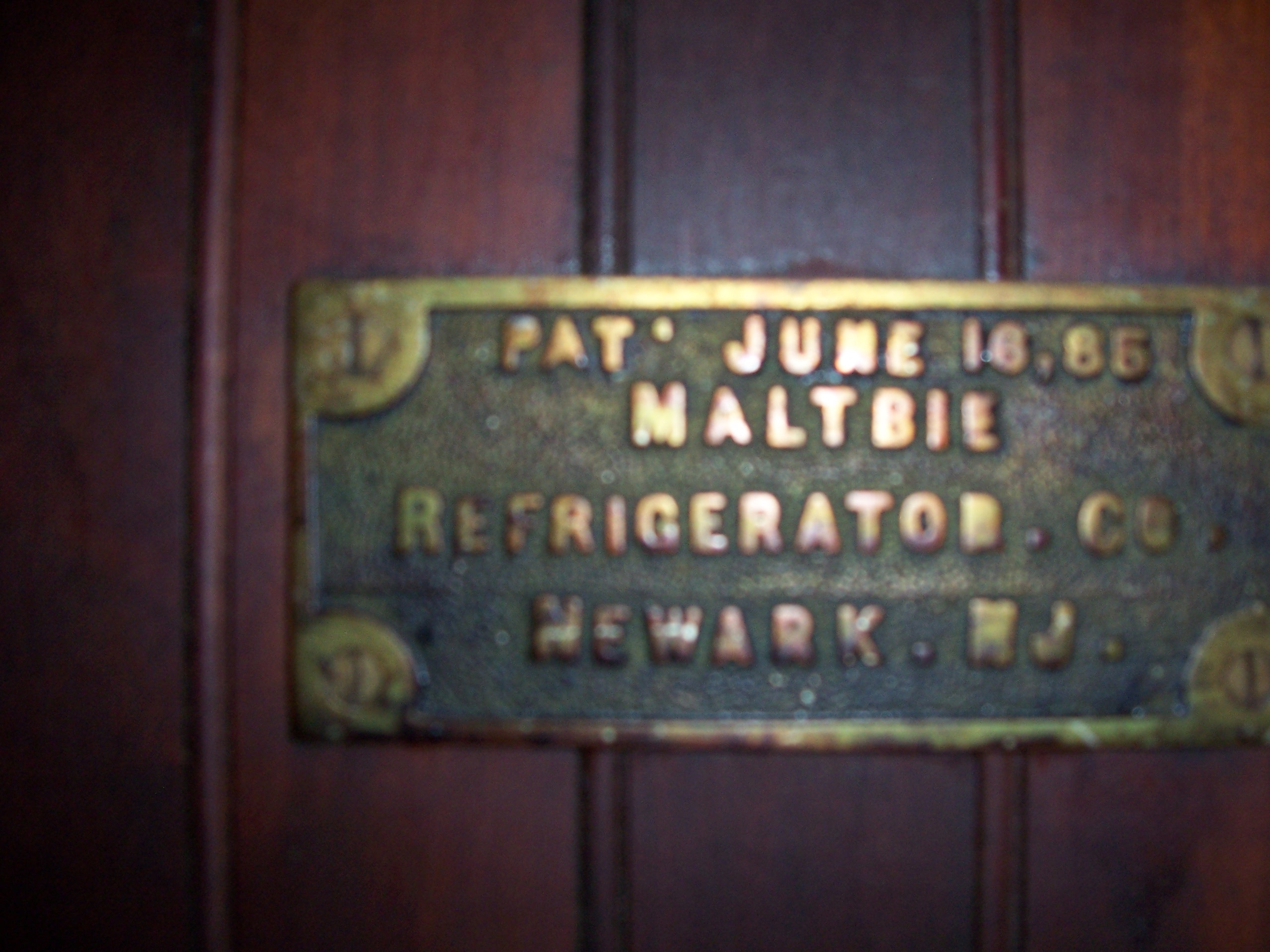 WOODEN ICEBOX PLATE WRITTEN SAYS PAT.JULY,16,85 MALTBIE REFRIGERATOR CO NEWARK NJ TOP OPENS TWO DOORS IN FRONT TINNED INSIDE WOOD RACKS