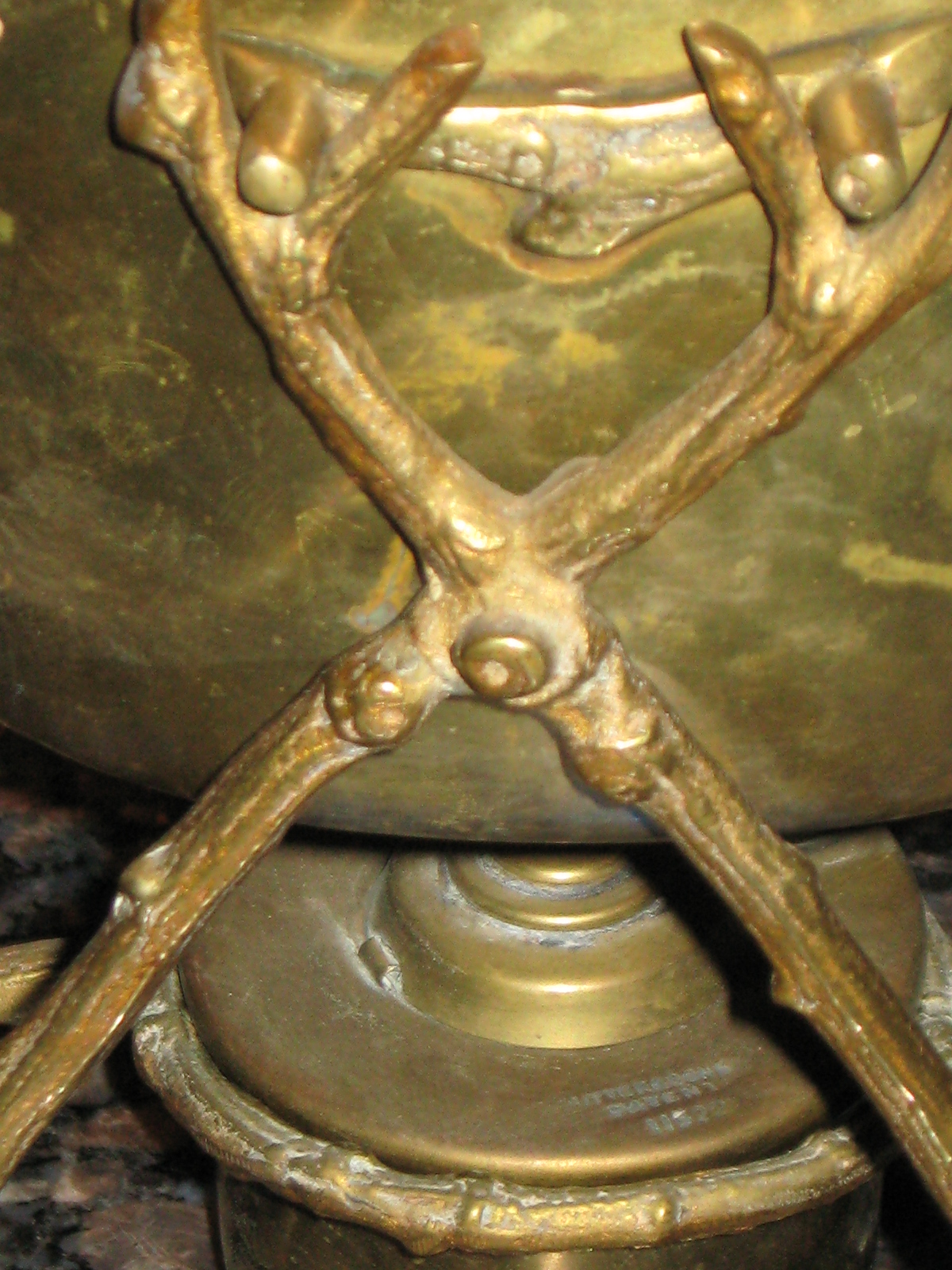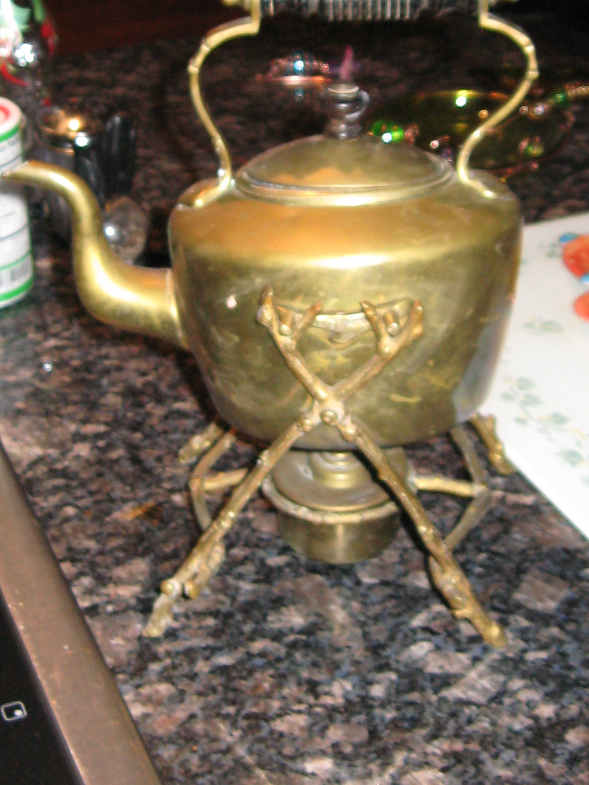 This is a brass teapot/waterpot with a stand and a warmer underneath. The condition is excellent except it needs polishing. I have seen numerous examples of William Soutter's work and sme are identical to my piece with one exception. The stand on mine had a a twig or wood design. Can anyone help me with information on this item; age, worth, etc.