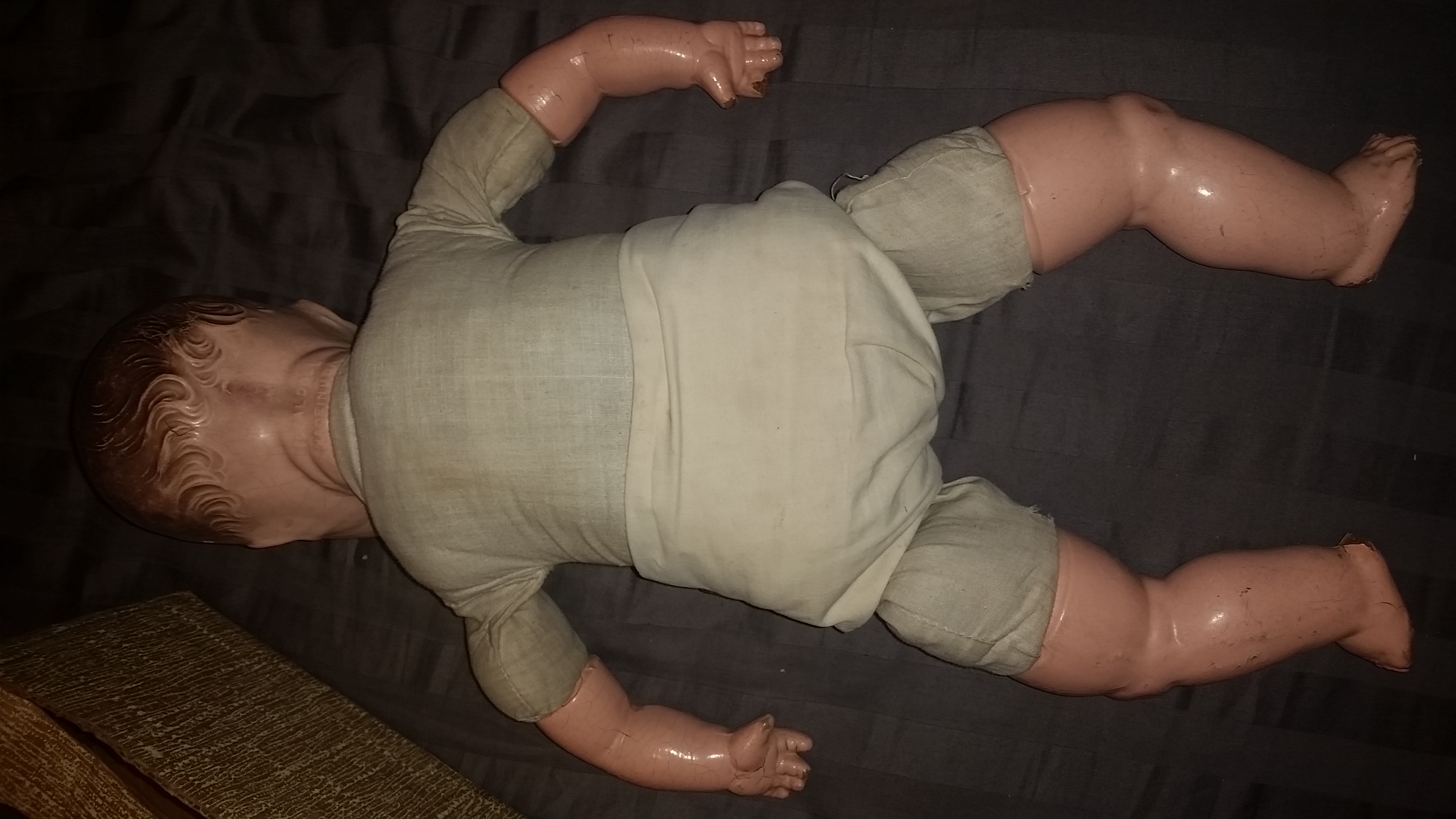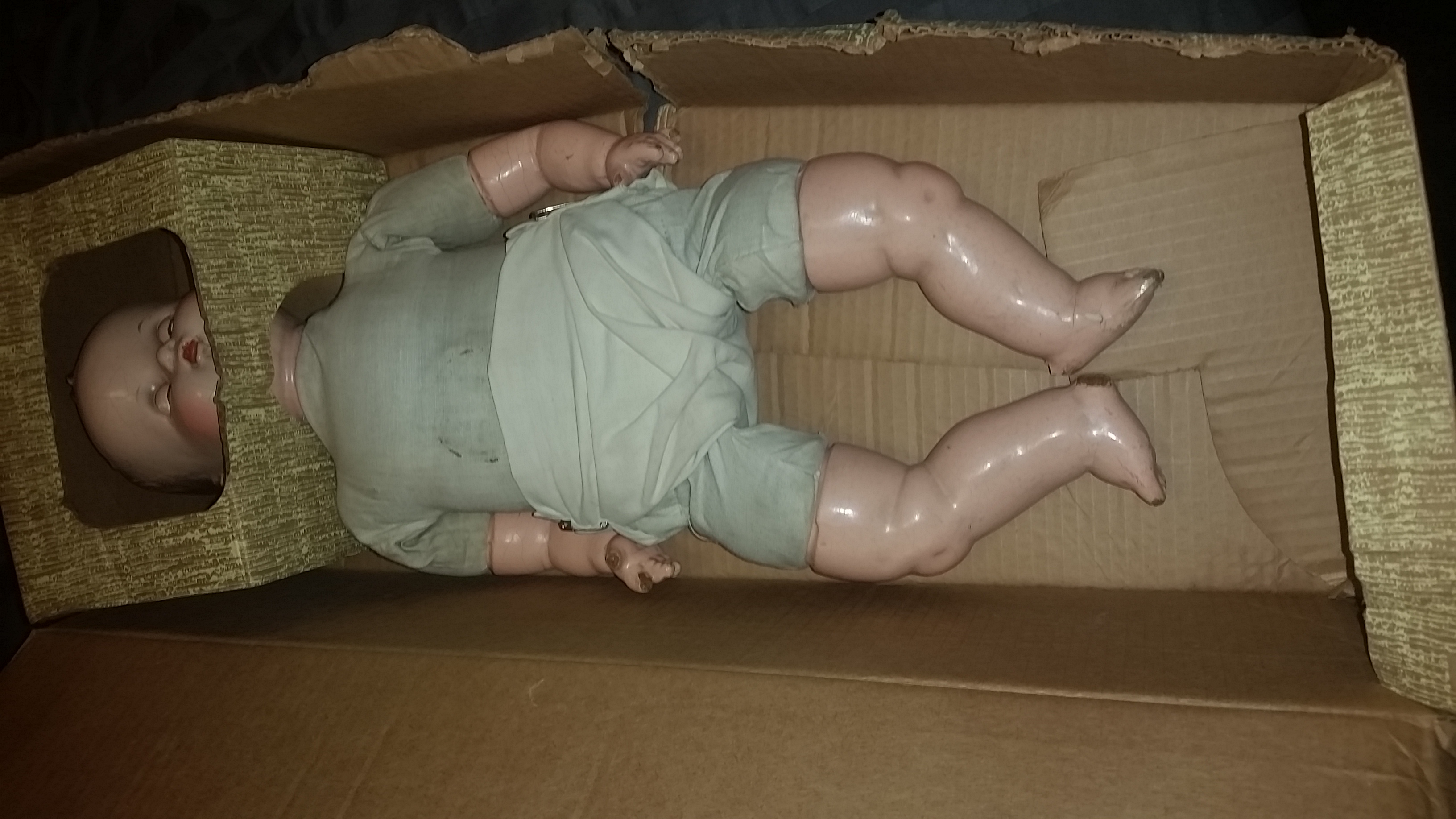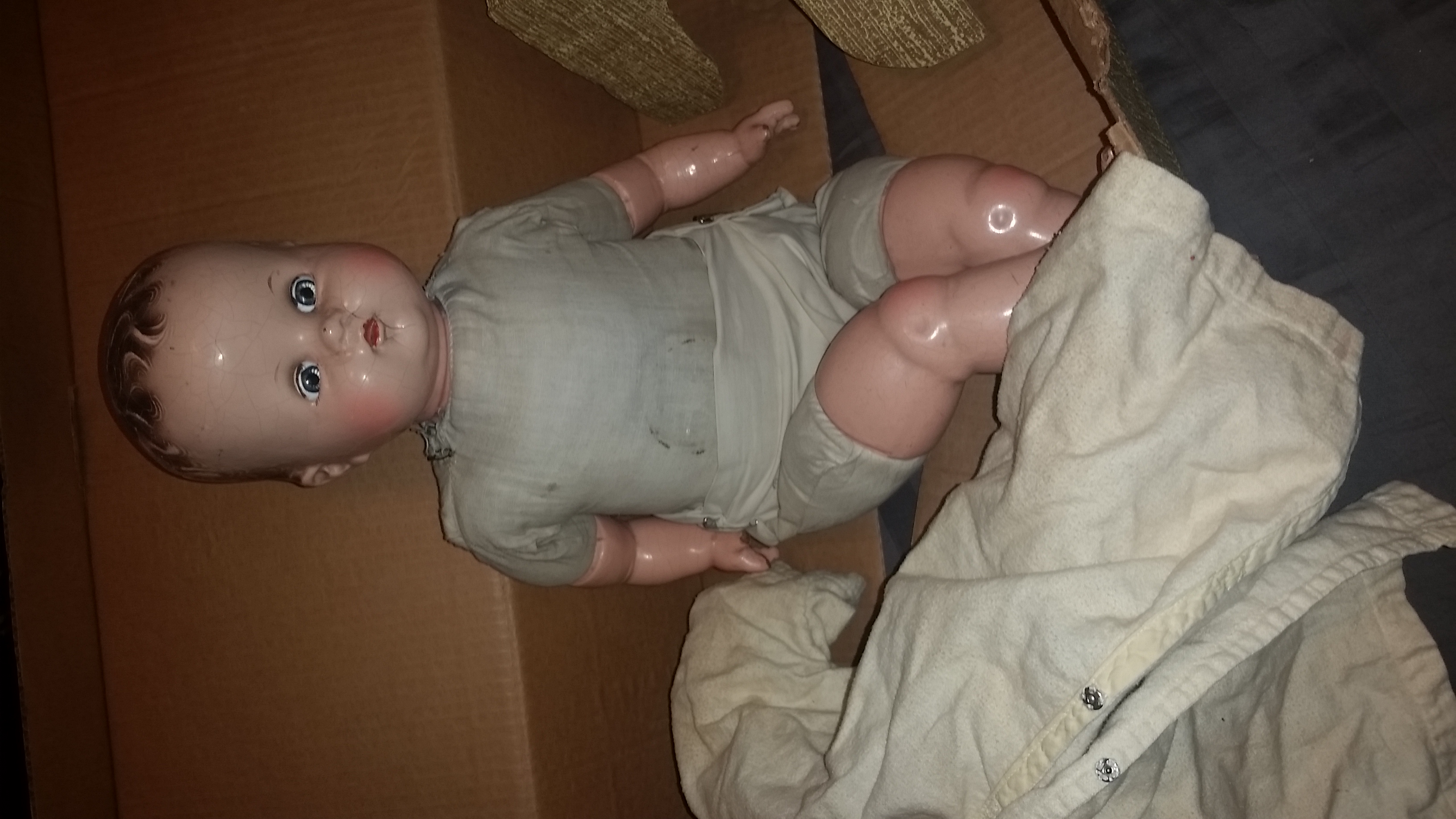 I bought this on an online auction simply because nobody else bid on it. There are cracks and missing fingers. Blue eyes that open and close. It also has something that looks like a speaker in its belly. I'm curious about its history and if the clothes and box are originals. Of course I'd like to know it's value too. Thanks for any information you can provide.