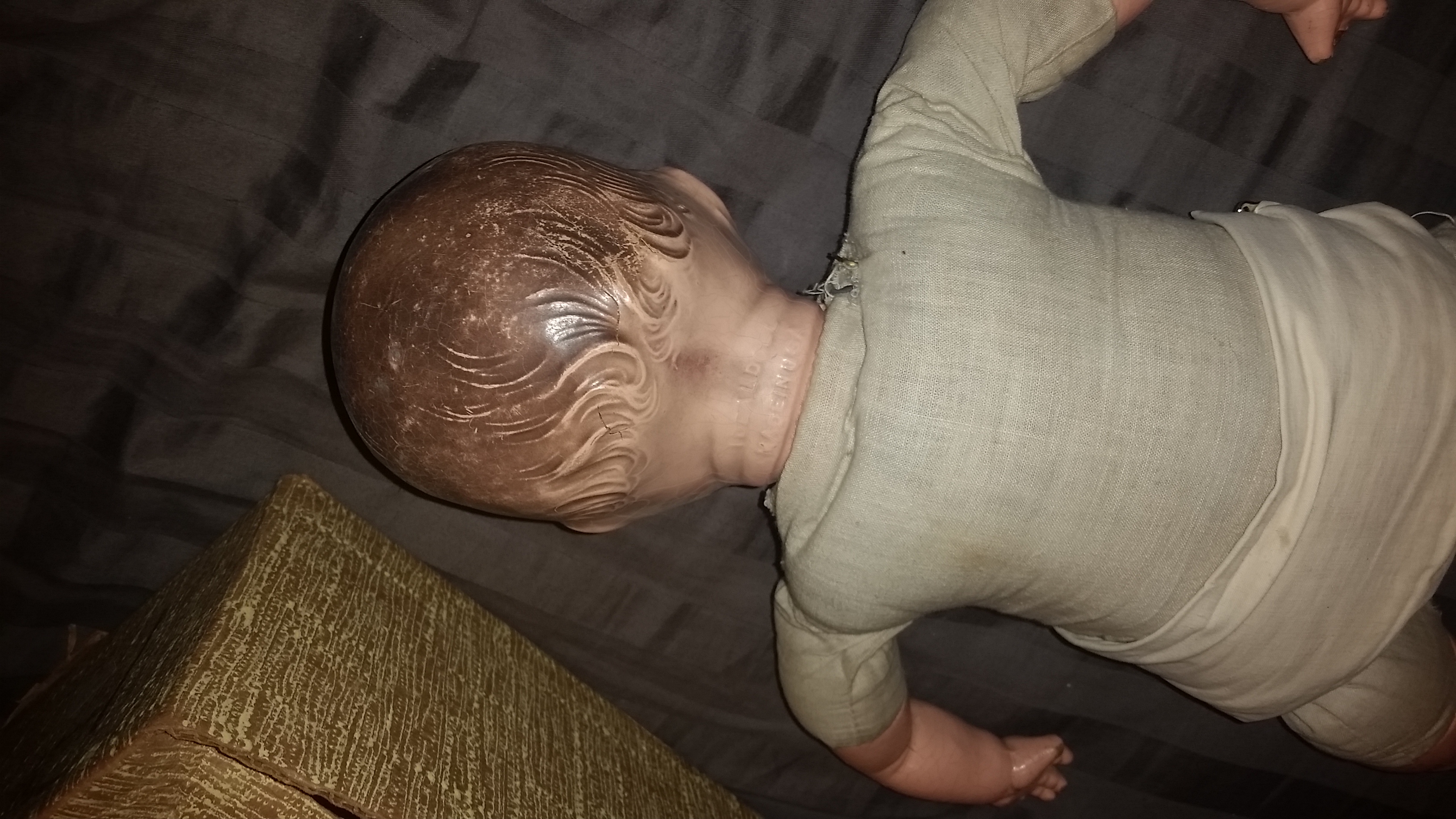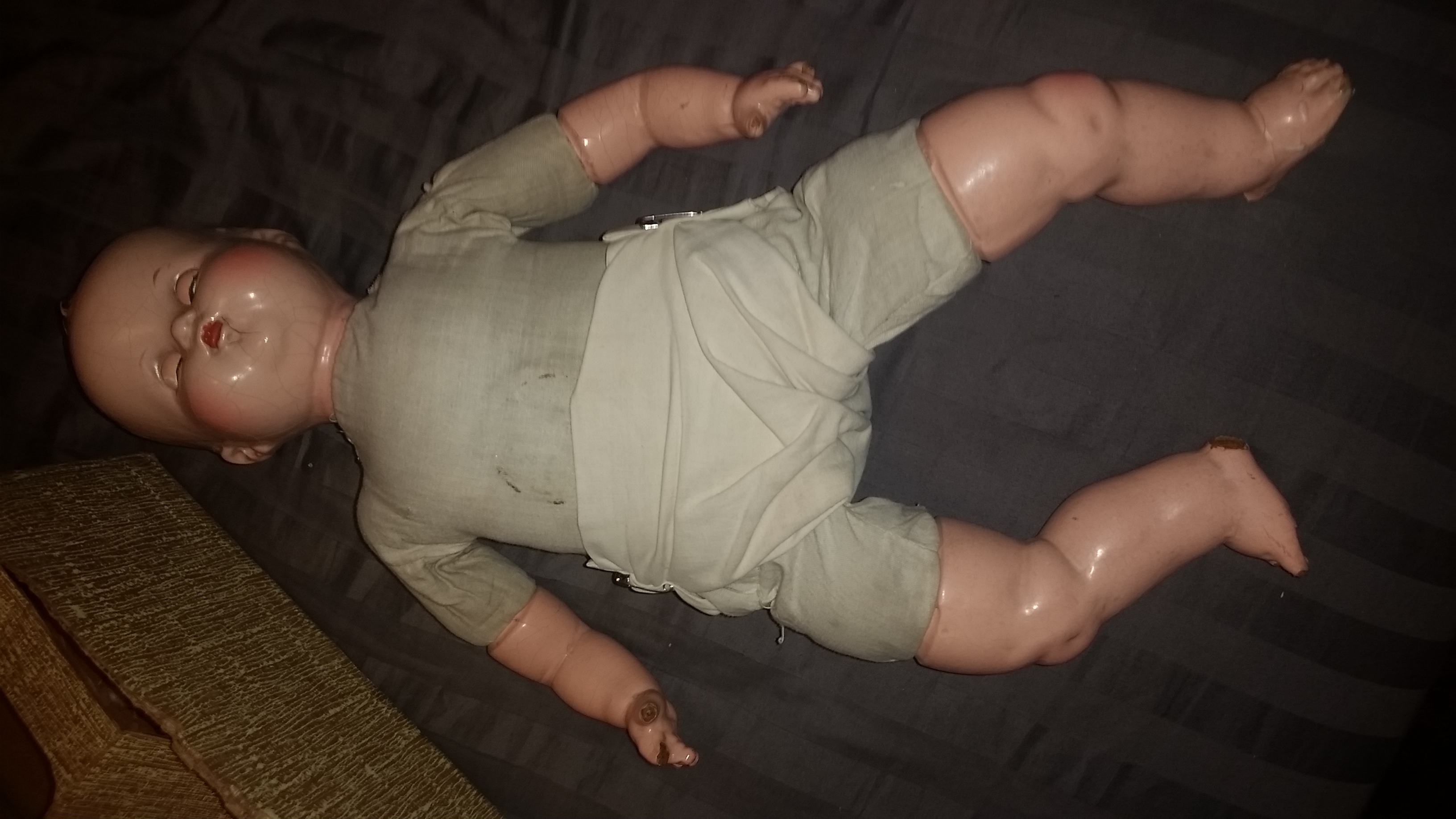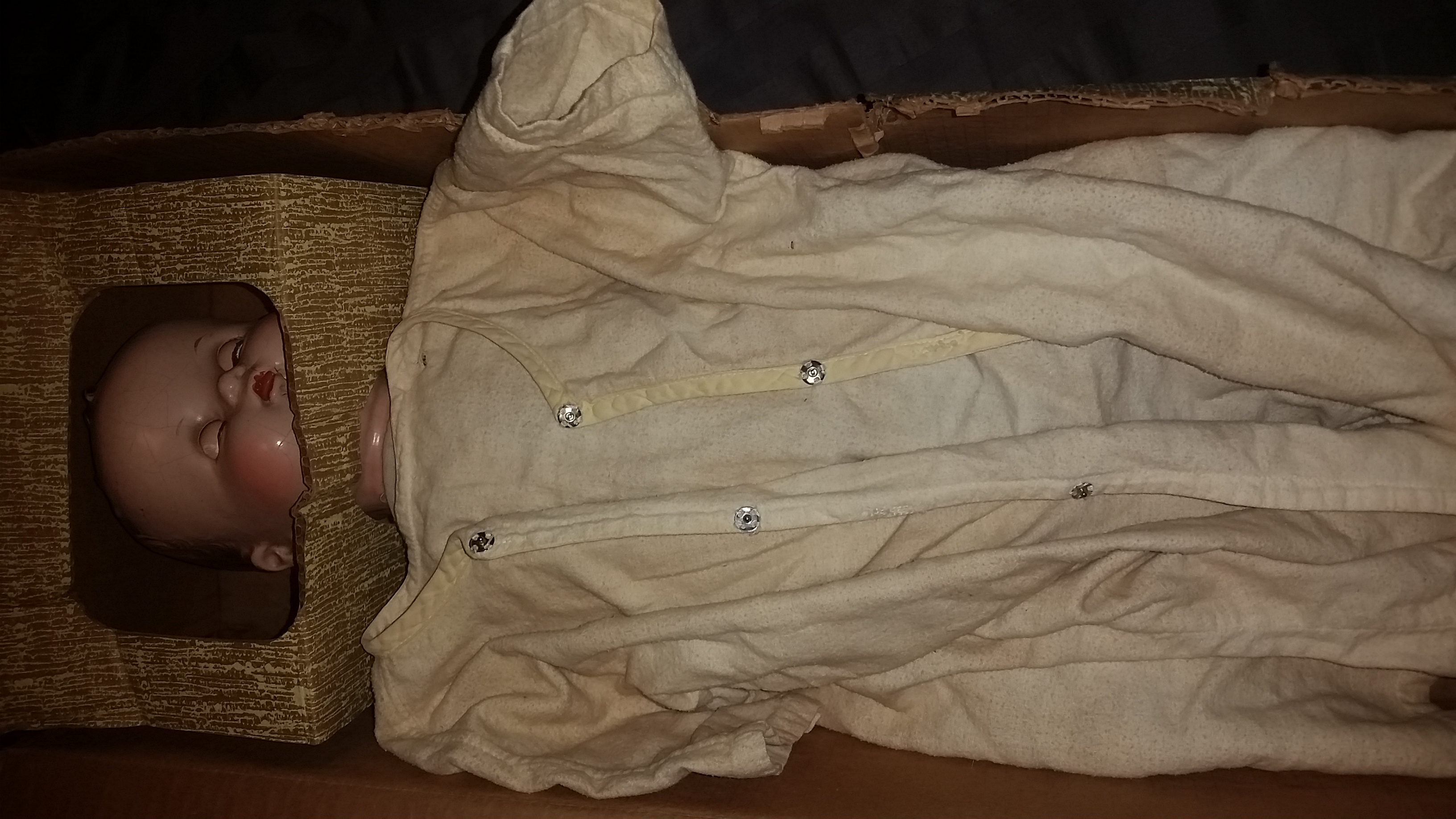 I bought this on an online auction simply because nobody else bid on it. There are cracks and missing fingers. Blue eyes that open and close. It also has something that looks like a speaker in its belly. I'm curious about its history and if the clothes and box are originals. Of course I'd like to know it's value too. Thanks for any information you can provide.