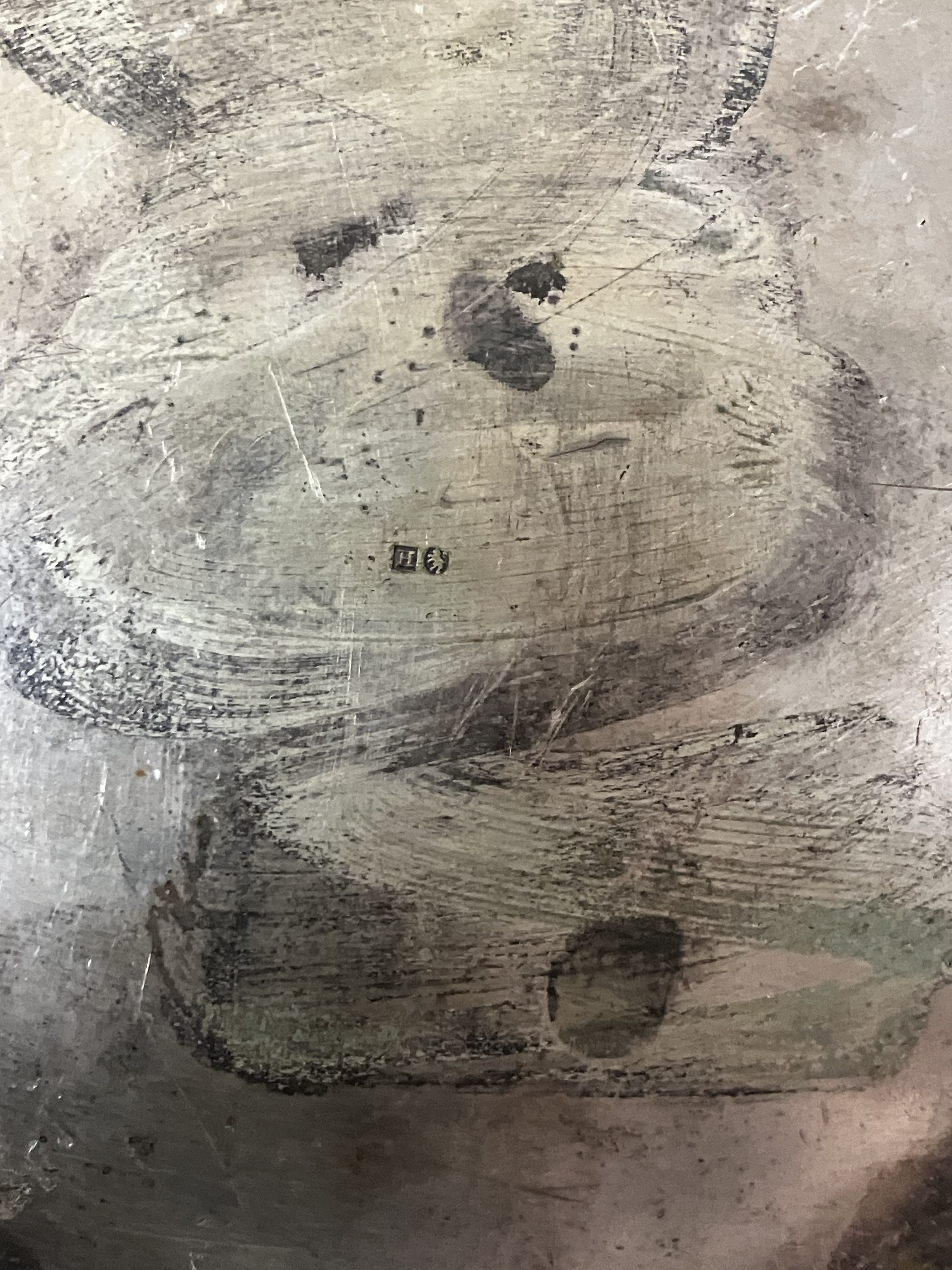The bowl likely dates from the late 19th to early 20th century, a period known for intricate metalwork and decorative arts. The impressed marks may suggest a European origin, possibly linked to a specific workshop or manufacturer known for ornamental metal pieces.