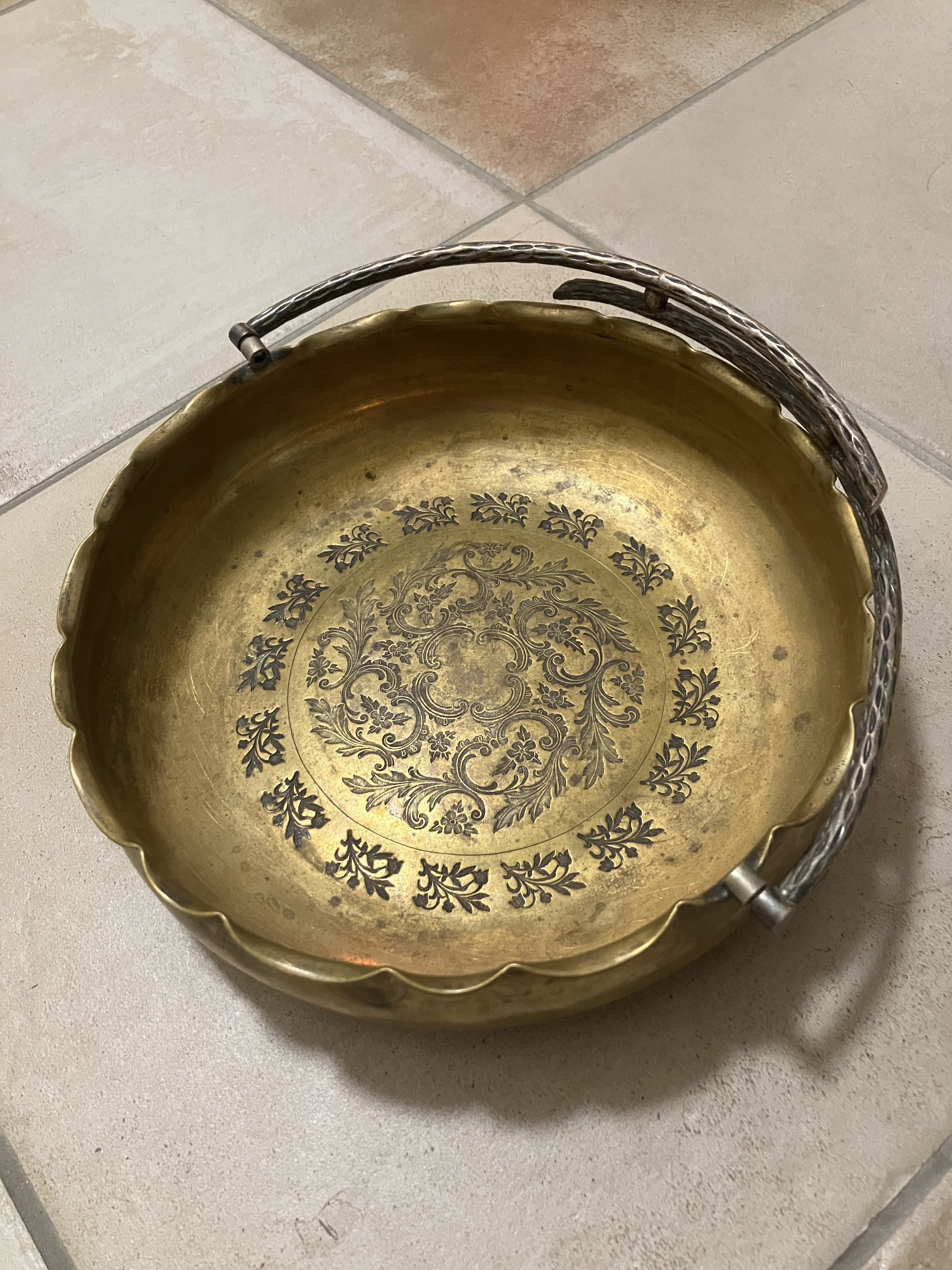 Hello! I am trying to find out the origin of an old copper bowl. The inside of the bowl is engraved with a floral pattern, has a wavy rim, and is silver-plated on both sides with a decorated metal handle. There are two impressed marks on the bottom: