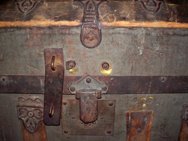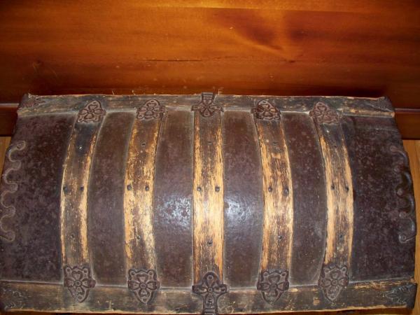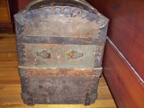 It is in excellent condition as far as the structure. The leather straps on the side are missing, except for a piece or two. The hardware looks as old as the trunk. The top is a dome with five wood strips with unique metal hardware attached at each end. The front has five wood strips with unique metal pieces on each end *(the 3rd wood piece is only half the size of the others). The top of the latchet is missing the top metal piece, showing only two old screws?