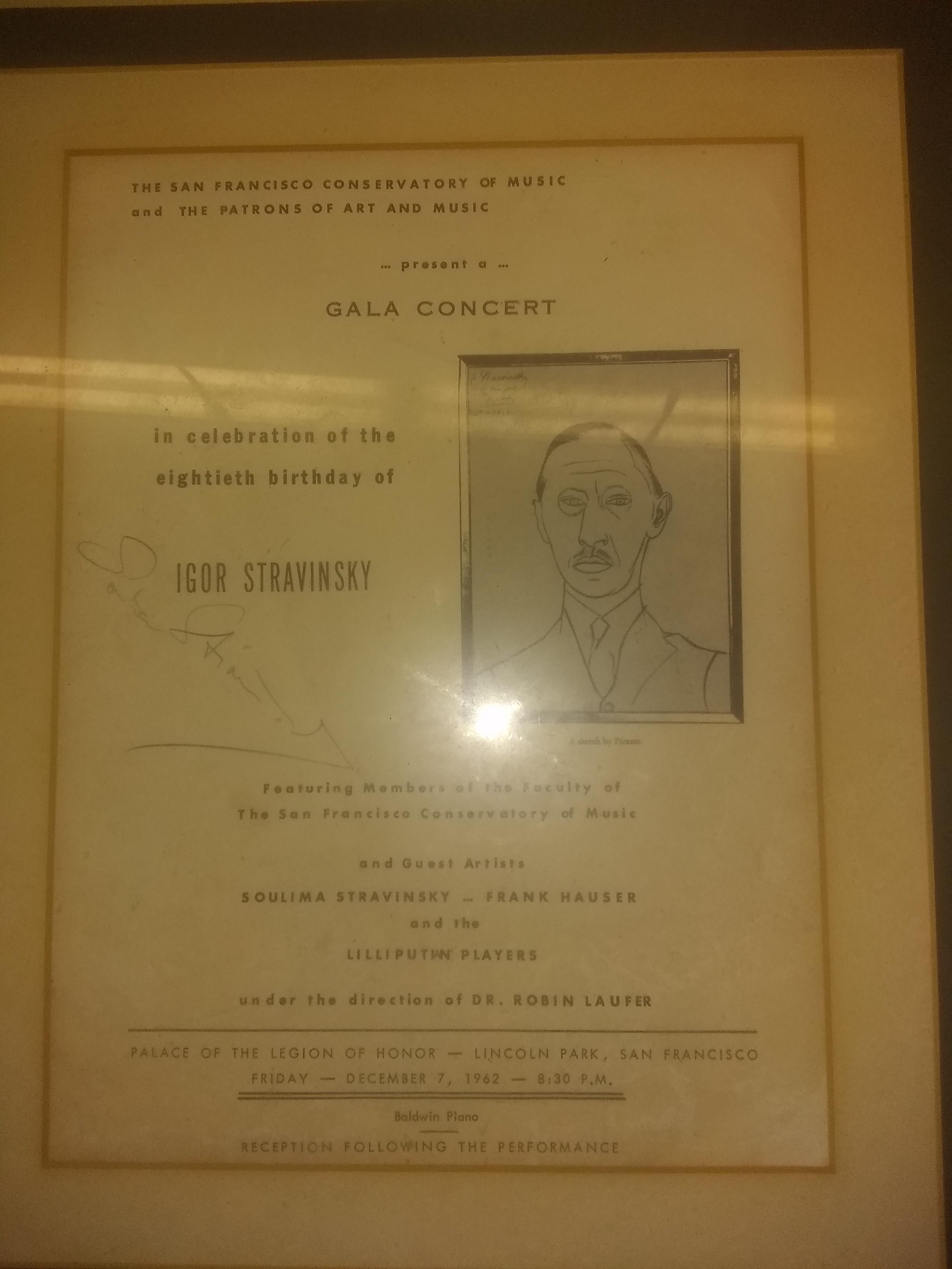 Igor Stravinsky 80th Birthday Celebration Program from Friday December 7th 1962 8:30PM at the Palace of the Legion of Honor... Lincoln Park, San Francisco under the direction of Dr. Robin Laufer Guest Artists Soulima Stravinsky and Frank Hauser.. Autographed by Soulima Stravinsky.