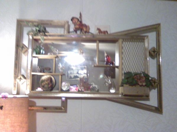 square box with mirror, has smaller shelves built in,has mirrored edge in odd shape around outside with mesh screen and flower box