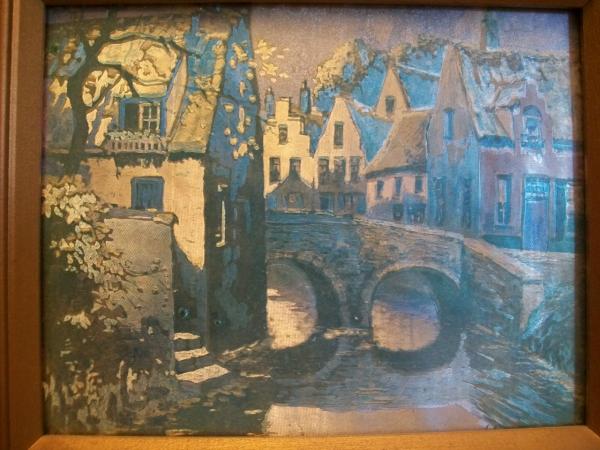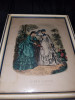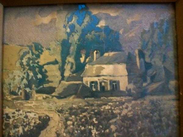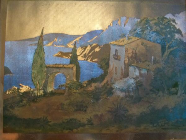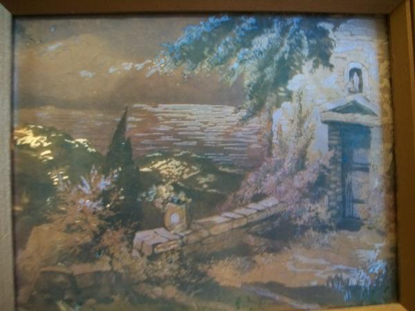 They are iredesent, pale shades of blue, green and silver, they look to be of the Italian or French, maybe Dutch country side. Including the frame they are about 10" by 9' in size. The frames are gold with white in the wood grain