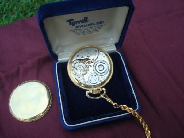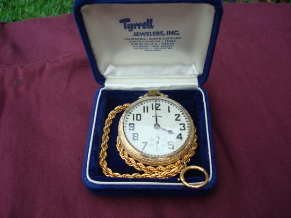 Illinois fob watch Serial #3445730 Still ticks. Has a few light marks or scratches on watch face below bevel. Has fob chain 11" long that feels like gold to me, but I do not know. Can send you more pics if you like.