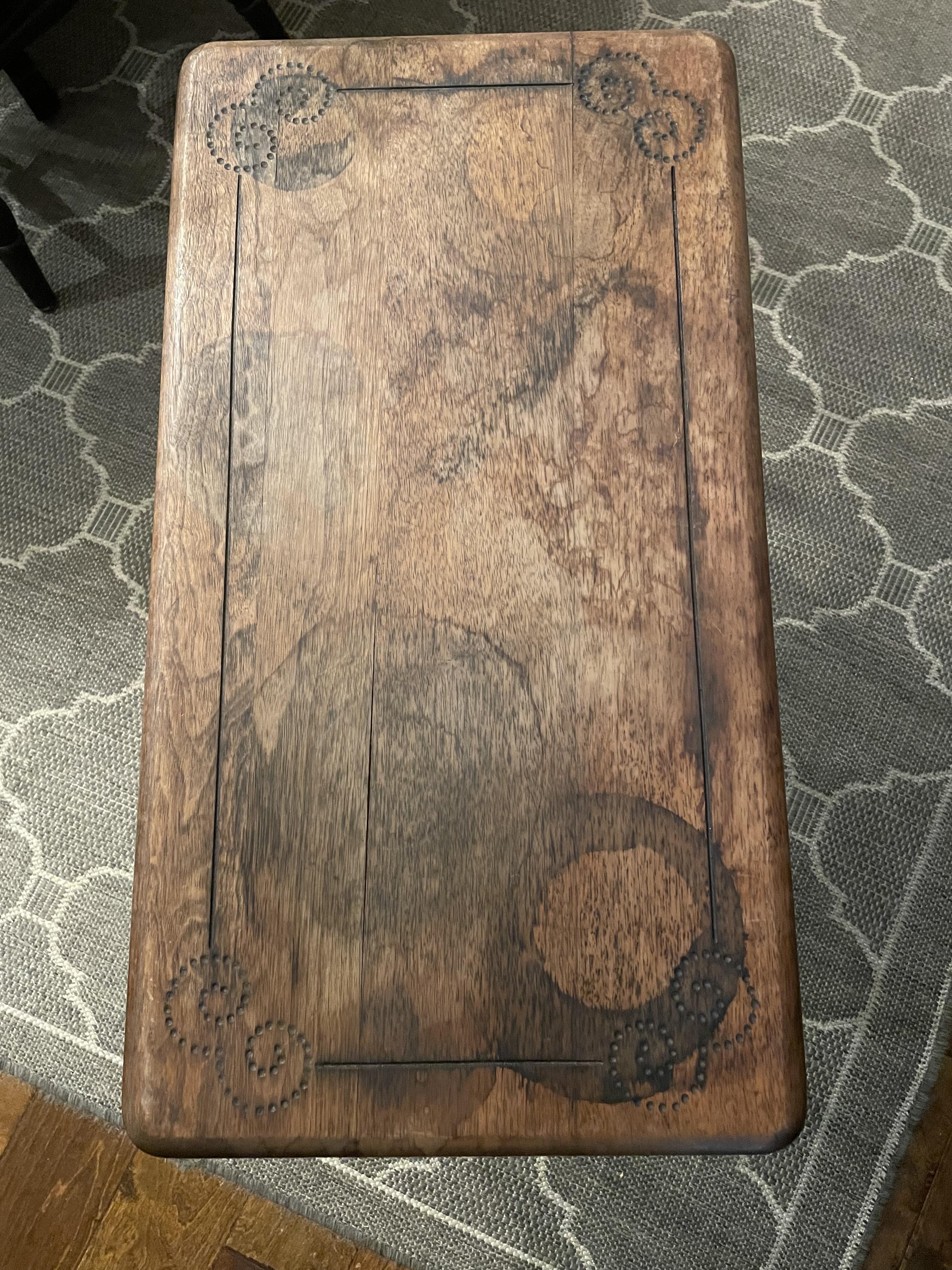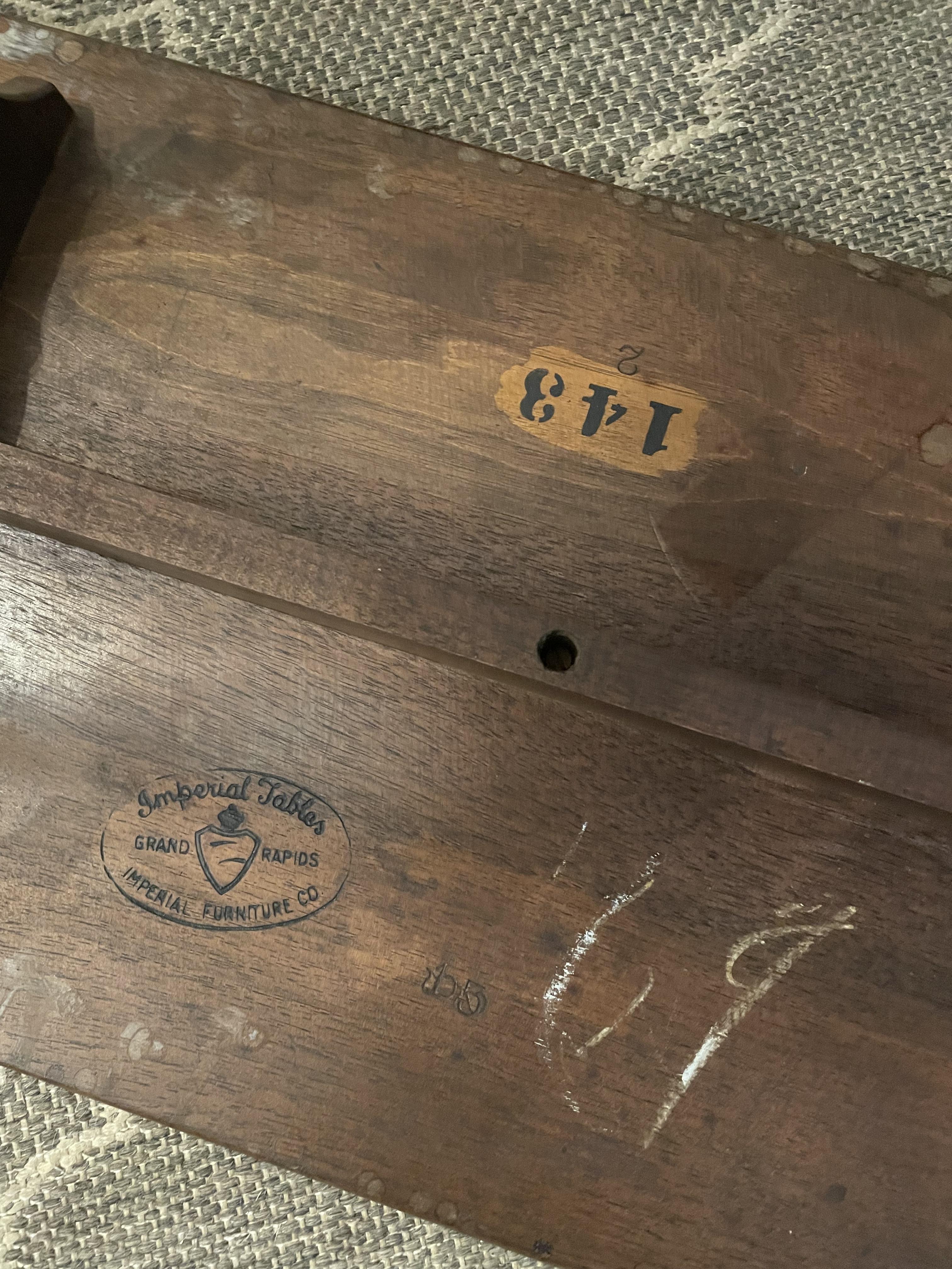 Imperial Furniture Co. Grand Rapids small side trestle table. In solid condition, no cracks or breaks. Some water staining.