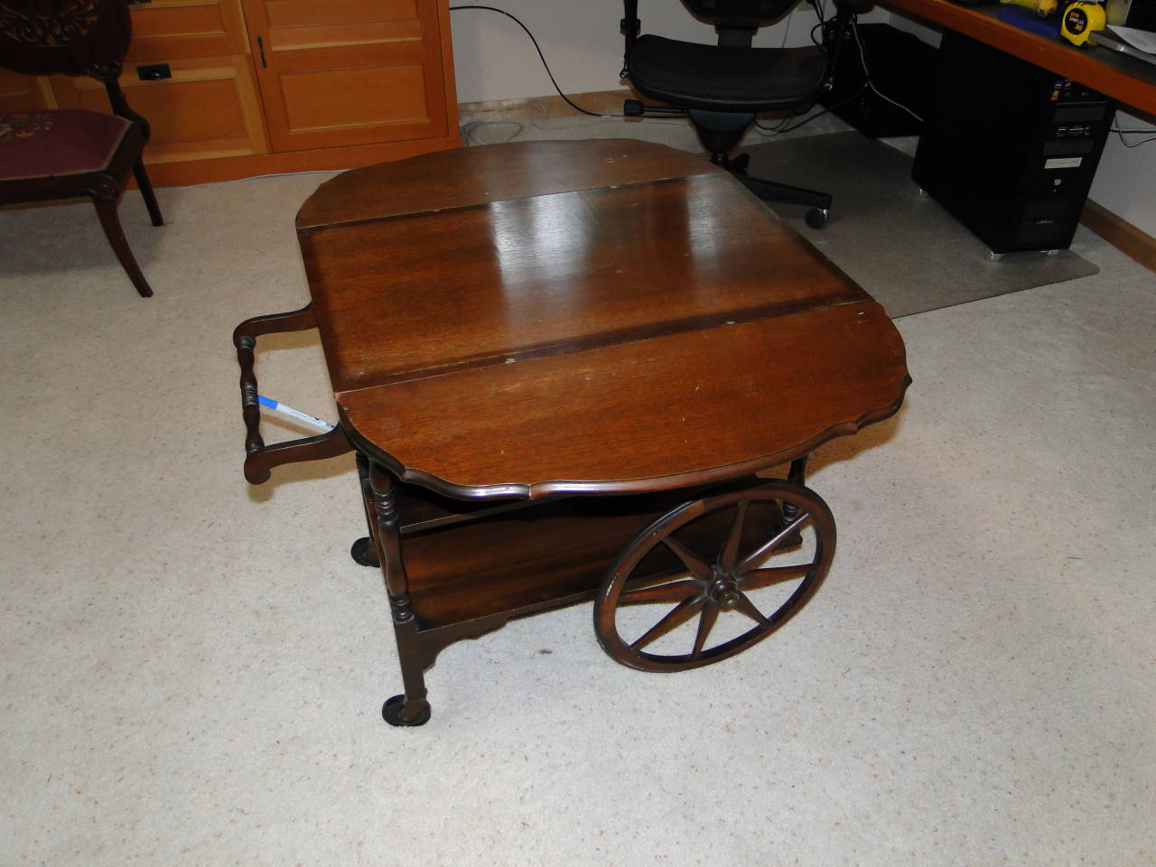 Tea cart has been in the family since at least the 1940s. Appears to be mahogany.  Large rear wheels, small front wheels, lift handle. Top glass tray with handles lifts off. Side leaves that lift with slideout supports. Three shelves. All original. Green Imperial Grand Rapids Mich sticker with red crown, black Made in Grand Rapids sticker.  Number 79 stenciled in paint blob and number 88 stamped in black.