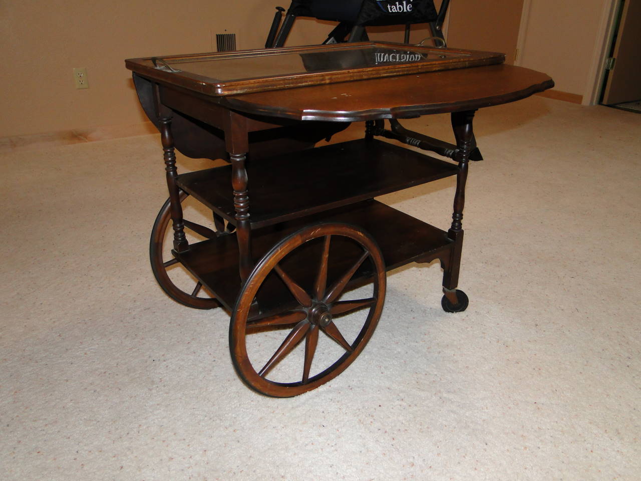Tea cart has been in the family since at least the 1940s. Appears to be mahogany. Large rear wheels, small front wheels, lift handle. Top glass tray with handles lifts off. Side leaves that lift with slideout supports. Three shelves. All original. Green Imperial Grand Rapids Mich sticker with red crown, black Made in Grand Rapids sticker. Number 79 stenciled in paint blob and number 88 stamped in black.