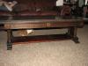 Leather top on center with gold scroll stamp around border. Two drawer pulls. Metal covers on feet. Not sure material (brass?)