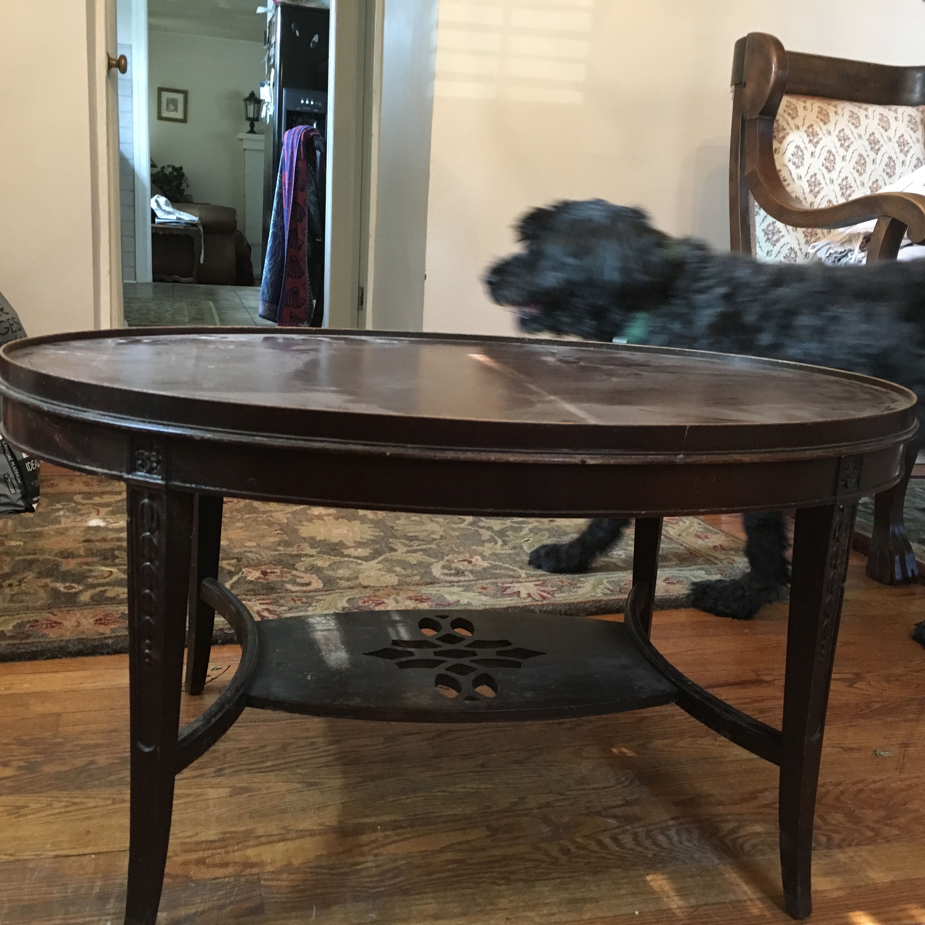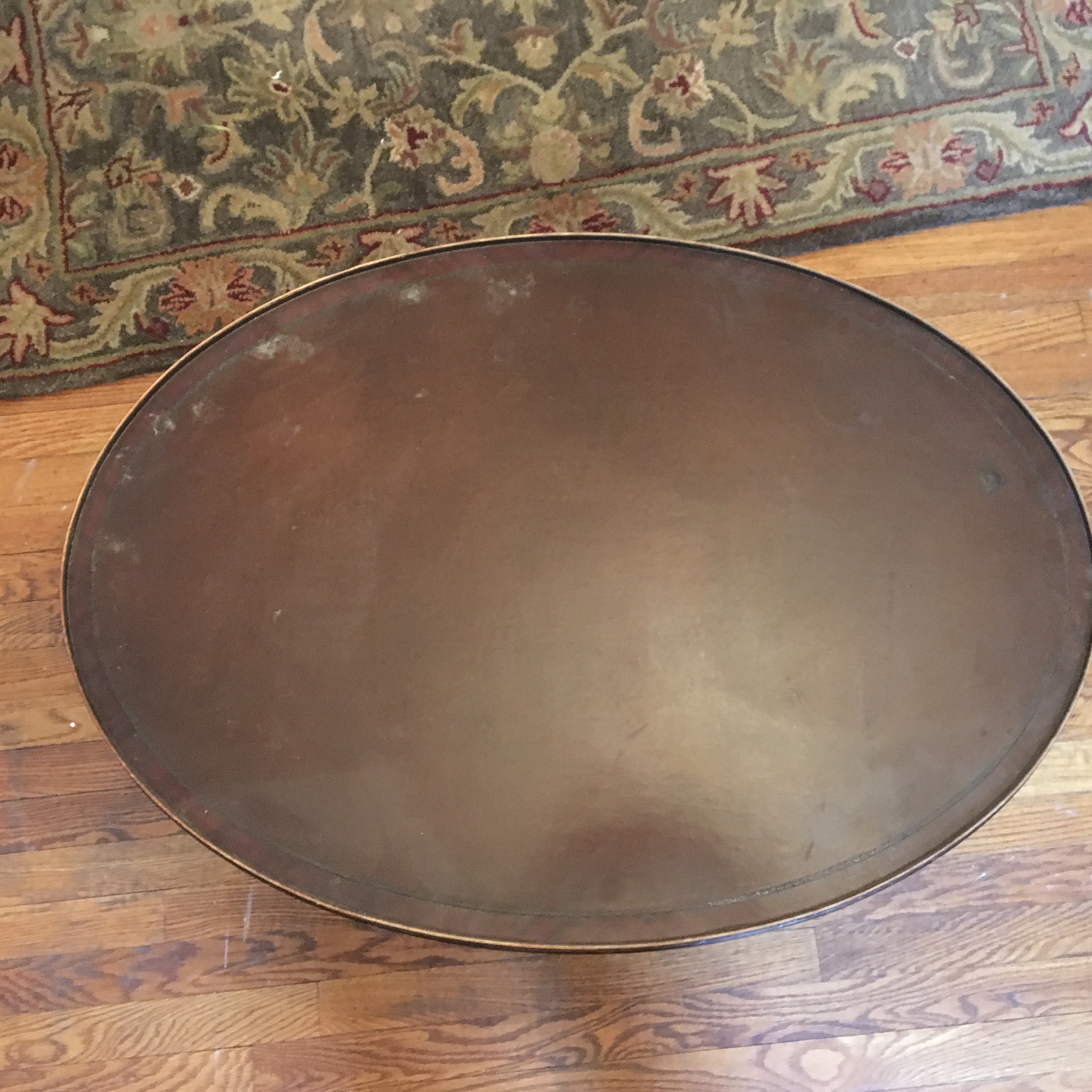 Oval coffee table with patterned design at bottom.  Leather top needs repair and legs are decorative, one inch veneer missing around the top..  Vandleigh Furniture, New York.