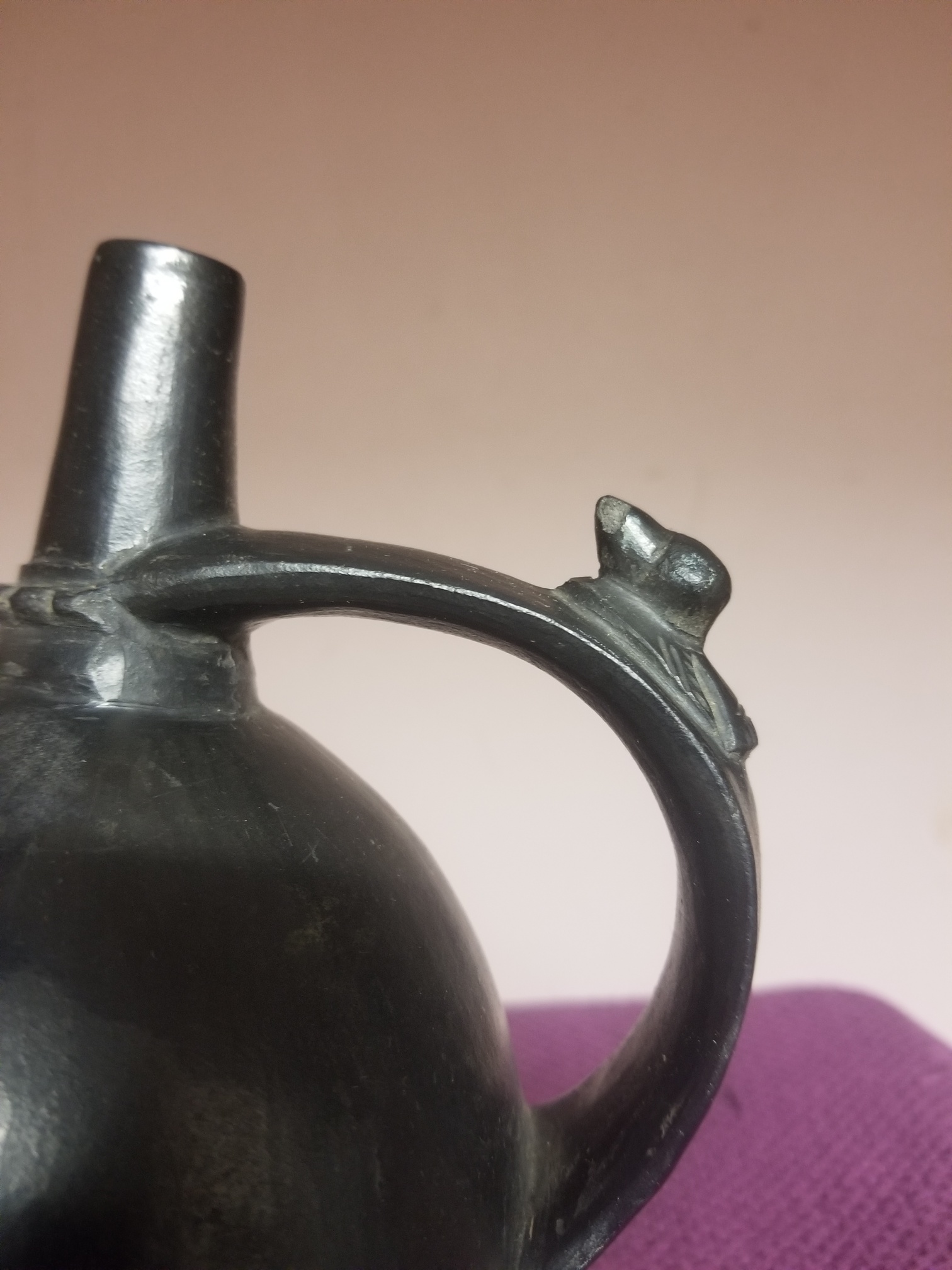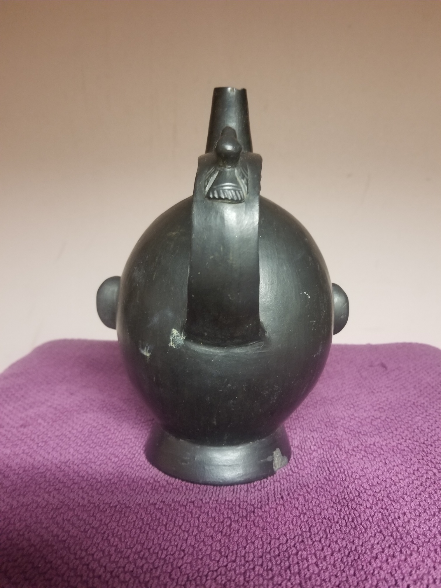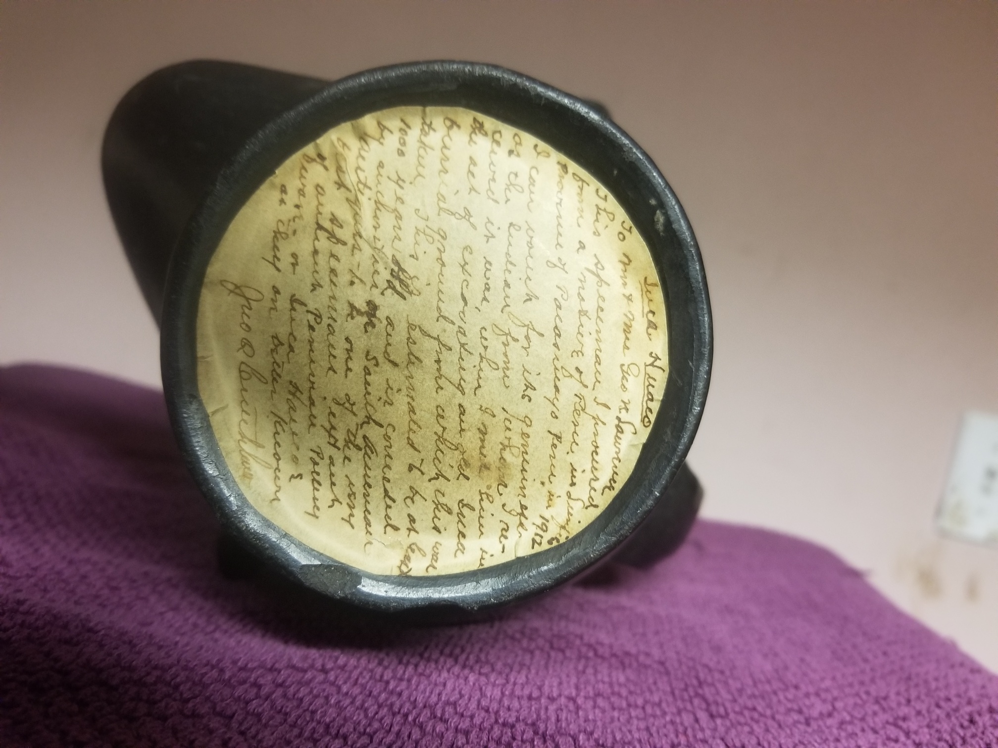 This specimen I procured from a native of Peru in Sienfic Province of Pacos Wayo in 1912. I can vouch for its genuiness as the Indian from whom I received it was when I met him in the act of excavating an old Inca burial ground from which this was taken. This is estimated to be at least 1000 years old and is concede by authorities on south American antiques to be one of the very best specimens extant of ancient peruvian pottery ware or inca huaco as they are better known.