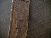 Inca Wooden /handle With llama carving. This Unknown wooden was Carved in The Early 1800's in South America> Dr. Beverly Smith Anthropologist from the University of Michigan Looked At This Wooden/ Handle With Carving say This is Early Pre-Columbian... 7 inches long and 1 1/2 inches wide with Broken end. This Wooden With llama Carving Has An Unknown Location Of Found. This Wooden/ Handle Seems To Be One Of A Kind. |