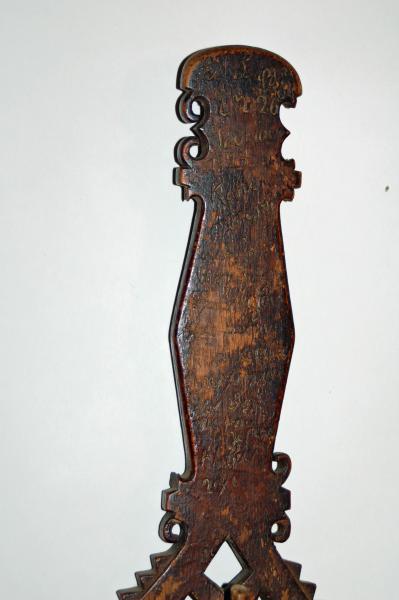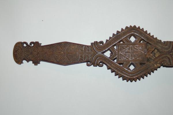 unknown, I suspect it is a ceremonial, processional piece, perhaps religious, although there is no overt religious symbols on this one. I have another which is not incised carved, but has a cross carved out of the stock wood.