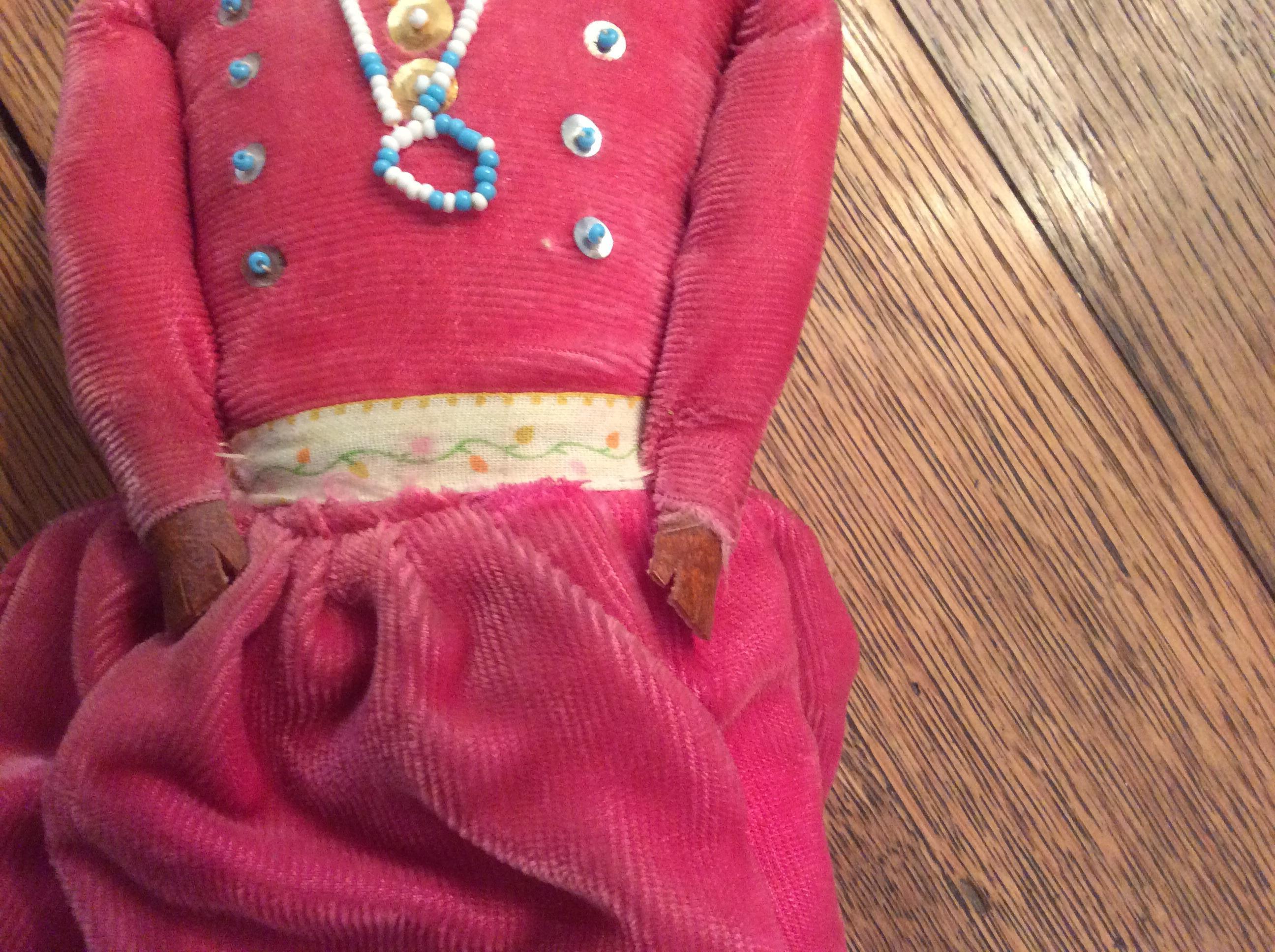 Indian doll. Soft courdury dress, with seed bead necklace and earrings. Hand painted face.
