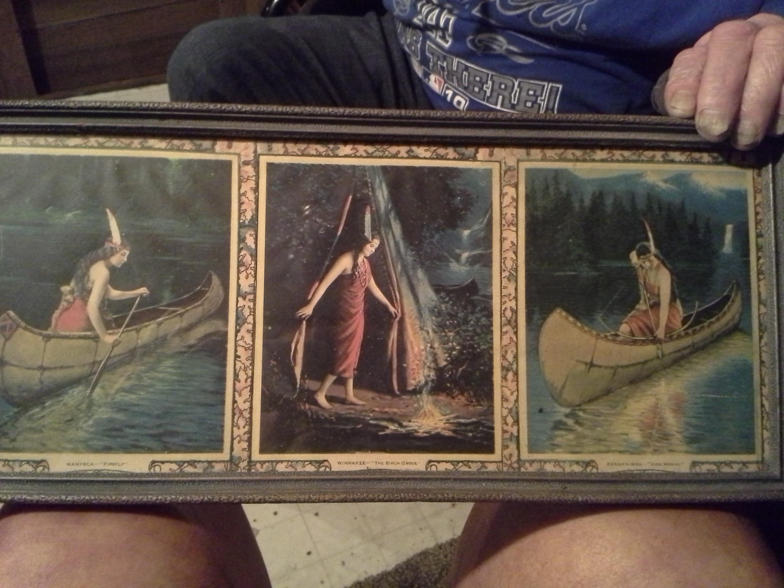 3 pictures of indian mainden in one frame the names are wanyeca-firefly    winnakee-the birch grove        sakaka-wea-bird women
