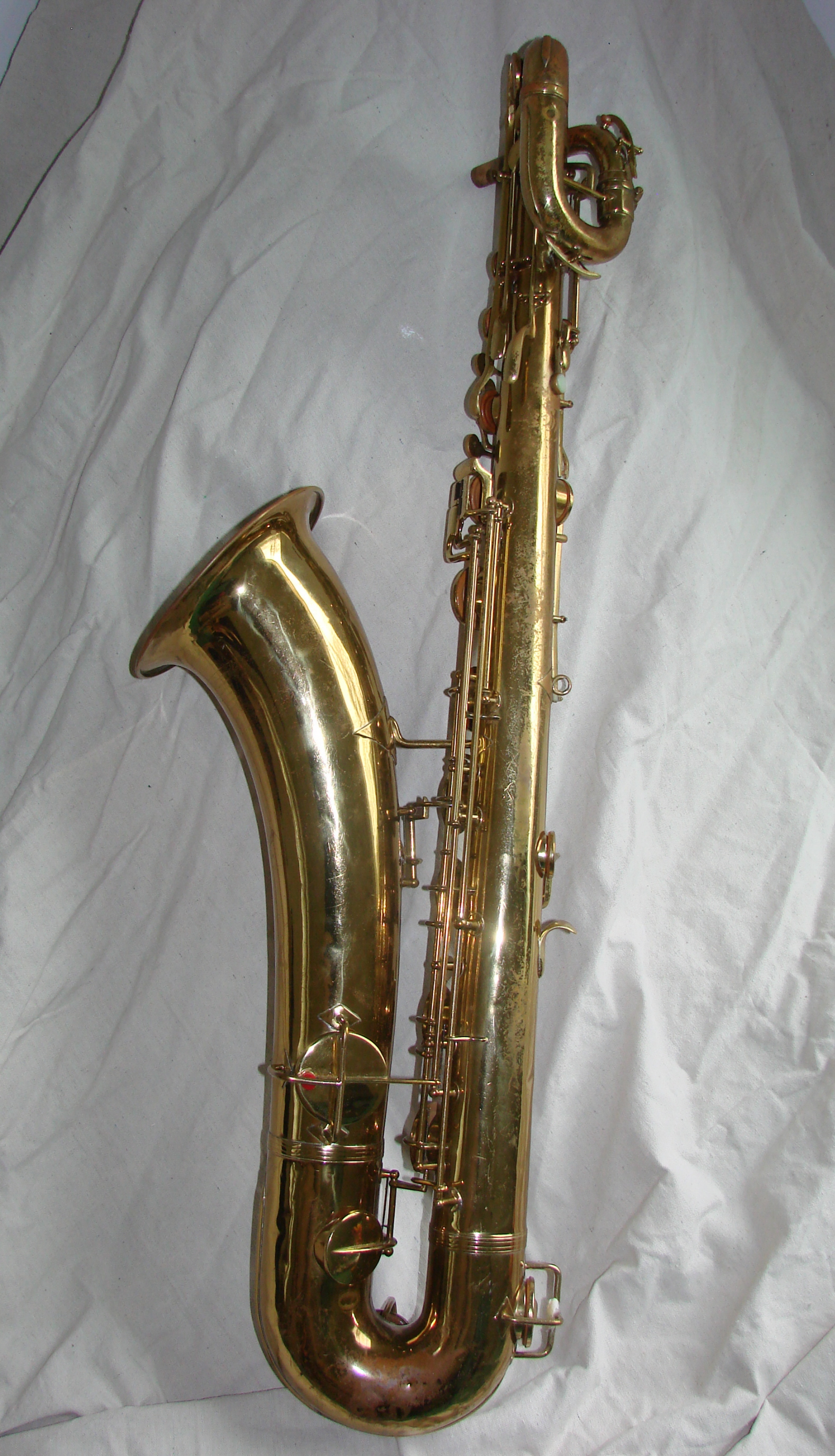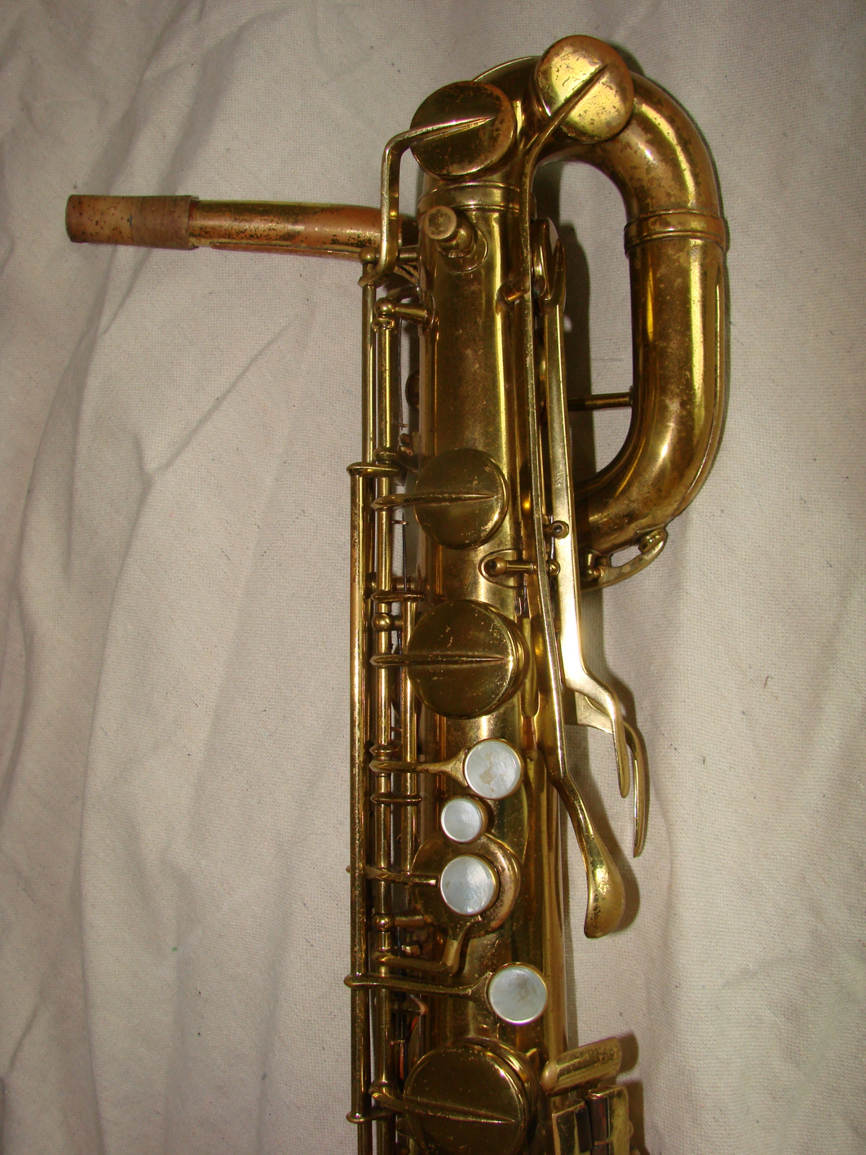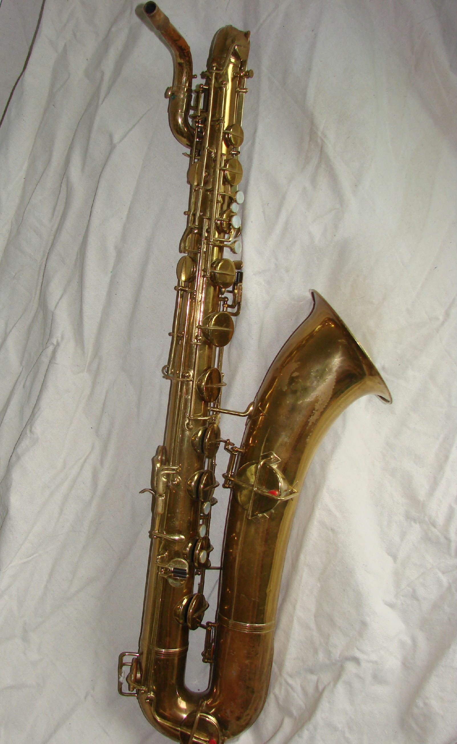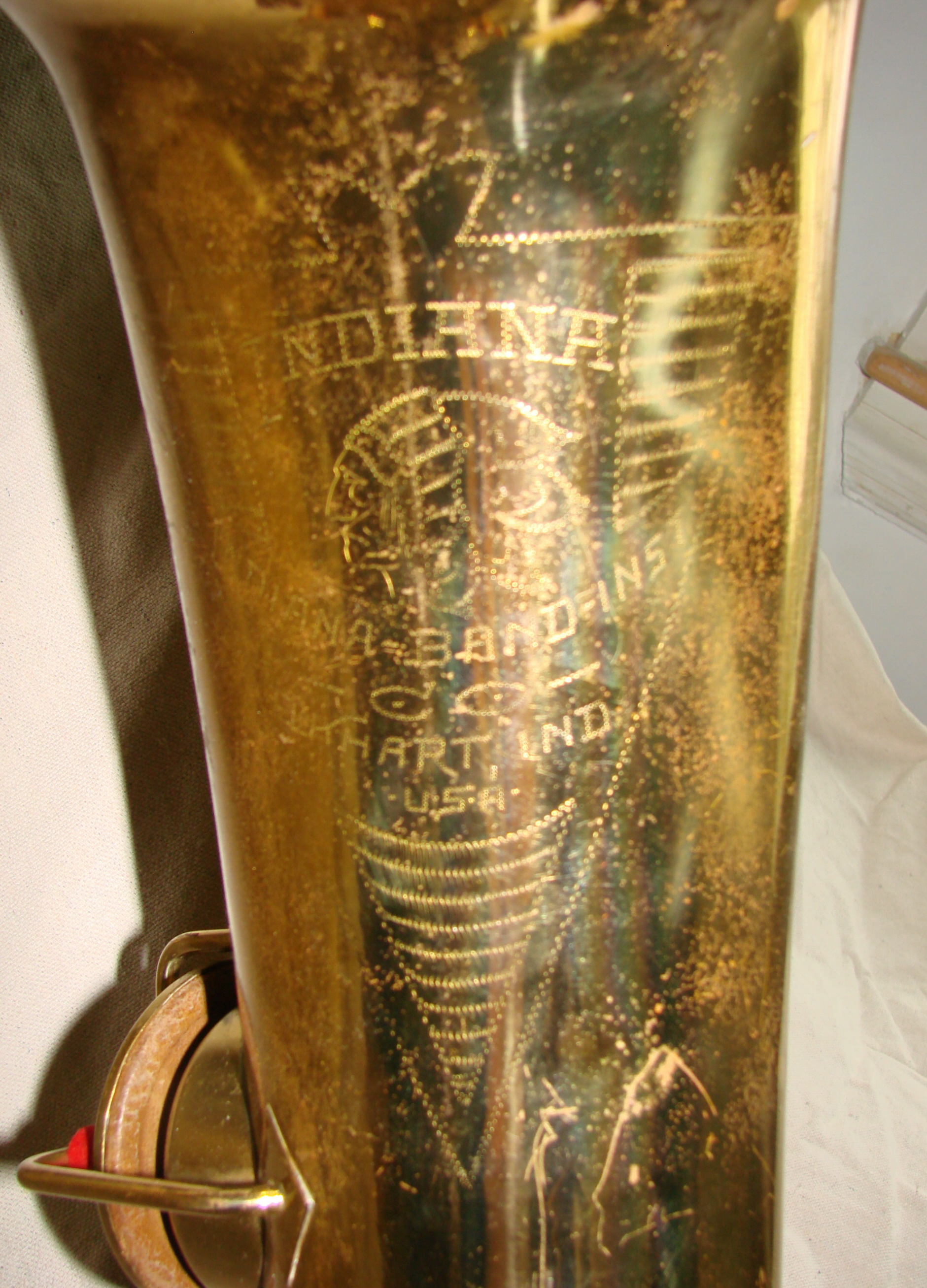 Baritone saxophone from the Indiana Band Instrument Company in Elkhart, Indiana. The instrument is an Indiana model with the number 13094 engraved on the back of the neck. Indiana is etched into the bell with an Indian head profile etched below it. Below the graphic is etched Indiana-Band-Inst in a rounded-up pattern and Elkhart, Ind. with USA etched below that. Some, if not all, pads are original. All pearl buttons and keys are in tact. The finish is spotty. A few minor dings, nothing major.